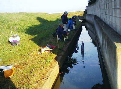 | 5月05日 | 鮒 | 黒部川→側高水路. 快晴 南〜南西風5→4, 27℃,中一中潮,満潮5:31 斉藤,弟,鈴木,岡部,松村, 昨年3月に若波本会で初めて入渓したホソで釣る。 当時は渇水と乗っ込み前で型を見ず.諦めた釣場だった。今回は大型がでると聞き出向いたが。 黒部川阿玉水門下流ホソ ホソどん詰まり田植えを終えた水田に水が張る。ホソは水位30cmと低く幅3m,葦が茂げ濁りあり。 6時,竿11尺,12尺,15尺,シモリ.袖6と丸セイゴ7×2.上鈎にグルテン1,下鈎に赤虫を付け,ホソ中央の深みに落とし込む。 風が強く竿があおられた。ドン詰まりは浅くポイントとしては外れている。 待つこと30分,奥よりに陣取り3寸,3寸,4寸,2.5寸と小ブが1時間の間に赤虫に掛かる。 ただ大ブナは現れなかった。乗っ込み後の大ブナを今日は狙っている。 中央が阿玉水門9時ジャスト,痛恨のバラシ。その後7寸がきた。今日最大最後のフナである。 ホソは流れがないものの藻が凄い。ネリも赤虫も絡み合い,ネリはバラけず更に食いを落としている。 田圃にはお玉じゃくしが泳ぐ季節になった。近年どじょうも居ず.頂点に立つ蛇も居なくなったとの事。 それでいて珍しく黒いヒルを見る。 9時黒部大橋下流,八丁面機場を探釣する。先のホソの幅は倍あり,幾らか浅いもフナはいた。 ただ一人でなければ釣れない浅場のフナ釣り.先客あり。 戻ると仕掛けは葦に絡みシモリを失った。それに比べ斉藤氏は今年のフナ釣果は凄い。他会を含めトップを4連勝中。 今も置き竿にフナ2匹を確保した。 傷ついたフナが多い。背側の大きく傷ついたフナは川鵜に襲われ呑み込めず吐いたのだろうか? 先日,土浦新川では数多く見ていたと云う。ここでも赤くただれた傷口のフナを何匹も見る。 側高水路 ヒバリのさえずる中.メダカ用のタニシを2,3獲り側高に移動する。朝方寄った時,カエルの鳴き声が強い風に負けず鳴り響いていた。 風を除けば薄濁りで.釣りにはよい条件と思われたが現実は厳しかった。 上流左岸吐き出し 左岸吐き出しより東関東高速道下げ潮の利きもあり水位が20cm程落ちている。斉藤氏のポイントに入るが,アタリはボラの稚魚のみ。 川面一面に群がる「おぼこ」はシモリの上玉だけを激しく動かしている。離れてはフナの波紋を見た。ただ1度もアタリなし。 この排水口だけは凹字抗もなく自然のままの畦の為,コイ,フナのハタキが他のホソより多い。 先週21日の釣行では大ブナが入り.バラしが多かった。今は浅く動かず,水が腐り掛けていた。 高速道下 高速道下より上流を望む 東関東高速道下のワイド12時半高速下へ。流れ弱く藻も少ないがフナのアタリ0。フナ竿13尺,赤虫×2で誘い釣りをする。 大鯉 13時大ゴイ48cmが誘いに乗った。鋭い引き込みに耐えると浮き出したフナ? 再び回り込むよう潜り込む。 脇の釣り人が私のタモを持ち,軽トラの農夫までが「コイだ上げろ!」と声が掛かる。 道糸0.8.外す積りが観客の声援を受け,両手で抱え込む。潜るコイを迂回させ,浮き上げさせては走り,張りを緩める。 そして張る事を繰り返した。何処から現れたか観客は5人に増えた。5分が8分と過ぎ,コイが力を弱くするまで竿を立てる。 農夫も「いいぞ!」。上がる頑張れと励ます。そしてとうとうタモに入った。腹がパンパンの重いコイが顔をだす。 1時間前に会った農夫はコイを持ち帰ったが,彼は要らないと言う。故,放流した。 側高はフナのアタリ0。フナ居るも口を使わなかった。農夫はまだ水路に除草剤は入らぬと断言するが,誰も姿を見ず。 暑い陽射しの中,13時半納竿した。 帰路,連休の渋滞もなくスムーズに流れるが,車はクーラーが利かず蒸す暑さを久振り感じた。 フナ斉藤16.弟5.松村5(7〜2.5寸).岡部2.鈴木1. 川鵜による被害 全国に87万羽居ると云う川鵜の被害が全国で拡大している。 国は狩猟鳥獣に指定しているも狩猟期間中は川鵜の指定を本年度より解除する事を決定した。 大井川でのアユ稚魚の被害は甚だしく,食後は指定地外に留る知恵をも持ってきた。 擬卵は手間が掛かり,ドライアイスによる川鵜の減少策も進んでいるが.特効薬がないのが現況だった。 この5.6年.関東周辺の河川は,川鵜による川魚の極端な減少をもたらしている。07.05.31.TBSニュース |