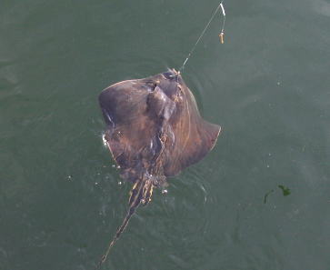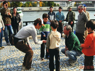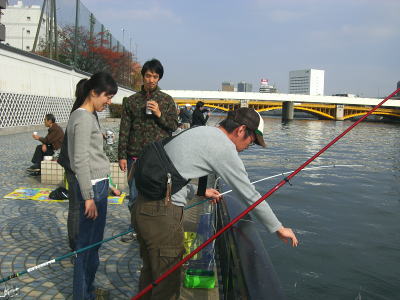 | 鯊 | 隅田川.蔵前右岸テラス, 第7回ハゼ釣り大会, 台東四町目町会,協賛台東区 10月07日,第1回会合,募集チラシを作成 18日,理事会でハゼ不調を報告するが決行へ。 11月14日,参加者集計45名, 18日,隅田川,小潮(一長潮)満潮11:50,よい人で1時間に13匹, 右岸東日本橋テラスで坂本氏他2名,計ハゼ16cm1束 21日,隅田川左岸鉄橋下でハゼ35,根掛かり多い 25日,神田川出合,型見るも小さく数伸びず。折原氏 12月01日,朝方釣人少なく,神田川出合で間々の釣り型は小さい。緒方氏 快晴,無風 今回も好天に恵まれる。参加者41(45)名,大釣りで,今年はハゼの醍醐味を参加者全員が味わう。 7時より1時間,大会前の試釣を試みる。小一小潮,干潮4:15,満潮11:14, 胴突きテンビン仕掛け金袖7×4,オモリ20と5,を付けている間に,緒方氏に16cm良型ハゼが掛かる。先行きがよい。 軽く投げ探りながら,一時置くと直ぐ穂先が引き一荷がきた。ハゼはいる,今年はアタリ年になりそうだ。 垂らしを短目にするとアタリあるも以外と取れず。それでも一荷が続いた。 仕掛け70cm,ハリス15cm,2本針で2本目の竿も軽く投げる。直ぐ掛かるも穂先のガイドが抜けた。 食いよくハゼのアタリは多い。絡まないよう投げ続けると又一荷がでる。投げれば必ず掛かるハゼ 14cm前後が中心,2本竿で交互に入れ掛かり状態になる。それも常に一荷である。 エサを付けるのが忙しく,時にはパーフェクト4本針に4匹のハゼも掛かった。1時間でハゼ29 集まった子供達 大物が釣れたか?潮が利き一時上流に流れるも,食いは余り落ちなかった。ヘチより4〜5m先でも子供達にハゼが掛かる。 先週までは神田川出合付近に釣人集まるも,今日は何処でも食いが立った。 下流側でエイが掛かり騒ぎだす。我が町会のメンバーだ。釣り上げねばと走る。 タモなく大きなビニール袋の両端をヒモで結び,救い上げるも間々ならず。 ギャングを持参した人を見付け借用,エラに掛け無事すくい上げた。10時早くも今日最大の大型賞がでた。 外道の王様,セイゴは今回は少なく小さかった。それに変わりハゼは何処でも釣れている。 型よくトップは山崎氏ハゼ平均15cm位78, ハゼ仕掛けに食い付いたエイ