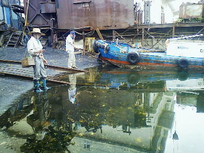 | 8月13日 | 鯊 | 子安第三小派川と第二派川. 曇後快晴 大一大潮.満潮4:35.干潮11:17. 辻山,駒田,緒方,松村 第三小派川.西ドック 釣り用に揚げて頂いた曳き船5時前.夜明けの朧な大気も霞み.久し振りの雲天に聡明な明かるみが造船所ドックの周りに現れた。 蒸す暑さもなく心地よい朝を迎える。 年毎に造船所の台船は少なくなり第三小派川では1/3。台船は昔の半分も占めていなかった。 エビス本流沿いは尚更少ない。その変わり大型船が何隻も横ずけされている。 満潮の下げ.まだ利き始めだが西側ドックより初竿する。竹竿9尺,鳥ウキ3,金袖7×2,オモリ0.5,アオイソメ。 波打ち際に立っての釣り。食いは潮の割りに浅く,寄り付く程のアタリはない。前日は食いが悪かったとの事。 その言葉を聴けば間々の釣りとなっている。誘って誘っての釣りであるが食いはあった。 11cm前後のハゼが顔をだす。型は時期的には侭の型である。艶があり飴色の美味そうなハゼ。 今回はドックに修理船は入っていなかった。広い空地に蚊が多い。半ズボンでは立ち込む以外なかった。 そして浅場での引き釣りを想い,針,エサを共に大きめにし.引きの醍醐味を楽しんだ。 今年は浮き藻も多い。カラス貝の中を引くと藻と貝殻が仕掛けに絡む,時間のロスも多い。 何時もの砂地,レールのカケアガリ付近がポイントになる。 ドックの主が釣りに邪魔なクレーンを動かし,船を曳いてきた。立ち込まず船から釣れと。何と心温まる行為ではあるまいか。 ただ時間が経つも入れ掛かりは少なかった。よく見るとハゼはいる。ただ食わぬハゼ。 背ビレや腹と邪道で掛かるハゼは多い。丹念な誘い釣りで9時までに1束強。 型は云う事ないがヒレハゼは1匹も掛からず。外道はダボハゼのみ。それでいてダボは例年になく少ない。 台船橋下もポイント。ロープの絡みさえ気を付ければ食いはよかった。一回り大きなハゼがいる。 小休止後,波打ち際になった貝殻帯を嫌い.完全に引くまで本流へ出向いた。 第二派川常陸橋周辺左岸 常陸橋下流でK氏強い陽射しになり常陸橋左岸坂下で竿をだすがアタリが急に落ちる。干潮まで全てが中途半端な状態となっていた。 誘い疲れて型を見るパターンが続く。 対岸に移り,元組合長の槙野氏と再会。 竿をだす前に左岸.橋下から高速道上流側,柱下の間を試みろと助言を受けた。それも騙されたと思い竿をだせと。 間々アタリは増えるも川中央の砂地,竿9尺では目一杯の釣りになる。アタリもノリ以外取れず。 初鼻は今日最大級の黒い歯のあるハゼ16cmに出偶わした。槙野氏から周期的に増えるダボの合いのこだと聞く。 アタリはあるものの.それ程ペースは取れず。駒田氏と我慢の釣りをした。 釣り船 槙野氏から船に誘われた。それも「乗れ!」の一言のみ。 エンジンを停め竹竿で探る事50分,好意ある船釣りを楽しむ。 ポイントは槙野氏が今朝,マゴチのエサの為50匹を釣ったと云う所。そこまでの流し釣りは今一だった。 船頭の手前釣らればと気は焦るが浅いアタリが続いた。私は船頭との会話がメーンとなる。 水深1m弱,袖7が大き過ぎるのか? 駒田氏は袖5で食い始めていた。ポイントに入り食いよくなる。 場所は左岸坂下から3本目の柱の間に当たる。3年前に釣ったポイント,船頭はここで昼食リタイヤで降ろされた。 奥よりヘチでアタリだす。澄んだ水を切り,幾らか白み掛かった綺麗なハゼが姿を現わした。ハゼ1束弱. ドックに戻る。先に戻った辻山,緒方両氏も食いだした模様。時間は干潮の底になる。 一昨年も下潮で一時の中断があったが,今回も食いが戻ったようだ。 12時.陽射しが強くなり,辻山氏の体を考え納竿した。 昔を想い参加した辻山氏。まだ釣りたい希望があるが,緒方氏は輪を掛けバテ気味。 ドック現場監督と元組合長の槙野氏には感謝に耐えない釣行となった。 ハゼ8〜16cm,平均10cm2束, 早揚がりでアオイソ4杯中1.5杯残 |
