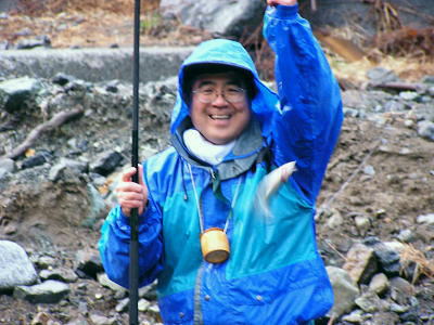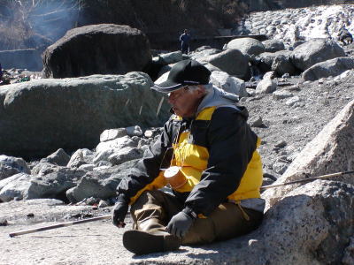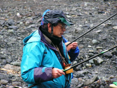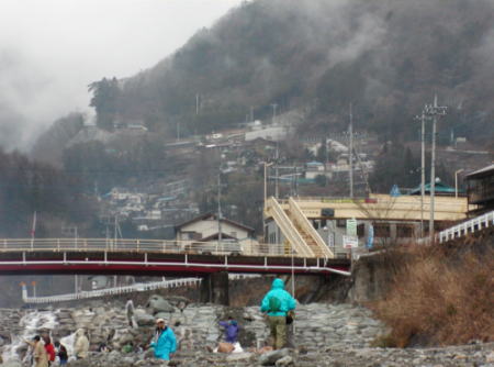 | 3月11日 | 岩魚 | 芦安.釜無川水系御勅使川. 小雨後晴 美濃羽,星野,斉藤,松村 第4回南アルプス市芦安渓流釣祭り 今年の芦安は全く残雪が認められなかった。鳳凰の降雪が激しくなるのは例年1月末から3月に掛けてになる。 芦安では1月5日の降雪が最後で.その後の積雪は減る一方で見られなくなっていた。 例年以上の暖冬は夜叉神峠まで車が入れる異常さ。ただ峠越えは林道の崩壊が激しく7月下旬になる見込み。 寒さを感せず2時,芦安に立つ。市の予算が極端に削られ,今年は河原の駐車場もなく,渓相は全く変わっていた。 源流に積雪が認められないせいか沢幅は狭まり,浅くポイントを探すのに苦労する。 3時.小雨はみぞれに変わった。右岸に移った本部,焚き火を囲むベンチに雪が積り.酒と火が恋しくなる。 上流から下って来た車の屋根には雪が積り,白さを増していた。 急に気温が下がった日陰の谷.日中は雨に打たれ寒さが身に沁みる釣りになった。 上流を望む芦安の集落初竿 6時半.本部前,仮渡り橋下.小さな落し込み淵下に川幅6m長さ8m程の淵がある。 深みは申し分なく浮石が流れを巻いていた。左岸に陣取り長タモラジオペンチ,替えバリを用意,初竿する。 竿15尺.目印3.先糸1m.と18cm程のヤマメが姿を現す。小さ過ぎる魚.引き込みは間々ある。 大イワナ 2投目.落とし込みで直ぐ,大きく竿が曲がり,走りだした尺イワナを両手で持ち,耐えるようヘチへと誘いだす。 ヘチへ引き摺る込めると考えたのが間違いだった。跳ねたイワナは痛恨にもハリスを切る。 H氏と食いはよい.40分が勝負。同じ場所に1投,2投と仕掛けを振り込んだ。いい調子にイワナ,ヤマメが掛かるが型は小さい。 どれもが20cm弱。呑み込んだハリはが以外と効果をあげた。早く外れ都合がよい。 再び弓なりとなった竿,待望の尺マス40cmは確実にタモに入る。その後の大イワナは凄かった。 両手で竿を支えるのが精一杯である。淵を大きく暴れ回る。姿を現しては潜るイワナ,タモが取れず。 助けの星野氏に頼み.2度目で45cmを取り込んだ。 落ち口での大イワナ1,大マス3を含め,1つの山場で10匹以上を確保する。 後半はブドウ虫でイワナ1匹釣り上げるもイクラがダントツによかった。 一息つき朝食を摂る手がかじかみ震える体に霧雨は止んだ。雲が切れ蒼空が頭上に被うがまだ陽差しは当たらないでいる。10時 熱いケンチン汗と熱燗が体を暖めた。 賞 星野氏に検量を勧められる。大会で大型から順次賞品が付く。今まで私には入賞がない。 昨年も名は呼ばれるも外されていた。 今回は大型イワナを確保.薦められるが釣りをする事が勝っていた。 斉藤氏がイワナ20cm強で飛び賞10位。私は間違いなく3位以内に入賞したと.星野氏は何時までも嘆いていた。 移動 魚は急激に食い気を落す。直ぐ上の淵に移動するも.8流し目で1匹程度となる。 他の太公望達も竿数の割り.揚がる率は低くなった。 食い渋りの中,熟練者は釣果を伸ばしている。釣る動作に卒がない。仕掛けを繊細にイクラは1個と助言を受ける。 先糸1m.道糸0.6.小さな針はマメ5しかなく.イクラ1個に仕掛けを替える。 丁寧に流し少し遅めに誘い,淀んだ所で間を開け誘う。見事にヤマメが掛かりだす。どれもが上アゴに掛かっている。 型はヤマメ.イワナ.共に20cm弱。間は長くなるも周りの釣り人を抜き,ダントツに拾いだす。 16cmは放流した。塵も積もればで数が10と伸びてきた。 下流,1昨年の場所に偵察にでる。夜半に覗いた淵は土砂に埋まり以外に浅かった。ライトでは分からぬ深さである。 ポイントを変えたのが幸いした。今回のポイントは本部前と昨年.一昨年の場所,日中橋下となる。 星野15.斉藤15.美濃羽10. 松村25.岩魚11.山女魚8.虹鱒6.(イワナ45cm.マス42.40,38cm.平均18cm) 今年は星野氏の友達も参加し賑やかな釣行となった。コンロを囲み彼等もよく呑んだ。 酒が呑めない美濃輪氏には申し訳ないが.午後には陽も谷に差しだした。 5千匹の魚型は昨年に続き20cm弱と小さ過ぎた。その為か参加者も少なく,規模も縮小したように思える。 東京は10時出発で道糸0.4とヤマメ5以下を持参するとよい。 交通,入漁料,食事,風呂@350,等含め¥12500 快晴の中.山を下りた。裾は梅が満開.聳える富士は秀麗さを保ち,奥秩父の頂稜は雪が少ない。 釜無川を隔てた八ケ岳連峰は雲が被るも裾野の雪は乏しく.残雪の岳を思わせられた。 H氏のいい顔 炊事?に精を出すS氏 お疲れ様.M氏天気 沿海州の低気圧(984hPa).寒冷前線が03〜09時にかけて北陸〜北日本を通過。 一方,関東の南にも発達中の低気圧(994hPa)で上空に強い寒気が南下.芦安にも疎らながら雪が舞う。 次第に冬型気圧配置に移行.雪が少ない北陸地方を中心に山雪型の降雪となった。 2日間で湯沢,藤原等の降雪量は1mを軽く超す。関東は例年の冷温に戻り,東京は最も遅い15日に初雪を記録した。 エルニーニョ現象が治まり? 例年の冷え込みが戻りだす。 11日.新川,境川フナ釣り. 境川石田のホソ,新川上流以外0が続出,浅草釣遊会 18日.新川,境川フナ釣り. T斉藤,新川カラオケ前9寸,5寸を含め12, 2