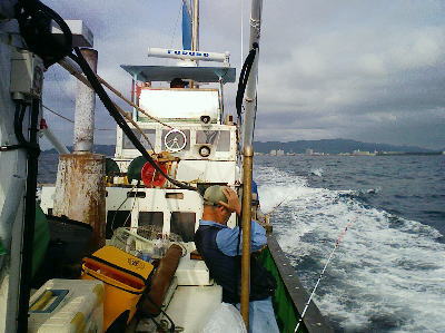 | 9月16日 | スルメイカ | 鵜原,まさえい丸. 曇後晴.南西風3〜5.波→0.5〜1.0 左舷.松村,小林,安部, 右舷,安部,折原,船頭,友江 魚種はスルメイカ.今の時期イカ釣りは余りよくない。スソは1桁前後前半の釣果,竿頭は20杯台が続いている。 キンメを狙い鵜原港を3時出船の予定で1時半東京を出るも,ウネリ強くキンメは中止に。 出船 まだ真暗闇の海原にでる。南西の風波が細く裂かれ,小さなウネリに「まさえい丸」は船首を沖へ向けた。 夜明け前の暗い層雲が海原を覆い,右舷は更に暗黒の海をなしていた。 左舷左前方には幾らか夜明けの兆しを示し.その境を船は突き進む。 陸を見るに闇に包まれた勝浦の町並みが街路灯の明かりに遠く煌いている。 そして右手前の闇に陰る半島台地には灯台だけがその灯りを放していた。 昨年10月以来.本年度初めての釣行になった。もう中止する事はできない。 メンバー不足を折原氏の業界仲間「マル金」さんの仲間の参加を得て,今回は決行されている。 彼等は土曜日に乗船しているが.土曜はイカ釣りが今だ協定で禁止されている。その為張り切っていた。 中一中潮,満潮7:21.澄む近海 4時25分出船,近海の勝浦沖水深150mで試し釣りするもサバのアタリすらなかった。 全員がツノサビキ及びフラッシャーサビキで望むもが船中アタリ0。 船頭の予想は外れていた。即近海を諦め全速力で更の沖合へ,時間は5時を回ったばかり。 ウネリは更に強くも私の釣座,左舷は風下にあたるが南西風は意外と弱かった。 沖へ 走る事40分. 5.6隻の遊漁船が早朝より底釣りを始めていた。今日は勝浦の祭,休船が多く海上は疎らになっている。 水深180m.底釣りと同じポイントとなり,正にヤリイカと変わらぬ釣り方になる。 中オモリ.玉型ツノ18cm×5,幹糸8,ハリス6.オモリ150で竿をだす。 水平線を覆う層雲の中からの陽は昇り,一段高い積雲に太陽は再び潜り込むが,周りは明るさが増しだした。 右舷はヘラ状ツノ仕掛け,赤に一流し目からイカが掛かる。掛かると云っても1杯程度であるが。 左舷は濃いツノが多くアタリ0が続いた。3,4投目から掛かり始めるも船中の釣果は悪い。私には全て青か,濃い青ツノ。 バケツに少しずつ貯まるも,全てが底釣り状態に陥っていた。外道も今だなし。 今回は僚船の情報も祭で期待できなかった。 だらだらで薄い層のイカ,仕掛けを替えようとすると掛かるイカ。まだ釣果は2時間で7杯と低い。 流しを繰り返し,更なる沖合水深130〜150m中層下で食いだした。右舷を見習い魚型ツノ18cm×6ハリス共6に替える。 改めて初竿するも125mのクッションで道糸が切断された。まだ新しいEP6である。昨年購入し今年初めての使用。 切れた道糸が海面に漂う中.仕掛けからオモリ全てを失う。 9時.泡入りヘラ型ツノ18cm×6,水深145mで停め.ゆっくり誘い上げると重い反動が返ってきた。 慌てる事なく更に誘い上げ一荷。続くアタリも145mできた。赤と青,前半より重い吊り上げでリールはうなる。 一荷と思うも型違いの大きなスルメイカが顔をだす。 次の流しでは150mで道糸が止まった。シャクリ上げると又もや重くなる竿。誘って一荷。そして1杯とペースを取り戻す。 ここは後20分も走れば大陸棚にでる所である。 終盤となっても130〜150mがポイントとなる。ただ誘いがズレてきた。誘い上げて一荷の筈がバレ始める。 道糸が止まっても同じ事を繰り返し,一荷どころか1杯も釣り上げられなかった。 欲のだし過ぎか? ツノのツメは伸び,足が確り残っている。 又重い引きにズキ当るよう暴れバレるイカもいる。一荷を落す率も多くなる。 一流しに1杯は仕留めるが.後味の悪い納竿となった。11時45分, 小林4,安部10,安部15,折原8,友江25, スルメイカ22〜38cm15,全員外道なし, |