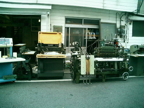 工場前に並ぶ製本機械