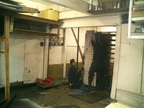 玄関より正栄.マッハ全自動折機の搬出