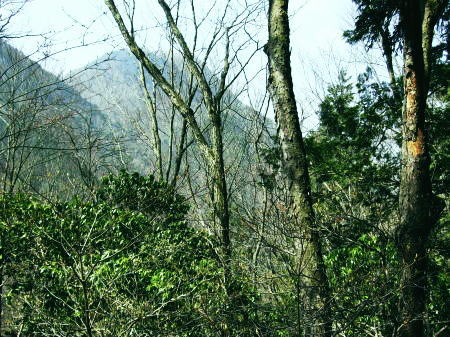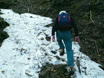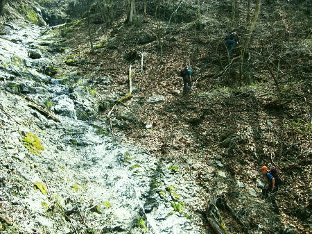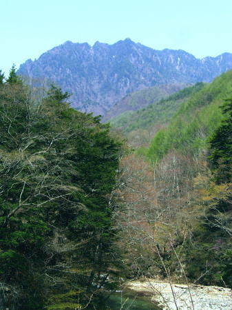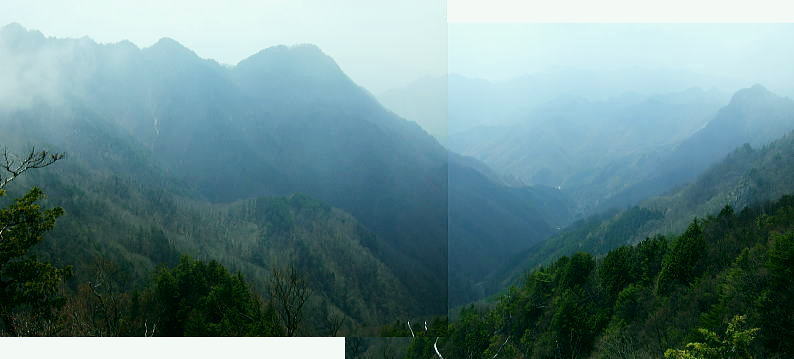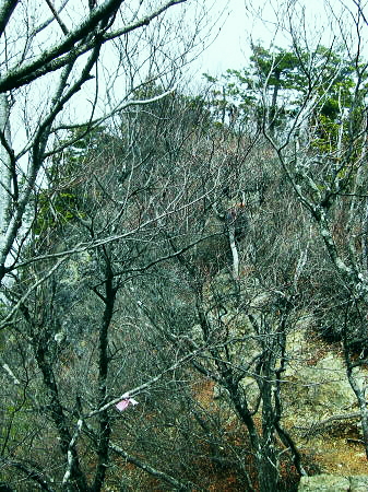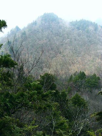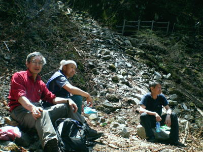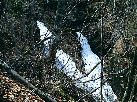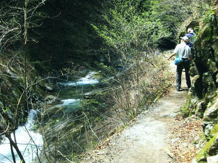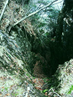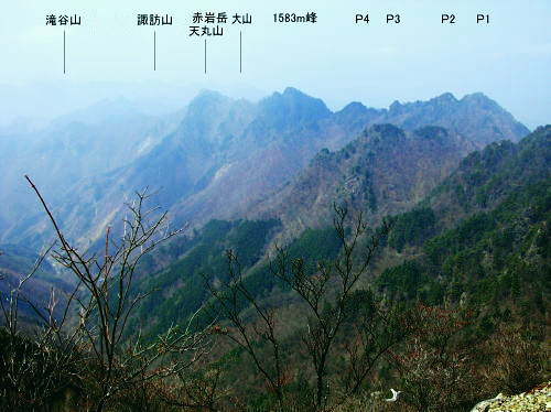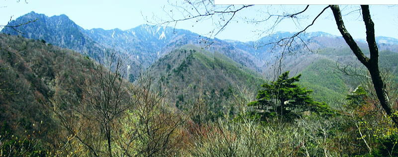 | 北秩父最奥の山.両神山U・・北秩父両神山Top 両神山ルート図 両神山と大鹿野の宿・・西沢渓谷とほったらかし温泉 中津川神流川の金山沢右俣左沢から右岸杣道を経て八丁尾根を周回. 翌日西沢渓谷を散策周回 2008年04月29〜30日.L松村m見城.滝島.鈴木 4.29. 落合橋より両神山八丁尾根を周回・・大鹿野町「須崎旅館」 4.30. 西沢渓谷から「ほったらかし温泉」 両神山金山沢二俣 見城先輩の希望により那須「三斗小屋」に入る企画を立てたものの20日現在.宿は閉鎖され.開業は連休前になる予定。 大変な混雑になる見込み.又以前訪れた鬼怒川「日光澤温泉」は残雪に埋まり冬山装備一式が必要とのなる。 滝さんの提案で昨年に続き両神山へ出向く。北秩父山域は秩父市の北.荒川左岸の山々を呼び.「北武蔵山域」とも呼ばれている。 前回は東面の小森川薄川沿いの昔からの参道(登山道)を歩んでいた。それ故.今回は新たなコースを模索する。 マイカーで入る以上は西側の裏からのか入山をわざわざ選び.神流川金山沢右岸の杣道の直ルートを取り.八丁尾根をヴァティケーに周回することにした。 己ながらよい企画ができたと思っていたものの.下山アプローチでは崩壊した林道に出遭い工事中で通行止で大鹿野町の宿まで周回できず. 再び往路を戻ることになったのが残念だった。 4月29日.晴霞み強し 西武池袋¥750. 6:05=6:25所沢.特急¥510. 6:37=7:45西武秩父.集合8:00=滝沢ダム=9:00神流川金山沢.落合橋:15. アプローチ 西武秩父駅で待ち合わせ.高校の時以来40年振りに新宿から西武秩父線に乗車する。懐かしい響きの吾野・正丸峠を抜け秩父に入る。 2005年08月に妻とマイカーで両神の山湯に浸かろうと出向いている。その折は滝沢ダムは施工中だったが.水瓶は既に満たされ完成した姿を見せていた。 湖畔道も中津川沿いのダム工事を終え.3年前に妻と訪れた時に比べると見違えるほどゆとりのある立派な道路に変貌させていた。 秩父市道大滝幹線(通称.旧中津川林道)として県境の三国峠へと綴られている。 秩父多摩甲斐国立公園内の秩父側の市道で.埼玉県と長野県と結ぶ唯一の車道。峠を越えれば信州梓山へ。 越えると千曲川の源流で信濃川上にでる。昔新人養成で幾度か出向いた山域. 林道の大改修がなされれば国道の昇格もあるだろう。 我々は右折して中津川支流の神流川源流へ向かう。中津川林道の起点.神流川出合を直進すれば中津川三国峠の終点に至る。 日窒鉱山跡地 長く連なる巨大な旧鉱夫の集合住宅宿舎跡.15:25林道金山志賀坂線 路線バスの下車地点.神流川出合で中津川本流と分かれ.右折して急に狭まった林道上野大滝線を走る。 同期鈴木のマイカーが2時間強の車道歩きを省かしてくれている。 この林道上野大滝線は広河原沢沿いに上武国境の天丸山東側の隧道を潜り.西上州へ抜ける予定の工事中の広域基幹林道へ。 又荒川神流川は中津川支流の1つだが同名の河川が直ぐ傍の西上州側にも流れている。 上信国境の十石峠を源にした神流川が上野村を横切り利根川に流入.三国山からの上武国境尾根を分けている。 神流川を遡り.左に再び上野大滝線を分ければコンクリートを吹き付けた昔のままの手堀りを残す雁掛隧道を潜り.最後の支流大倉沢にでる。 直ぐ日窒鉱山秩父鉱業所があり通称金山にでていた。昭和40年代の鉱山全盛期は別名「鉱山道路」とも呼ばれていた。 中津川小倉沢(日窒秩父鉱山内)を起点に林道金山志賀坂線に変わり.林道は両神山の北西に続く西岳の稜線下.八丁隧道を潜ると 上武国境にある諏訪山の埼玉県側の山腹を横切って.国道299号線の志賀坂隧道口と結ばれていた。完全舗装の林道. 左に折れれば峠越えして天丸山を回り込み神流町へでて.次を右折すれば小鹿野から秩父にでる。 この林道の途中には今回目指す両神山の西側の経路の取付きに当たる落合橋にでる。又その先を登れば八丁峠に立てる。 そして下山はこの林道を完抜し小鹿野の宿に向かう予定でいたが丁度土砂崩れの改修工事に突き当り戻っている。延長14.420m. 秩父鉱山 戦国時代.武田氏の金鉱開発が初めとされ.昭和に入って最盛期には金.銀.胴.鉛.亜鉛.鉄などを採掘されている。 古い面影を残す鉱山宿舎跡は馬鹿でかい。崩壊寸前のガレ崩れる木造宿舎が沢沿いに建ち.脇に小学校校舎と広い校庭があった。 校舎は山の中とは思えぬほど大きい。当時大勢の家族がここで暮らしていたのだろう。古き時代の繁栄していた面影が随所に望まれた。 日窒鉱山はまだ一部開鉱されている。現在は主に大理石を採石し石灰岩も見られ.最盛期には1200人近くが石灰・マンガンなどの採掘をしていた。 車道脇には白岩の細かく裂かれた岩屑の山がうず高く積まれていた。その脇に懐かしさを注る郵便局が昔のまま残されている。 金山沢二俣を起点に両神山八丁尾根をピストン 中津川神流川の小倉沢金山沢の二俣・落合橋.9:07神流川金山沢.落合橋:15一9:40(1389mピーク一):50一10:40作業道分岐:50一9:55剣ヶ峰.両神山一前東岳 一11:25東岳:55一12:20龍頭山一風穴一12:40西