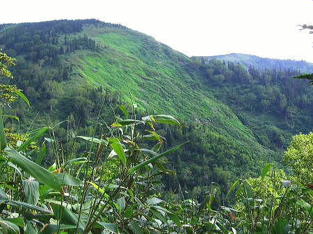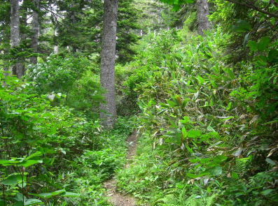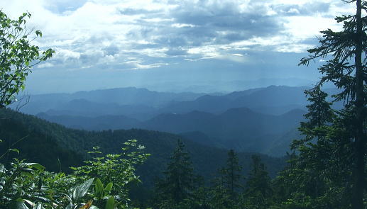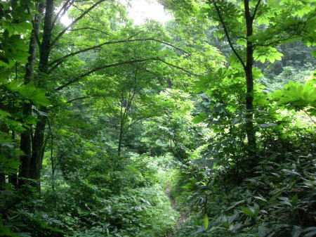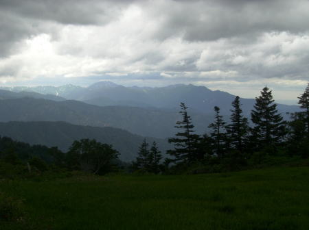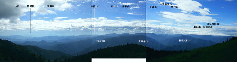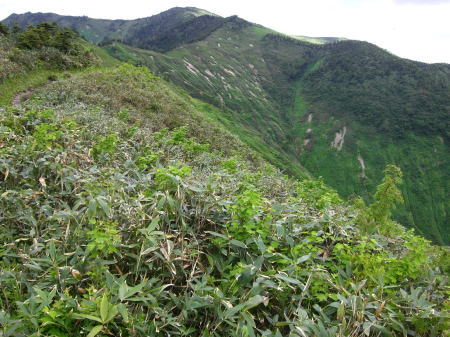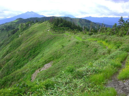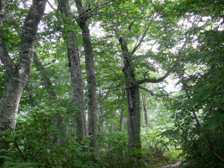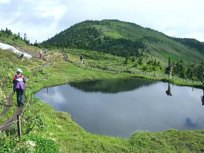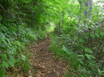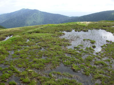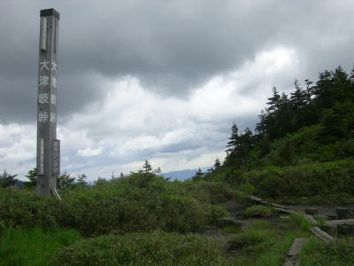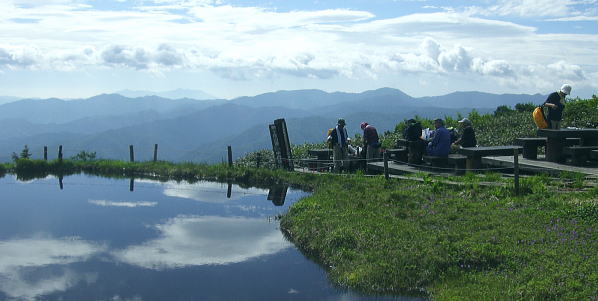 池塘を綴り行く先に大きな池塘があり.その脇が頂で大きな道標がある。 斜めに傾いた道標には「この一帯を云う桧枝岐村」と言葉が添えられ.短い言葉は素朴だがこの地域全てを悟らしているよう思える。 今にも壊れそうな小さな古いベンチがあった。ただ駒ヶ岳で望んだ魚沼三山はガスに包まれ.北方全ての視界は閉されていた。 リンゴ 今回も大きなリンゴを1個持参した。1人と云うことで中を妻に頼んだが1回では食べられぬ大きなリンゴを用意した。道中2度に分け食べている。 水場で半分齧り.中門岳で残りを食べる。彼女も私に劣らぬ大きなリンゴを持ってきている。 ザックから取り出したリンゴを1/8位に切りながら一切ずつ食べている。慎ましく贅沢なリンゴの食べ方だった。美味そうに食べ私を見詰める彼女。 「私もリンゴをもっているぞ!」とザックから取り出し丸齧りした。共に苦笑い。私のリンゴは一層美味くなった気がした。 戻るとガスに追いかけられ視界は全く失われた。ただ駒ノ大池に戻ると明るい青空の下に返っていた。 カッパを着ている者は剥ぎ取り腕を捲くる。煌き輝く池畔は嘘のような強い陽射しを浴び.反射させた水面は浮かぶ白雲を映している。 駒ノ大池々畔 一番端のベンチに座ると2人も座る。好かったとみえ感謝する彼と彼女。彼女は20代後半.ニューギリアの山に登り.ジャワ島の山にも登っている。 帰国して2年前から日本の山に登り始めていた。四季の日本の山が素晴らしいと。 又使わぬストックを尋ねられた。長旅や一人旅の時.捻挫等万一の場合を考えて.最近では昨年の飯豊山で使っていた。 彼からは富士山について。冬富士から始めたと語ると驚いていた。遠いい昔の話だった。 往路を戻る彼等を見送り.私は大津岐峠へと南方の尾根を取り.富士見林道をたどる。 大津岐峠越え 10:30駒ノ大池10:50一11:50大津岐峠一12:20大:50一13:20小:40一14:50キリンテ=桧枝岐.民宿「奥尾瀬」h. 大津岐山と大杉岳 駒ノ小屋より. 中央左が燧ヶ岳.右は至仏山.11:11潅木に被われた狭い岩稜混ざりのガレ尾根を下る。暑さが増しネクタイ形清涼布が首の暑さを和らげている。 燧ヶ岳を正面に迎え.稜線は約3kmに渡り.起伏の緩やかな湿原が尾根筋を覆っていた。 1956m峰を越えると尾根幅が広がり.台地状の湿原を歩むようなる。 ここから大津岐峠までの稜線の右側は低い潅木が覆い.左側は視界の開けた尾根道が続いている。 顧みる会津駒ヶ岳と中門岳 右尾根が上ノ沢と下ノ沢を隔て滝沢からの登山道がある.11:41振り返ると中央右が小さな緑の湿原.その上に駒ノ小屋がある 足元には梅雨が続く,まだ陽射しが足らぬ.しぼれ落ちたイワカガミの群生やコバイケソウを見る。ヤマトシャクナゲも花を咲き競うが今一元気がない。 日照時間が不足しているのだろう。もう直ぐ元気になるのだろう。 尾根道が桧枝岐川側に変わり.只見川からの風を塞き助かる。日は陰るが気になる暑さは相変わらず蒸す暑さ。 我慢に我慢し幾つもの湿原を抜けている。 湿原を綴る径.駒ヶ岳山頂一帯は湿原に覆われ.北方は中門岳から南方の大津岐峠まで及び続いている。 尾根筋の只見川側はガスが湧き.国境背稜の山々は分からず.姿が見えなくなっていた。 反対に扇状に広がる上ノ沢源流は裾野へと大きく落ち込み.桧枝岐川を挟んだブナの森が帯をなし綴られていた。 過ってここは昆虫の宝庫だと聞いたことがある。その深い緑の森の谷間を尾根から見下ろしていた。対岸の尾根もガスで見えなくなった。 燧ヶ岳の雄姿 燧ヶ岳とその下が大津岐峠.11:49右に至仏山と景鶴山 薄日に変わると何処からかトンボが現われ舞い集まり群をなす。そして陰ればいなくなる。その繰り返しが何度か続いた。 追ってくるトンボか? その場のトンボか? 意外と長い間隔でトンボとの隠れんぼの中を進んでいる。 大津岐峠 ![]() 再び雨雲に覆われた日崎山.ススヶ峰と重なる景鶴山〜平ヶ岳.11:59 やや風が立つと共に再び一瞬にして厚い雨雲に覆われた。雲は何処から来たのだろう。雨を伴い風も強くなる。 大津岐峠にでて闇の空に変わった。雷鳴が落ちてきそうだ雰囲気。昼食どころではなくなった。まず風を避ける所を探さねば。 この間々真っ直ぐ尾根を南下すれば昔スキーで登ったことにある大杉岳へでる。その大杉林道を分け.左の尾根道へ折れる。 霧雨は小雨に変わり.重くなった足を庇いながら駆け下りる。大津峠から下ると直ぐ潅木帯に入り.滑り易い粘土状の径を休むことなく早足で歩む。 それ程経たずにシラビソの林を潜っている。幹の太さは下るにつれ太く.仰ぐ樹林も多くなった。ただ小径に踊場的な所は見られなくなっている。 山道の平らな雨雫の防げる大木を求め.一気に駆け下りた。 オオシラビソの森.13:08大休止 下ること30分.白樺の大木の下に昼食のポイントを見い出した。ただ細い1本道。 幅40cmにも満たない裸土は両端の樹葉に被われた。雫を一杯樹葉に留めている。まずザックからコンロ.食糧を出しザックに腰を降ろす。 献立はチー