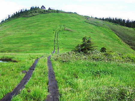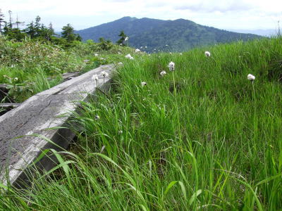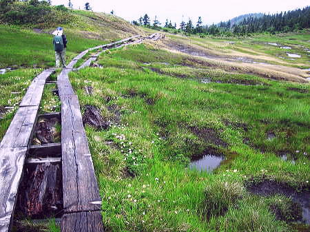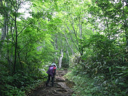 | 尾瀬沼の同期会山行と前日歩む会津駒ヶ岳Uと中門岳. ・・会津駒ヶ岳周辺Top 南会津周辺Top 翌日は桧枝岐から尾瀬沼を周回する同期会山行を催す。それに合わせ.仲間達に甘え.前日夜行バスで会津駒ヶ岳に出向く。 滝沢橋登山口から単独で会津駒ヶ岳を越え.中門岳をピストン。頂稜を更に南下してキリンテへ下山。仲間の車に迎えられた。 合流して桧枝岐で同期会を催す。翌日は小渕沢田代に出向き尾瀬沼を周回した。 2009年07月18〜20日.m大川.鈴木.田沼.松村 7.19.夜行で会津駒ヶ岳・中門岳.南下してキリンテ・・トンボ.耳虫と同期会 7.20.桧枝岐の酒宴と真夏の陽射しを浴び尾瀬沼を周回 夜行バスと天候不順な一日・・標高2000mの天空の楽園.高層湿原にでて.会津駒ヶ岳から中門岳をピストン。 s43年度桧枝岐同期会山行・・天気が回復し紺碧の夏空が戻った尾瀬沼。雄大積雲を見つつ尾瀬沼をゆっくり探索する。 駒ヶ岳から中門岳への木道桧枝岐での同期会 7月中旬に大川の呼びかけで同期会を桧枝岐で催し.尾瀬を散策する計画が立てられた。 同時期に私は金精峠から根名草山を越え.日光沢温泉から黒岩岳を抜けるコースを仲間達に募っていた。当然同期会を優先させている。 和田の希望に合わせ19日.20日の連休を利用して行われた。私は会津駒ヶ岳の入山を兼ね.前日に発ち.頂きに立って夕方合流している。 奥鬼怒コースはハイカーの少ない時期に歩むに限る。連休で二の足を踏み.黒岩岳から桧枝岐へ抜けるコースを諦め. 私1人が前日の夜行バスで東京を発ている。そして会津駒ヶ岳を越え桧枝岐の宿で合流する形を取っている。 会津桧枝岐に訪れるのは今回で4度目になる。 初めて桧枝岐へ出向いたのは山に登り始めてから大分遅く.大学を卒業した後になる。奥利根源流の日崎越えを狙い尾瀬ケ原,山ノ鼻にでていた。 その時の相棒マタは初めての尾瀬山行で現地に入り.尾瀬ケ原に惹かれて原から動かず。根を上げ.利根への山行を諦めさせられている。 尾瀬を横切り桧枝岐へ下り.即席の計画は桧枝岐から駒止峠越えるて会津バスに乗り.会津田島へでて.夜行2泊3日の日帰り山行になった。 国鉄滝原線・磐越西線を経由して郡山へ。当時は山口の中心部以外は舗装されていぬ街道だった。 又1973年05月には清水峠から燧ヶ岳越えをし.浅草カッパ橋に住む新津先輩の迎い車と合流。会津駒ケ岳の斜面をスキーで滑っている。 その後75年05月には沼津の富山先輩と遠く六十里峠越えをし桧枝岐に入り.大杉岳を滑降しピストン。.安ヶ森峠越えで湯西川へ下り. 大雪で悲惨な思いをしている。それから35年の月日が経ち.大川の呼びかけで桧枝岐で再び同期会が催された。 7月18日曇. 新宿西口.尾瀬直行バス(JBSサン&サン.郡中バス.¥5.400.平日¥4.400)往路夜発22:30= アプローチ 満員の乗客48名を乗せた夜行バスは池袋経由で浦和ICから西那須塩原ICを抜けている。そして会津西街道よりR352へ。 3年前大川と帝釈山に登るため湯の花温泉へ向かったルートを再び遡る。車中は私を除く乗客全員が尾瀬を目指していた。 私1人が途中下車.会津駒ヶ岳へと。 指定された停車場はアルザ尾瀬の登山口.歩いて15分だが休憩の道の駅「田島」で車掌と交渉し登山口までお願いした。 返事は一発で分かりましたと言葉が返ってきた。聞いてみるものである。 まだ夜明け前の白みが掛かり始めた頃.滝沢橋登山口にバスは停車。車掌は登山口の方向を指し「気お付けて!」と言葉を掛けて頂いた。 お礼の言葉と同時頭を下げる。 アプローチは列車の場合.東武浅草.尾瀬夜行特急23:55=3:18野岩鉄道.会津高原尾瀬口4:20=6:00アルザ尾瀬.¥5.100 南会津への鉄道.交通経緯 国道から林道に入った登山口 左の登山届箱は届け用紙で満杯.5:2619日曇一時雨.晴間の不安定な天気 4:20会津桧枝岐.滝沢橋登山口一4:40林道登山口5:10一5:45ヘリポート一6:30水場:50一8:05駒ノ大池:20一8:40会津駒ヶ岳. 滝沢登山口 国道352号線沿いの登山口の立派な道標は真近で見ねば分からぬほど暗く.まだ林道入口はおぼろな闇に閉ざされている。 舗装された路面には山靴の音か響き.霧雨が流れる無言の世界だった。登るに従い白みだし.車が何台も私を追い抜けて行く。 小型バスも登ってきた。総勢50名は超える登山者が私の前を過ぎ去った。私は林道の巻道を直登し.径を綴り林道の登山口にでる。 深いブナの森.5:54登山口の階段からカラ松林の斜面をジグザグに綴り.越えるとブナ林の中になる。直ぐ大樹に包まれるようなった。尾瀬大杉岳山麓から東面に長く広がる ブナ林の帯状の森.その端を横切るよう登っている。やや緩やかになり.途中にヘリポート跡と呼ばれる場所にでた。 札板に「平成元年6月.必要に迫られ開設した救助用臨時ヘリポート」とある。尾根幅はそう広くない狭い空地だった。 ヘリでは直接降りられそうもない痩せ気味の尾根の背だった。 小雨降るブナ林よりシラビソの森へ.6:02オオシラビソの大木にダケカンバが現われだすと水場にでて1本取る。左手.上ノ沢側に200mも下ればチョロチョロ水が