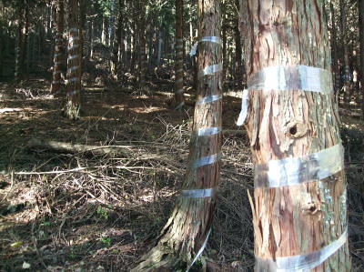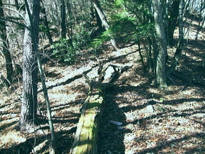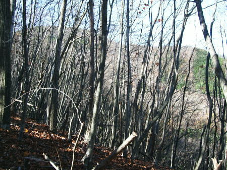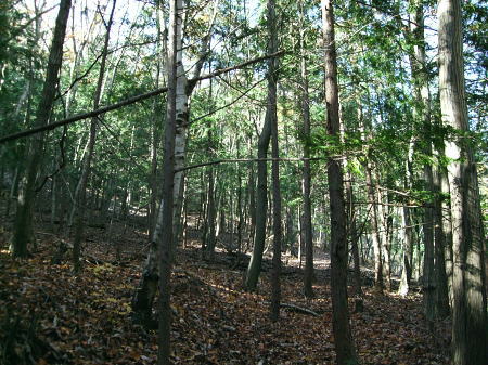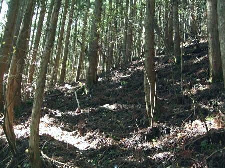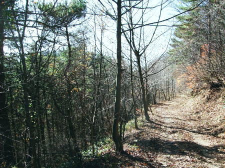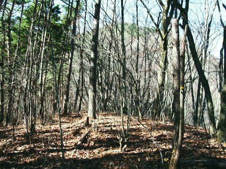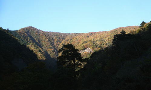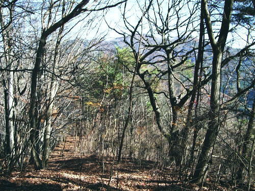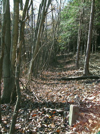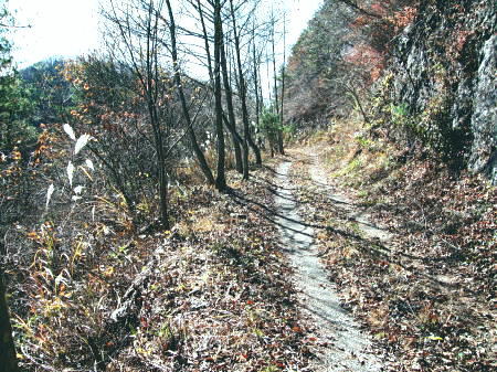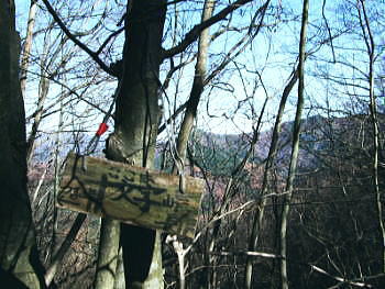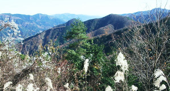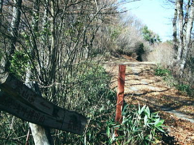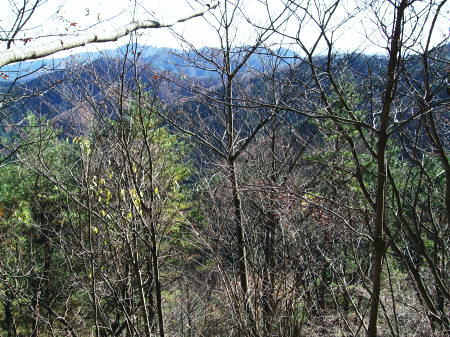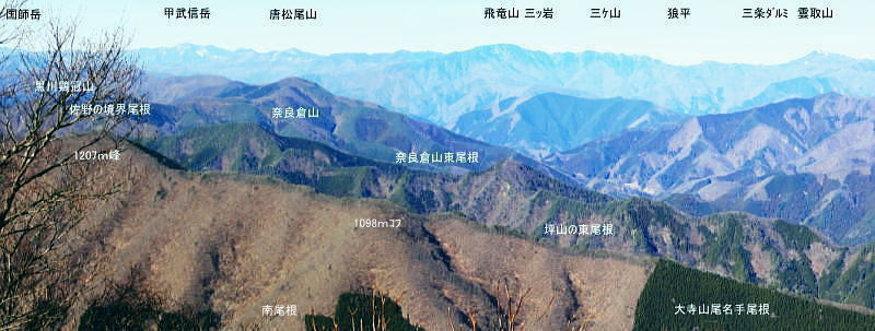 尾根幅が広がり傾斜が全く落ちると峠状の十文字路にでる。ここは右手に踏み跡を折れ.旧道と綴れば鶴峠へ。 左手は旧道から鈴ケ尾山1238m峰手前の背稜にでる。ただ踏み跡らしさは失われ.薄く分からなくなっていた。 山腹を巻く水平歩道は過って小菅と繋がれていた葛野川を結ぶ旧佐野峠道。 今は松姫峠に車道が開通し.鶴峠からの旧道も廃道で踏み込めぬほどの志向者向けの踏み跡になっている。 右手口の立木に付けられた小さな板切れに「十文字峠」と峠名が示されていた。道標類はない。 北側に小米沢川左俣と南側には秋切沢の枝沢が詰め合わせている処が十文字峠。奈良倉山東尾根の分水嶺を成し.共に鶴川の右岸支流になる。 鶴峠から十文字峠に至る巻き道の旧道は谷筋の荒廃が目立ち.藤井氏によると十文字峠と山頂の中間地点には.数年前に早くも. 鶴峠からの迂回路が設けられていた。現況は如何だろうか.歩程2時間弱とある。 丸2日間降り続いた雨にも拘らず.土壌は秋の季節らしく乾きが早い。風もあり今まで殆どぬかるむ踏み跡は見られなくなっていた。 ただここだけは枯葉もジメジメしていた。樹冠を仰ぐと雲1つない紺碧の天空が樹葉の隙間から広がりを見せている。 煙草の煙が少し斜めに流れ.やや風がでてきたようだ。肌寒さを感じザックからチョッキを取り出している。ついでに空腹感を覚え結飯を1つ食べた。 真近になった奈良倉山.11:03後は東尾根沿いを真っ直ぐ進めばよかった。再び奈良倉山の直下を巻く十字路に交差している。 地形図に記されていないが右手が鶴峠からのトラバースした迂回路。 ここからは奈良倉山の頂へは灌木帯を綴るとナラ.ヌクギが主体の雑木林になり.確りした登山道が変わっていた。 尾根幅がドンドン広がり笹原が現われ始めれば落葉松林へ変わり.程なく奈良倉山にでて喘ぐ間もなく頂に立つ。 奈良倉山 山頂台地より.11:21奈良倉山 頂は落葉松林・赤松に包まれた円やかな広い平頂台地で.冬木に被われているも展望は得られなかった。 奈良倉山の大らかな頂の中央に2等三角点標石があり.落葉に半ば埋もれ土壌は殆ど見届けず。 この景色も昭和の初め頃は明朗濶達なカヤトの峰だったという。「ナラ」は平坦状の緩斜面を指し.「クラ」は乗馬の時の「鞍」を意味するとのこと。 優しい山容に相応しく.七保側の人々は「御坊主山」と言われ.昔は「茅平」とも呼ばれていた。 七保を挟んだ対岸の南大菩薩連嶺の最南端にも同じ山名の「お坊山」と云う山並みがある。 笹子雁ガ腹摺山の東側で米沢山の隣り.笹子川の北岸に位置し.やはり穏やかな頂を持つ山容だった。あり触れたようで変わった山名でもある。 「雁ガ腹摺山」の山名が幾つもあるように.何か繋がりがあるのではないだろうか。・・2010年12月入山 この頂稜を綴れば牛ノ寝通りにでる。昨年12月に石丸峠から松姫峠を経て中風呂へ下りていた。 奈良倉山はこの松姫峠から東へ小ピークを越えた2ッ目のピークにあたる。 奈良倉山と1238m峰 奈良倉山南西尾根には踏み跡が西原峠には登山道がある大菩薩長峰を下りシオジの森・ふかしろ湖深城ダムからの奈良倉山・・翌2010.11.04/15:15 奈良倉山のとりわけ西面は松姫峠から奈良倉山を過ぎて1238m峰まで延びるているのが市村界尾根(上野原市・小菅村)。 1234.7m三角点峰では市町尾根(奥多摩町)に変わってる。その間に掛かわる広い範囲は新たに伐採され. 展望の利く尾根に変貌している。林道に下りる途中で西南面の展望が開かれれる。小金沢連嶺から雁ケ腹摺山. 楢ノ木尾根と瀬戸境.更に御坂山地を挟む富士の秀麗たる景観が広がる。藤井氏によると「近時.峠から山頂を過ぎ. 1234.7m峰に掛かる範囲があらかた伐採され.林道までも通ずるに及び.昔の素朴な雰囲気はあらかた失われていた。 もはや展望の尾根に化し.小金沢連嶺から雁ケ腹摺山・楢ノ木尾根更に御坂山塊を挟んで富士の麗姿と」.申し分ない。 山頂から南下すること数分.前途の林道に下り立ち.1238m峰まで林道を歩む。その先.佐野峠(ベンチあり)を経て 1234m三角点峰までは尾根通しか.巻道かの2ルートのいずれかを選ぶ。たどりつく西原峠直前の分岐点には七保・飯尾を指す. 不釣り合いに立派な道標が設けられていた。「飯尾ハイキングコース」なるものが。」とある。 高く抜けた秋空に富士と三ッ峠山 頂の南肩から展望が開かれる.11:30手前が楢ノ木尾根.大峰に続く南尾根.瀬戸境が横切っている。 三ッ峠山との間に出す頭が鶴ケ鳥屋山の山頂で麓に笹子川が流れ. 写真の富士の真下が富士吉田市になる。 それでも近年.奈良倉山の西面のとりわけ松姫峠から山頂を過ぎて.1234.7m峰にかかろうという広範囲があらかた伐採された。 林道まで通じるに及んで昔の素朴な雰囲気はあらかた失われたという。展望の尾根に化したという。 小金沢連嶺から笹子雁ガ腹摺山・楢ノ木尾根.更に御坂山塊を挟んで富士の秀麗さは申し分ない望めだった。 葛野川右岸の山並 11:31対岸に見渡せるのが楢ノ木尾根と瀬戸境。尾根沿い上