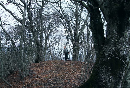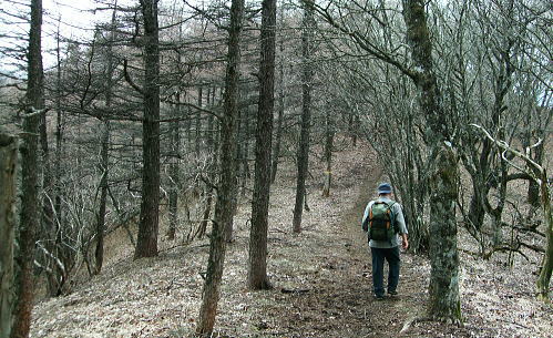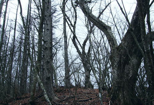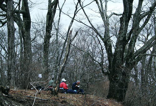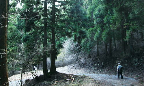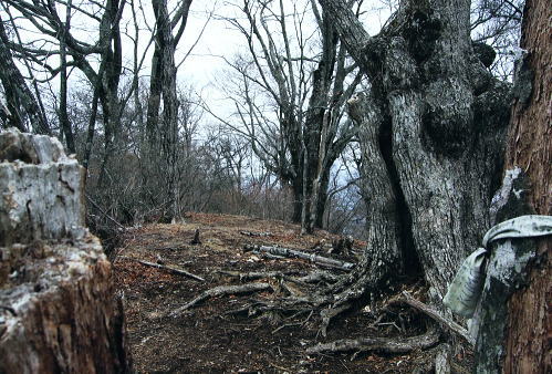 鹿留山のミズナラの巨樹群と間近に望む杓子山からの富嶽 鹿留山北尾根を詰めた頂でミズナラの巨樹群と出合い.杓子山の頂では富嶽の大原野と対峙し.大権首峠から不動湯鉱泉へ 鹿留林道から鹿留山北尾根 異色の景観の鹿留山と杓子山・老樹林と原野・・「不動湯鉱泉」から大明見・富士急下吉田 鹿留山の原生林 ジャンクションピークより.12:26ブナ.ミズナラの原生林 もう鹿留山の頂も目の前だった。頂の上をどんよりした霞みに覆われているのが判る。 この北尾根は珍しく殆ど下部に至るまで喬木の生い茂る大地だが藪漕ぎを強いるほどは強くは見られなかった。雑木に潅木の薄い山域 谷間も尾根筋も枝木が絡むも濃い藪漕ぎはない。積み重なる深い落葉とぬかんだ土壌.岩石の転がりも少ない尾根。 ルートファンテングさえ確りしていればよく分かる山だった。どの尾根を詰めても時間的には左程変わらないだろう。そして最後に原生林の頂と出会う。 北尾根ツメ.最後のひとコマ 冬木の巨樹が寒々しいジャンクションピークから殆ど傾斜のなくなった頂への稜。三角点石標1632.1mがあり.ブナ.ミズナラの原生林に覆われた快適な台地にでる。 ここから南西へ300mほど進むと鹿留山の頂稜の一角に子ノ神がある。本来は鹿留山とは子ノ神の北側から東側の一帯を呼んでいた。 ナラ・ミズナラの茂る超喬木林に被われ.ここでは展望がないのがよい。それが又幻想的な景観を創り上げていた。 登った者だけが報いられる不思議な最後のひとコマが頂に創られている。 鹿留山,太古の地 巨樹に囲まれた頂巨樹の棲家 裸林の不可思議な世界 共に初めての山で味わう連れのパーティ.12:36突然現われた巨木林.ズナラとブナの巨樹が共に変った造形で絡み幹を太らせている。今までとは異なる別次元の境界を造りだしていた。 覆い被さる暗い霞みが周りを包み.巨樹の精霊達の踊り場的な気配を漂わしている。 何故ここだけに集中して生い茂るのだろうか。ミズナラとブナが混ざり存在する不思議なツメの世界がある。 上手く写真で正眼できればよいのだが。 食事は酒宴に?大休止 予定より少し長く踏み跡を綴っていた。その頂で彼は直ぐコンロをだす。彼のザックから水2.000cc+500ccに角ウィスキーもでてきた。 彼が水分を多く持ってきたと自慢しているだけの中身である。日帰りの山.私は1.000cc+500cc+焼酎360ml×2を持参した。 食事は前回がラーメンだったことを考え生うどんに変えている。生卵と長ネギは常等だが数回の経験から今回は野菜天婦羅を買い込み持参した。 私は焼酎を持ち込み歓ぶ彼と乾杯しウィスキーをも少々口にした。 それが悪かった。終わりなき酒宴は巻き込まれる。彼と頂でウィスキーを1本空けることになった。旨い酒に酔っている。 殆どストレートで呑んだウィスキー。それとも不動湯で呑んだビールが悪かったのか。下山ではそれらが徐々に利いてきた。 その後はほろ酔い加減で下吉田の街並へ下りている。気は確りしている積りだが帰宅してから頭が痛くなる。彼は私以上に強い。 杓子山の頭 鹿留山より.13:29鹿留山・杓子山から不動湯 12:25ジャンクションピーク一12:35鹿留山.大14:00一14:35杓子山15:10一16:35大権首峠一15:55小16:00一16:05ゲート 一16:30不動湯17:35. 子の神より杓子山へ.14:04子ノ神から左に折れれば立ノ塚峠・二十曲峠を越え石割山へ続く稜になる。 立ノ塚峠の林道は内野から峠の東面の都留市分まで延びる林道は昭和30年代には盛んに炭焼が行われていた所。 その当時から既に鹿留川池ノ平への峠路は廃道化し.二十曲峠は林道が内野から鹿留へ乗越してをり.水神と山ノ神の新しい石碑が建つ。 3つのコブを越し長い時間を掛け留まっていた頂を去る。子ノ神から緩やかに上下するコブを2つほど越すと杓子山。 長閑な眺望の散歩径になり.杓子山に立つとその裏側には南面の大展望が開かれた。 杓子山 忍野に続く藪は切れ.もう直ぐで富嶽の裾野を望む思わぬ方向からの鹿留山.杓子山 富嶽の東麓大岳山南尾根から馬頭刈尾根に乗り・・2015.12.18/11:14 杓子山々頂 ![]() 石割山の尾根と甲相尾根 御正体山と鹿留山・杓子山. 御正体山の頂は周りの樹木が育ち展望はない。山陰の裏側が山中湖. 鹿留山の裏はミズナラの巨木林.杓子は富士の原野.展望の優れた山。 杓子山 杓子山はカヤトの原が広大に広がる広場のような平頂だった。テーブル.ベンチが幾つも備えられていた。 ここに来て鹿留山の太古の頂とも比べようのない明るさが開かれた台地。富士の怒気を越した原野を主る裾野は広大な景観をもたらし現わしていた。 圧倒的な大きさに富嶽の裾野を隠すことのできぬ広大な大地。18キロほどの長大な距離を一気に見渡せる原野が.この頂から開かれていた。 下りは不動湯経由に決め.杓子山でものんびり留まることにした。重く霞む雲が重苦しく垂れ込む富士の裾野を覆う。 又処どころで雲がの切れ目から薄く大地の一部分を照らしていた。広大な荒地の北富士演習場も雲陰に隠れ気味で.目立たぬ存在だが馬鹿広