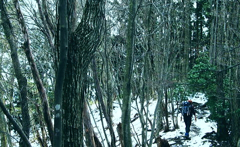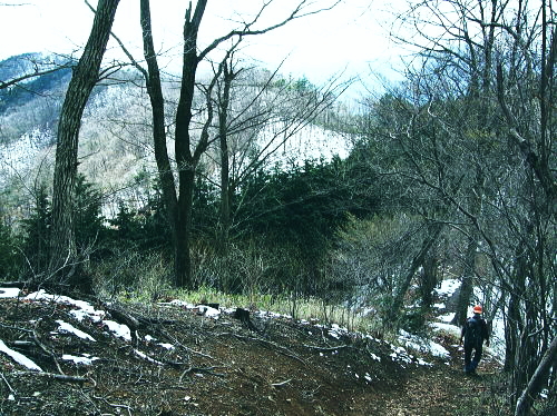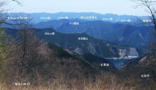 | 奥武蔵丘陵の南部と都県界尾根周辺 棒ノ嶺 2010年04月. 名栗ダムから白谷沢を詰め棒ノ嶺―都界尾根を南下し黒岳を経て岩茸石山から惣岳山神塚尾根 2019年10月. 清東橋bsから槙ノ尾沢左俣右岸尾根を経て都県尾根を綴り棒ノ嶺・黒山―常磐尾根から岩茸石山・馬仏山沼沢尾根 2022年10月. 清東橋bsから槙ノ尾沢南尾根を詰め.長沢脊稜を綴り棒ノ嶺を横断―北東尾根から名栗湖の湖畔.有間ダムを繋ぐ・・ノーラ名栗さわらびの湯 名栗ダムから棒ノ折山に立ち.春雪残る都県界尾根越えるW.更に黒山山稜から神塚尾根を下る・・棒ノ折山.黒山.岩茸石山.惣岳山 名栗川白谷沢渓谷から都県界尾根越え.棒ノ折山黒山山稜.惣岳山神塚尾根から多摩川.丹縄に下りてjr御嶽駅。 黒山・常磐尾根から岩茸石山を経て惣岳山神塚尾根に丹縄と奥多摩左岸旧道. 2010年04月18日.L松村m見城 名栗ダムから権次入峠から棒ノ折山をピストンし.興越山を越え名坂峠・・湖畔の取付きでワカサギ・ヤマメ釣り 岩茸石山から惣岳山神塚尾根と多摩川左岸旧道 昨年暮れの西上州忘年会山行では高水三山案がだされ.この処何度が登り続けている高水三山を敬遠し.町界尾根の大岳山に変更させて頂いていた。 そのことから滝島先輩と同期鈴木は改めて高水三山に出向いている。見城先輩も入山したいと願っていたと後に知る。 最初から云って頂ければ拒む積りもなかった。2月に入り2度計画を練り直し.荒天と私事.k氏と交互に都合が合わず. 4月の桜満開を迎えて漸く奥武蔵.名栗の棒ノ折山から都県界尾根へ乗り移り.奥多摩の高水二山へと出向く。 高校の頃.奥武蔵伊豆ケ岳.武川岳を登り.その時の懐かしい地名として名郷・名栗を想いだし.棒ノ折山から入り南下する形を取ってみた。 今年1月に奥多摩.真名井沢北稜から仙元尾根を下り秩父に降りたことで.奥武蔵南面の概念も少しずつであるが知る知識を持ち始めていた。 秩父さくら湖から東方の名栗湖に変わり.今回は名栗湖々畔から「関東ふれあいの道」へと綴り.岩茸石山.惣岳山を南下した。 ダム堤高から白谷沢を詰め.棒ノ折山の広い台地から春雪の雪白き都県界尾根を黒山で分け.常磐尾根から奥多摩の山懐に入る。 上成木を望む岩茸石山から縦走路を分け.惣岳山から神塚尾根に乗り移り.新秩父線鉄塔基部を抜け丹縄へ降りようとと思っている。 今まで辿ってきた大丹波川対岸の鉄塔尾根群も眼前に見下ろされるだろう。 又一昨年は池田先輩の下見山行で高水三山を訪れている。その時寄った古い宿「五門館」の女将との再会も楽しみだった。 有間山々稜 名栗湖々畔より.8:174月18日(sun)晴後曇 jr御徒町5:18=5:38西武池袋.準急¥450. 6:00=6:55飯能.国際興業バス¥600. 7:10=8:00さわらび湯bs 一8:35白谷沢出合一9:05白孔雀ノ滝:20一9:35林道一9:45岩茸石一10:05権次入峠:10⇔10:30棒ノ折山:45. 入山 西武飯能駅南口から名栗行路線バスに乗り込む。柔らかい朝の陽差しが車窓に飛び込み.温室のような温みに浸かっていた。 50分程で「さわらびの湯」に下車。バス停からさわらび湯まで歩むも道標がなく.ダム下のルートが判らずに10分程ロスした。 何を勘違いしたのか先輩の言葉を聞き.舗装された広河原逆川線を辿り名栗ダムの堤頂上に立っている。 外は強い陽射しに恵まれた。路肩に咲く満開のアカヤシオ. 湖畔沿いの山々は隅々まで春の明るい潤いに満ち,花の香りを運んでいる。 一昨日は東京でも季節外れの雪が降り.その前線が周りの山々の山肌を雪白く輝く台地に変えていた。 路線バスの車窓からは道中.満開の桜に混ざりヤシオツツジの鮮やかなピンクの花も見られ.春の到来を告げていた。 南岸の桜並木より有間川上流棒ノ嶺北東尾根と金毘羅尾根に挟まれた間から望むバラ尾根 名栗湖 ロックダムのダム堤を横断し南岸にある変わった形の発電用入水口脇を抜け.名栗湖に流れ込む白谷沢から取付いた。 登山口横でコンロを囲みホルモン焼でご機嫌にビールを呑む人達と出会っている。彼等はマス釣りに来たらしい。 少し離れた場所に置き竿が5本添えられていた。岩魚も釣れると言う太公望達は前祝いに忙しい。ただまだ釣れていないようだった。 入山の予備知識を持たなかった私は釣人が気になり? 登山口右脇にある清水「白谷の泉」を見過ごし通過している。 ここは名だる名水らしい。後日.図書館で昨年の5月号の雑誌「山と渓谷」のメーンタイトルに「おいしい水を求めて.新緑の山へ!」を見付けている。 その中にこの「白谷の泉」が記載されていた。「この水を求め.棒ノ折山へ登ろう!」と写真を何枚も撮り.紀行文が載せられていた。 読めば読むほど残念でしょうがない。どんな所でも山へ入る前に.下準備は必要であることを痛感させられた。 白谷沢 変化に富んだ白谷沢の廊下「牢門」.8:53地図だけを持ち.コースの詳細を調べず入山している。先週は相州鹿留山に登り.下山時では友の希望で急きょ「不動ノ湯」に寄っている。 その時は地図を頼りに悩みながら里の富士急下吉田駅まで歩んでいた。街に入っても地図を広