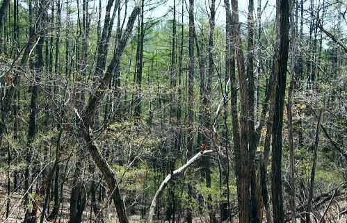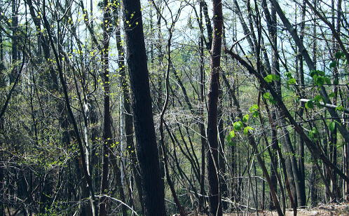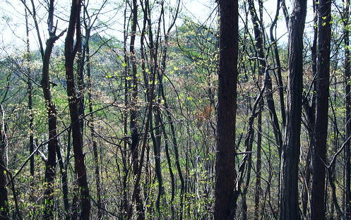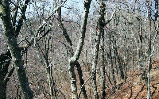 恩若ノ峰 確りした径が日川の嵯峨塩より続いている。 源次郎岳の稜は思いのほか確りした踏み跡が残され.道標がもう少し増えれば登山道と云える山道だった。 藪道も薄れ.恩若峰にでて時間的な余裕が現れている。北峰鞍部から南寄りに登り返すと広く平坦な恩若峰982.6mにでた。 藪もなく焦らず1時間45分ほどで来てしまったことになる。 恩若ノ峰は三角点標の周りは幾らか平地があり.丸く雑木に囲まれ眺望は悪い。 その囲まれた立木に赤く塗られた木片のプレートがり.墨で「恩若峰・・」と示された古い山名標が針金にブル下がっている。 向かいには「源次郎岳」と示す割れた新しい道標が掲げられていた。その真ん中に座り1本取り.先を考える。 北峰から北尾根を下れば慈雲寺経由で早く麓に降りられる。又本峰から西方へ下れば果樹園から文珠院経由で共に塩山に下る。 塩山駅の傍には日帰り風呂もあり.共に悪いコースではないが何か物足りなかった。ゆっくり寝転び樹冠から広がる空を仰く。 もう少しで緑溢れる世界に入り込める。間違いなく新緑覆う尾根に出会えるだろう。松浦隆康氏の言葉を思いだす。 まだ若草萌える大地は踏めぬものの.枝に溢れる若草色の茂みが現れることを期待した。南西尾根を下ることにする。 上日川峠から冬木の日川尾根を南下 寂峰の源次郎岳と恩若ノ峰・・芽吹きだし樹葉に生む青さ 若葉萌える恩若ノ峰南西尾根 |