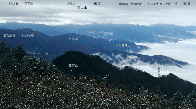 | 重川左岸尾根中半U.日川尾根西面の支尾根・・頂点の源次郎岳から髪櫛川北洞沢右岸尾根 まだ日川尾根に続く冬木の源次郎岳を越え.キリガ尾根を左手に分けると芽生え始めた樹林は次第に新緑が目立ちだすし恩若ノ峰にでる 上日川峠から冬木の日川尾根を南下 寂峰の源次郎岳と恩若ノ峰・・芽吹きだし樹葉に生む青さ 若葉萌える恩若ノ峰南西尾根 雲海と雪雲の二重雲に覆われた郡内と国中との境をなす山稜 ハンゼノ頭からの展望・・2014.11.21/8:58高芝山越えの長い尾根は柳沢峠.大菩薩嶺を源として上日川峠持つ重川左岸尾根。更に源次郎岳.恩若ノ峰から恩若ノ峰南西尾根へと連ねる。 甲州高尾山の裏側は日川になり.塩山盆地の雲海の下で重川と合わせ.更に笛吹川へ流れ込んでいる。日川の左岸は御坂山地の北岸になる。. 源次郎岳 冬木の台地.11:58嵯峨塩温泉への分岐から日川尾根西面の支尾根を繋ぎ.更に左岸尾根を綴る 源次郎岳から恩若ノ峰 12:00嵯峨塩分岐.大:25一12:40源次郎岳一13:05源次郎平一13:15小平地コブ一13:40塩山ゴルフ場見える所 一14:00標識あるコブ:15一14:25恩若ノ峰:50. 源次郎岳手前の無名のコブ.11:57境沢ノ頭・宮宕山 嵯峨塩への分岐より南方.12:34恩若ノ峰へ これから先.私には未知の世界だった。以前遠方から何度か眺めていたとしても漠然とし分からぬ領域に入る。 源次郎岳から恩若ノ峰. 低山とは言え山名も知らぬ山域だった。裂石から大菩薩峠.丸川峠へのアプローチで2度ほど眺めた尾根。 塩山盆地に突きだした尾根筋で,この支尾根からjr塩山駅に直接下れる便利さから目指していた。 ここから南へ日川尾根を更に下れば嵯峨塩深沢林道から牛奥峠に抜け.登り返せば境沢ノ頭に繋がる稜にでられる。 嵯峨塩の分岐から日川尾根の主尾根と分かれ.重川左岸尾根沿いに入いれば今までとは異なる起伏をもつ.違った山懐深い山域に分け入れていた。 急に枝木絡む源次郎岳への踏み跡は確り踏まれていた。西方へ下り返す所では南方の山々が以外と真近に初めて望められている。 正面が1390m峰だろう。髪櫛川を隔でてた右手には源次郎岳キリガ尾根が絡んでいる。何処を見ても藪山としか思えぬ山並が急に現れだしていた。 源次郎岳山頂 中央に三角点と山梨百名山の木柱がある.12:35源次郎岳 ミズナラや白樺の雑木林に囲まれた小平地.の頂。三等三角点を持つ源次郎岳1477mに立つ。 頂は南北に非対称的な山容を見せ,「源次郎岳・山梨百名山」の木柱が立ち.脇に山名標のブレードも掲げられていた。 又冬木に覆われるも周りの展望は雑木林で閉ざされている。主尾根から外れると更なる寂峰を目指していた。 「頂まで15分」の表示があり.この先には2つのコブがある。手前のコブに比べ標高は源次郎岳の方が低かった。 どちらを指すのか判らぬが小さく突き出した名無しのコブの頂の方が高い。 源次郎岳を登り越え,鞍部から振り返えった源次郎岳の姿は立派な山容で嵯峨塩鉱泉分岐から臨むより更に奥深く感じられた。 その立派さに比べ.高い小コブの方が藪に閉ざされている。近くから見ても判りずらい位置にあった。 又頂の南西にある枡石と呼ばれる大岩は源頼朝に追われた岩竹源次郎の切腹の跡と言われていた。・・県公式サイトより 頂に着いたのが12時40分.「山と高原地図」赤点線のコースタイムでは頂から塩山まで4時間10分を要するとある。 私の許容範囲は頂を14時までに発つ。まだ時間は充分あるが先は判らないでいる。 エスケープルートとしては髪櫛川・北洞川.そして恩若ノ峰北尾根からの下萩原へ下ることを考えていた。 源次郎岳登山ルート 昔の国土地理院の地図,s23.09.空中写真.s24.11.現地調査.s34.03.発行の1/2.5万地図「丹波」を読むと源次郎岳の登山ルートとしては 恩若ノ峰からの尾根上と北洞沢の髪櫛川の沢沿いを詰めるルートが表示されていた。 又日川尾根のコブからの源次郎岳.及び恩若ノ峰からの南西尾根のルートはこの地図では見当たらなかった。 日川尾根西面と重なる大菩薩嶺からの小金沢連嶺 源次郎岳からの眺望.12:25写真では見ずらいが右後方に綴ってきた日川尾根の出だしの送電線192号鉄塔が煌いていた。遠くなった尾根の1/3は越えている。 踏み跡は時折薄くなり.又林道や脇径が交わり.以外と探りながら下ってきた。 手前の日川尾根に乗る左上の1627m三角点峰と下日川峠. 奥が熊沢山から括れた石丸峠は登り詰めれば天狗棚山1957.小金沢山へと続く。 大きな山容の境沢ノ頭1459.9m 遠方は御坂山地の山々.12:06三角コンパ東尾根と境沢ノ頭・・2011.03 右側が髪櫛川源流. 中央奥が笹子川南面の御坂山地.鶴ケ鳥屋山. 右手に本社ケ丸への稜は御坂山地へ続く。 中間は笹子川北面のお坊山東南尾根から笹子雁ケ腹摺山の稜。 大きな境沢ノ頭が悠然と構え.周りの山々を従えているよう見渡せられた。 その更なる南側には日川尾根下部の山々がコブのような頭を幾つももたげている。渋い低山の山々が遠望されている。 日川尾根の末端を西方へ曲るよう徳並沢ノ頭と更に派生する勝沼尾根も如