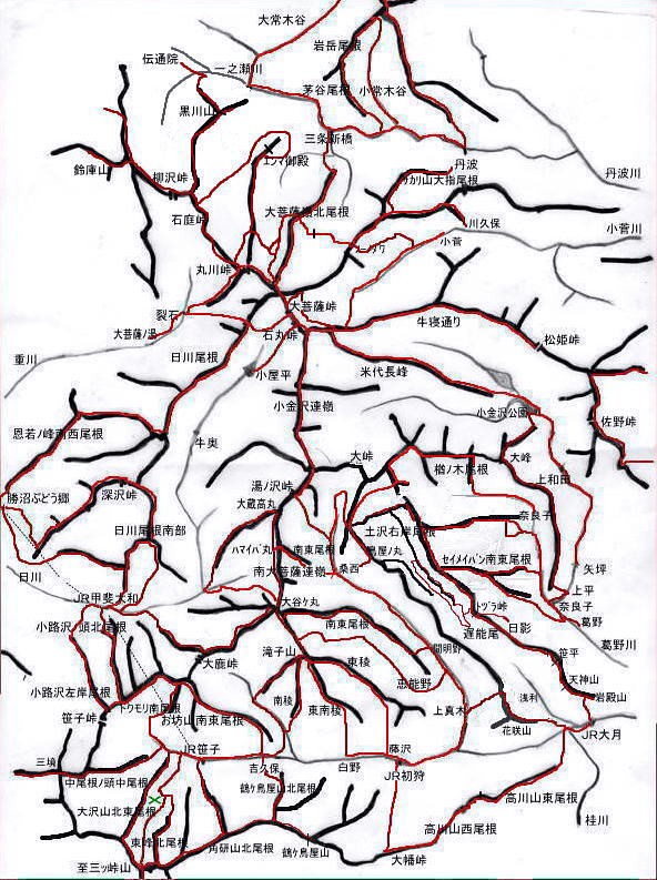 | 黒川鶏冠山 大菩薩嶺北尾根 丹波大菩薩道.村界尾根 サカリ山大指尾根 小金沢連嶺 牛寝通り 米代長峰 楢ノ木尾根.瀬戸越 野脇東尾根 セイメンバン東尾根 センメイバン南東尾根 土沢右岸尾根.葛籠峠 吹切尾根南下 尾根末端 鳥屋ノ丸南東尾根 南大菩薩連嶺 真木川右岸 大谷ケ丸南東尾根 破魔射場丸南東尾根 アモウ沢左岸尾根 滝子山東稜.南東尾根 南尾根 浜立尾根 日川尾根 大蔵高丸南西尾根 大鹿峠,西側鉄塔尾根 笹子雁ケ腹摺山 |
