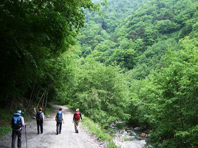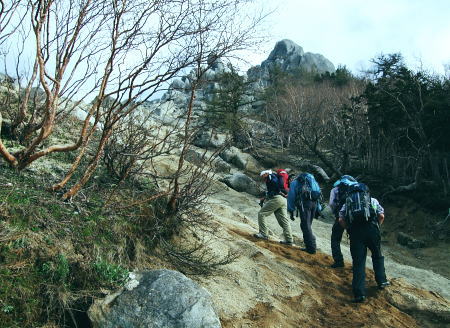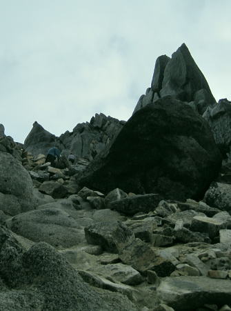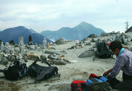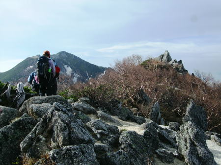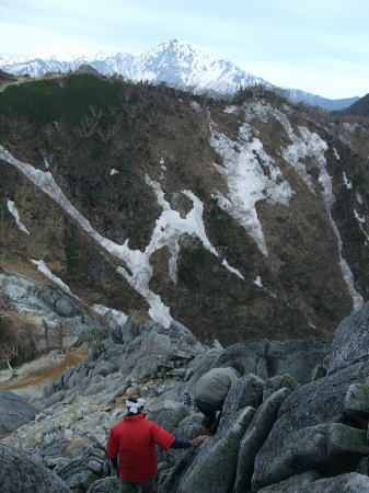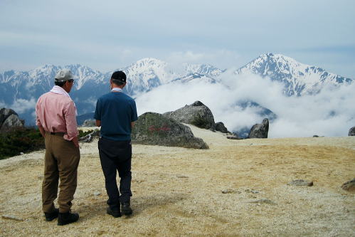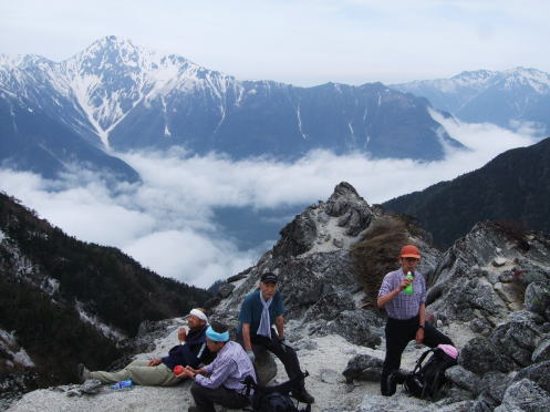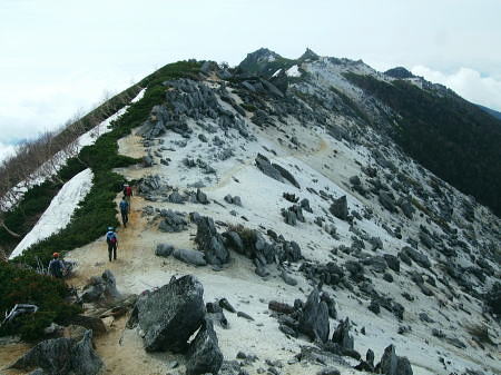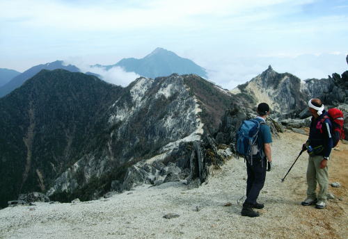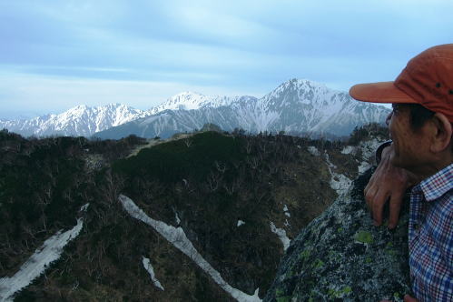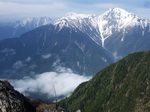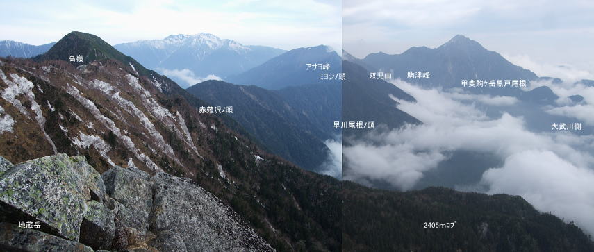 | 46年振りの山. 鳳凰小屋から以前はラッセルし雪山に挑んだ鳳凰三山を逆逆縦走で周回 頂稜を越え.中道の尾根から小武武川林道を下り.韮崎駅で別れる。ひとつの山を終え大菩薩嶺は諦める。 6.12.新緑のドンドコ沢を遡り.鳳凰小屋へ 6.13.鳳凰三山の絶景と中道コース・・美人の小屋番.青木小屋=大月で途中下山 朝焼けの鳳凰小屋 赤枝沢ノ頭と地蔵岳・・中2階左角に宿る.5:216月13日曇・・薬師岳からの中道の尾根を周遊 鳳凰小屋5:40一6:25賽ノ河原:55⇔6:40地蔵岳. 一7:35鳳凰小屋分岐一7:45小:55一8:10観音岳:20一8:40薬師岳.大9:15 一9:45御座岩手前:55一10:25(膝痛):35一11:20旧道:25一12:00小:05一12:10造林小屋 一12:15小武川林道.堰堤(丸沢第四床固).大13:15一13:50青木鉱泉P. 夜半から夜明けに掛け鳳凰小屋の頭上に幾つのも星座が煌き.樹冠を透し仰ぐ新月が夜空を飾り立てていた。 私にはこの素晴らしい星空が好天が逃げて行くよう思えた。起床4時半.朝食は5時半が5時に。 灌木帯を縫い賽ノ河原へ.6:00天候は早くから崩れることを予想していた。朝方.頂稜には白雲が湧き.地蔵の肩からは隙間を縫うよう蒼空が望められている。 まだ明るい陽射しを浴びているが.それも刻一刻と燻りだしている。シラビソの森を抜け最後の急登を詰める。 砂礫帯のザレ場に足が取らがちになる頃.には朝の陽光は閉ざされた。賽ノ河原にでてからはガスが湧き始めている。 ラストスパート 見えてきた地蔵岳.6:02吹さらしの賽ノ河原には幾つもの子授け地蔵で祀られている。その数は多い。今も増えていると言う。 我々が登って来た登山道を同じように背負い運んできたのだろう。目の前にはそれらの地蔵さんが祀られるよう脇には地蔵のオペリクスが聳えている。 賽ノ河原. 賽ノ河原に祀られた子授け地蔵.6:23鳳凰三山地蔵岳 ![]() 地蔵岳オペリクスにはまだ朝霧が湧く.6:34 南アルプス北部の山々 ![]() 煌く白峰三山と北岳小太郎尾根に並ぶ千丈ヶ岳.手前は早川尾根乗る高嶺 地蔵岳より.6:34 早川尾根 ![]() 千丈ヶ岳の雄大さに甲斐駒の高さとアサヨ峰に続く早川の尾根. 左側の谷間が野呂川.右側が雲の湧き出した尾白川と大武川 オペリクス 肌寒い向かい風を受けよどむ岳.花崗岩の積み重なる頂は疲れを打ち消すかのよう残雪被る岳々の懐かしい眺望に恵まれた。 見渡す限り連なる山々は何処も昔.歩んだ記憶が残されている。飽きることのない山稜に目を綴れば1つ1つの山波の記憶を蘇させていた。 霞みおぼろに見える乗鞍岳は広い裾野を構えていた。八ヶ岳連峰からの南連山は全て雲の中に隠されている。 甲府盆地も.山並も.富嶽も眺められずにいる。梅雨前線の雲堰だろう大きな前線の帯が太平洋沿岸から内陸に迫っている。 甲斐の国.早川尾根の古道 昔.大武川沿いを遡り峠を越える古道の径は北岳への最短ルートだった。 s34年08月の台風7号に.9月には伊勢湾台風が遭遇し地滑りや落石.出水で山岳地帯の地形を一変させ.甲斐の国に甚大な被害をもたらしている。 大武川は仙水峠へ抜ける古道は支流赤薙沢からの広河原峠への登山道で.尾白川本谷に付けられた登山道でもあり壊滅状態にされていた。 その後は整備されず.今は何処も登攀用具を持たねば越えられぬ.又藪に閉ざされた峠路になている その伊勢湾台風は関東地方をももろに直撃していた。東京下町の我が家の工場も浸水し.機械類のモーターを外していた光景を覚えている。 私が小学生下級生の頃だった。 オペリクスから北岳 鞍部が賽ノ河原.6:34白峰三山 6:40過って個人山行・秋合宿.或いは女子二年強化・男子強化と白根を起点に塩見岳にも出向いた山並 地蔵岳を振り返る.8:06薬師岳と観音岳 7:01 白根三山・・北岳池山吊尾根と大樺沢雪渓 左景・・広河原からの野呂川大樺沢雪渓.7:07吊尾根には深沢下降地点から野呂川へ下っている。右尾根は北岳白根御池の尾根 次第に近ずきだした北岳に白根御池の尾根が真向かいに見下ろされた。扇状に広がり野呂川に尾根末端を落している。 RHCに入部し.中秋の白根三山に入った初めての尾根。1年の合宿だったと思う。吊橋から取付き.突き上げる尾根を登るのに苦労していた。 この尾根の頂点.北岳には高校時代に初めて入ったアルプスで.大樺沢雪渓を下りていた。 先ほど高校生パーティと擦れ違ったが.当時は高校生の入山が珍しがれ.どの山小屋でも何処から来たか尋問のよう些細に尋ねられている。 そして食事など色々言葉を掛けられ.お世話をして頂いた覚えがある。両俣小屋でが五右衛門風呂に浸かった覚えもあった。 余談だが荒天で北岳小屋で缶詰めになり.三山を諦め雪渓を下った折.バットレス滑落事故の救助に携わることになった。 このパーティのリーダーは凄かった。何も知らぬ私と友を指導し必死に覚えさせられ.タンカーを作り.出合までザイルで降ろしている。 救助隊が現れほっとした覚えがある。 そして現役4年になってからの女子二年強化合宿では私がリーダーとして.この雪渓上部でキャンプして雪上訓練等をして三山を越えている。 ここから見