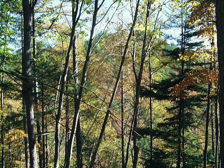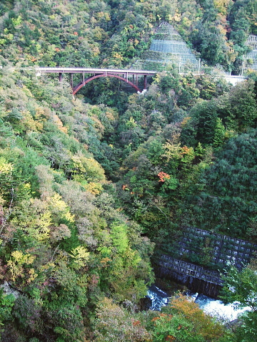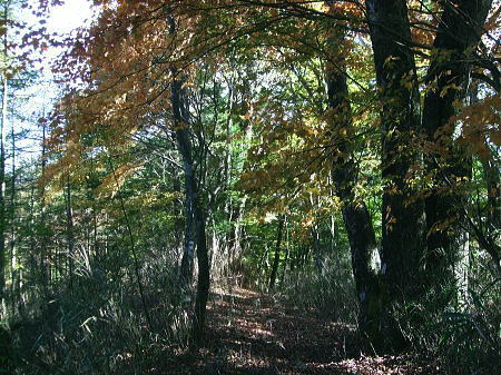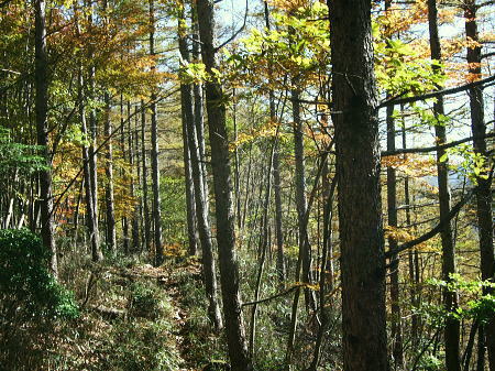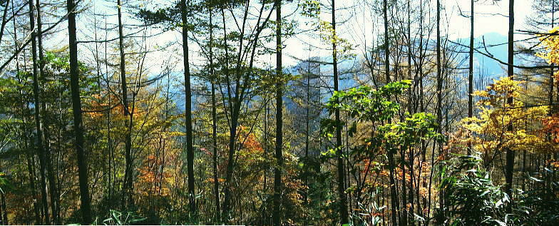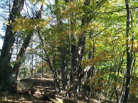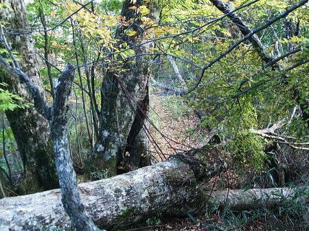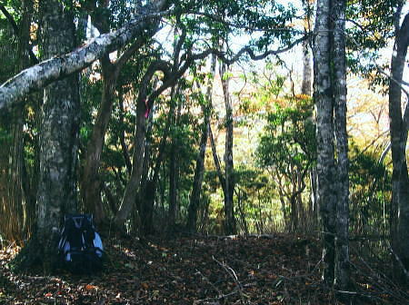 | 晩秋の南大菩薩連嶺の長峰と深城湖々畔からの.国道139号線のアプローチ.松姫鉱泉を抜ける 牛ノ寝通りを左に分け.米代の笹藪絡めの紅葉に溢れる長峰を下る。士室川拓道橋からは国道に沿いに葛野川線を下る 下山は深城川.シオジの森ふかしろ湖.深城ダム.竹の向.上和田.中湯(松姫鉱泉).そして最後は夜道は矢坪でヒッチハイクで拾われた。 小屋平から石丸峠牛ノ寝通り.米代 長峰から深城ダム・・松姫鉱泉.更に矢坪・ヒッチハイク=jr猿橋 紅葉のカーテンを透けての楢ノ木尾根北面 スズタケの激斜面を抜け長峰に入り.細い落葉松林の開けたた間から葛野川を隔て黒岳楢ノ木尾根が望まれる。大峰〜大樺ノ頭.雁ケ腹摺山から右下が大峠へ 米代長峰 牛ノ寝.米代10:30一11:20作業道に合わさる一11:40作業道分岐一12:00(1.290m末端地点.大):35一12:45木にロープ絡む地点 一13:00白草ノ頭一13:15ロープ.手前ピーク一地点一13:25「深城へ1時間」標識一13:35カネッケノ頭:45一14:157本山ノ神 一14:30手前ピーク一14:40(3等三角点)一15:20士室川拓道橋ゲート. 尾根中半は艶やかに透過光が溢れる 日が当たりの淡く鮮やかな樹葉.11:20勘違い 何を勘違いしたのか予定通りの時間で動いているにも関わらず.先の行程を考えると焦り始めていた。 1時間半ほど進めば尾根もなだらかになり距離を稼げる筈だった。その計算がふと途切れてしまっている。 後30分で正午になる。もう食事をしても好い時間だった。コンロを出せば又40分程時間を費やすだろう。 残りの長い尾根径を計算すると下山は大分遅くなる。その場の距離の計算では日没近くにならざる得なかった。 半ばから稼げる平坦な距離があることを忘れていた。 艶やかと云うより雑木の美林笹藪の急斜面を下ると傾斜も落ち緩やかな踏み跡になった。右後方からはっきりした作業道が分け込み. 「県道新30」の標抗にでる。スズタケの笹藪から逃れ.違った雰囲気の世界が開けたよう思え.雑木の色鮮やさが目立つ尾根になる。 秋色に染まる眩いばかりの色どりが枝々に色ぞえを添え.明るく煌めく光の妖精が踊り回っている。 足取りも軽やかに伸び伸び下る。この先1540m付近でも後方から再び作業道を分け入れていた。 空が仰がれ落葉松林 落葉松林を透し大峰と大樺ノ頭・雁ケ腹摺山地形図で確かめ地形を見る。平坦になると驚くほど距離が稼げた。そう思うとその先は時間を考えず気侭に楽しみ歩めばよかった。 現金なもので焦る気がなくなると今度は早く下るのが欲しくなる。立ち停まることも多くなる。 枝藪は少なくなり尾根の中程からは.時たま樹間の隙間を透し.牛ノ寝尾根や楢ノ木尾根の連なる山並が望まれた。 写真としては堰間に閉ざされた眺望。ガレ場のない尾根.望める視界は乏しく.仰ぐ空も狭まっている。 その狭い空間から見上げる空は蒼く濃い。 日の抜ける昼近くの落葉松林時には笹藪に被われ,荒れた枝切りや間伐帯を踏み,再び落葉積もる踏み跡になる。落葉を蹴り下る径, そして尾根の両側が落ち狭まればルートに迷うことなく安心感をもたらし地図を見る。そして居場所を確認し先を読み歩きだす。 踏み跡から分からなくなる所も多い。その時はちょっと丁寧に周りを観察して先を決めればよかった。 自分の決めたルートである。自分に自信を持てば何処でも歩むことができた。 黄葉が目立ち始める 1370m圏峰の手前のコブ尾根は中程になると自然林の紅葉は一層色鮮やかな色彩を放っている。陽光が大きな白雲の塊を抜け. 柔らかい陽射しを木々を透し照り付けている。樹葉はこの陽光と混合し透し合うが如く優しい色合いを跳ね返していた。 それぞれ違った色合いが重なり合う雑木の色彩が樹林に深みを与え.私に与えてくれていた。雑木の茂る森.そこに踏み跡が綴られている。 右下に下る作業道との分岐.11:401370m圏峰は右側を巻きV字の作業道分岐にでる。右前方の作業道の間に「県道新baP」の標抗が足元に小さくある。 左に上がり切れ気味の所を更に左へ巻いて.尾根上の繋がりにでる。その先は緩やかな起伏の下り径が続いていた。 その先は落葉松林に囲まれ気持ちよい落葉径に 南東に延びる平頂の下り肩.1290m圏の細長い台地の東端に昼食によい小平地を見いだした。 昼食タイム 幅広い尾根の1.290m末端地点.12:00〜:35取付きが10時20分.もう昼食にしてもよい時間だが.あえて1時間下り作業道を2本抜けた。そして昼食を摂ったのが1370m圏の末端地点。 定番のチキン野菜ラーメンを作る。具は何時もの生卵と餅..野菜は食器半分ほどの量と多目に取りラー油も持参した。 禁煙 今日は食後の一服がない。煙草の値上がりを切っ掛けに先月から禁煙している。禁煙して今回で3回目の山行になる。 ただ一人旅は初めての山行。何時もなら食後の一服を大地が乾いていれば寝転び.大空を仰ぎながら吸うのが常だった。 そして紫煙の昇る様を見詰めていたものである。寒く動きたくない時は膝に腕を乗せ.やはりじっと真近な紫煙の流れを見詰めていた。 単独行ではこの時が一番心の安まる時だっ
