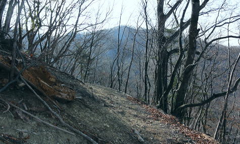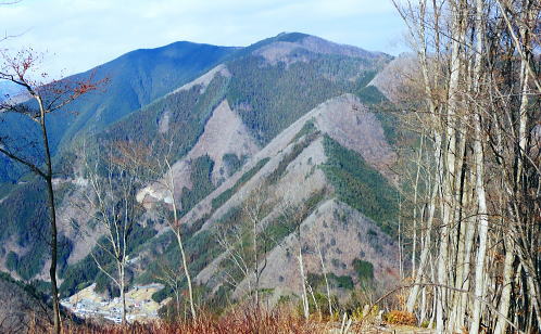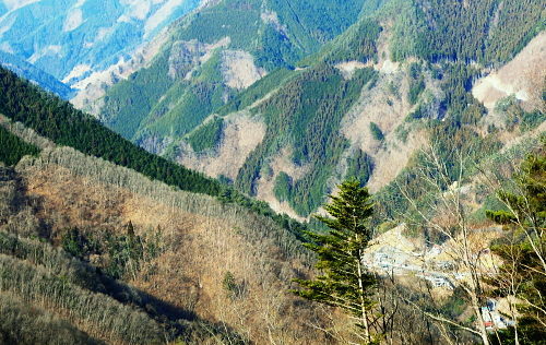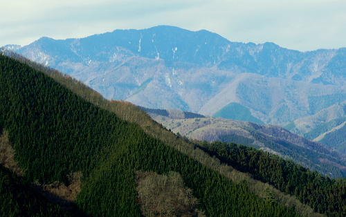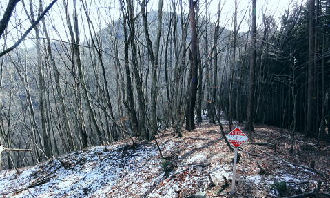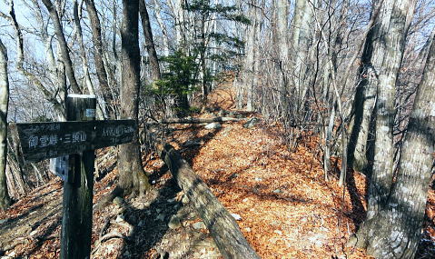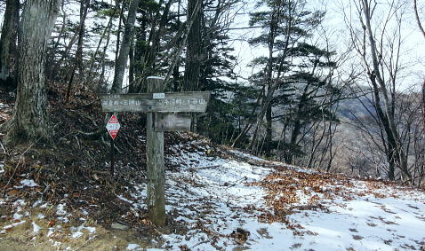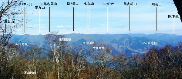 | 三頭山を南北に横断2. 三頭山境ノ尾根(シンナシ尾根)から牛飼尾根を下る ・・三頭山笹尾根Top 小菅川流域Top 小菅川玉川橋から境ノ尾根を詰め三頭山西峰―西尾根から牛飼尾根を下り.鶴川長作から阿寺沢入口bs 2011年02月02日.松村 玉川から入小沢ノ峰北西尾根(入小沢ノ峰シンナシ尾根).三頭山糖指尾根・・雄鹿 三頭山牛飼尾根から阿寺沢入口bs 三頭山 先月.鶴川の支流尾名手川を取り囲む尾根を歩み.権現山の頂や道中からは奈良倉山や鶴川を挟み対峙する三頭山西尾根の南面は広大な 側壁の如く望まれた。奈良倉山の真向いから見たイメージがあるせいか.やや遠くからも三頭山側壁に何本もの深い溝が刻まれ南尾根眺められていた。 権現山々行から2週間経ち改めて.その尾根群の中から1つの牛飼尾根を選び.3年振りに三頭山を南北に連なる尾根を横断する。 大寒を迎え朝方は陽溜りの南尾根を求めたかったが.バス路線の出発が遅すぎ.取付きの時間の関係から逆入山を試みる。 奥多摩湖の上流.小菅川の支流玉川右岸の三頭山の北尾根.境ノ尾根を詰めることにした。 前回は雪被る三頭山だった。田中先輩に勧められ.高尾から陣馬コースを歩む積りがだったが.三頭山笹尾根を末端の高尾山まで繋ぎ縦走した。 今回は頂でゆっくり展望を楽しみながら炊事を摂り.日向で寛ぎ.午後は牛飼尾根から鶴川の里へ下る積りでいる。 ただ里にでてから大羽根峠越えを忘れ.代わりに2週間前に訪れた西原の東端.阿寺沢入口バス停まで県道小菅上野原線を歩んでいた。 アプローチとしてはjr上野原駅発の富士急山梨バスの始発飯尾行に8時28分に乗車すると.山懐の取付きに入るには9時半と遅くなる。 その為北側の青梅線周りで入山した。jr奥多摩駅発7時38分発の小菅行.西東京バスを利用すれば.8時過ぎには境ノ尾根に取付けた。 三頭山の北面に延びる入小沢ノ峰尾根は幾つもの支尾根を派生させ.奥多摩湖.麦山浮橋から小菅川玉川まで広い裾野を扇状に持ち. 入小沢ノ峰尾根は中半で2つの大きな支尾根を分け.入小沢ノ峰から北へ派生する尾根と北西に派生する都界尾根のシンナシ尾根(境ノ尾根)とに分けていた。 小菅川出合からの渡渉は今は一面の氷が張り.見るも寒々しく出来ないでいる。。変わって新玉川橋からシンナシ尾根に取付いた。 又北へ延びる尾根は更にヌカザス山でムロクボ尾根とヌカザス尾根と2方に分け.共に奥多摩湖に没している。 又ヌカザス山1176mの1070m点肩からは西北西側に派生させ.境ノ尾根と並行するのが三頭沢ショウ沢中間尾根。藪径として小菅川右岸道に没している。 「晴れのち山・・時毒妄想」さんの記録 2014年1月に三頭沢ショウ沢中間尾根を下った記録によると540m圏で東の枝尾根に入り右岸道に入るが三頭沢出合の2つの堰堤の間を 抜けるのが厳しいようだ。立派な金風呂橋が架かっているが「通行止」になっている。又南岸に集落跡が残されていた。 又三頭橋を渡るとムロクボ尾根の登山道口があり.石段の上の道標がある。更に進むと奥多摩周遊道路の料金所跡地にゲートがあり. 右から苔蒸した階段を登り山道を右に進めば三頭山口駅跡にでられる。右奥に観光遊歩道が続いている。570m 595mでは休憩小屋の残骸を見て.北北東に延びる小尾根と谷筋の間を行ったり来たりして.610mで主尾根に乗り登山道にでられる。 遊歩道は左へ折れ続き.小さくジグザグに切り尾根につかず離れず小尾根を越えれば650mで終点になり.登山道に再びでられる。 50年以上前の1962年(昭和37年)1月に小河内観光開発によって営業運転を開始したロープウェー駅。川野駅と奥多摩湖対岸の三頭山口駅を わずか621.45mの長さで結び.66年12月に「冬季休業」という名目でそのまま運行を一時停止。営業不振により. 75年(昭和50年)3月に正式に運行休止申請が出されたとある。 何処を登るか悩んだ末.登路に選んだのはオートドックスな北西尾根で.880m圏で北側からの都県境界尾根と合わさせ三頭山まで詰めている。 又小尾根の境界尾根は小菅川右岸に没し大寺山を越えている。踏み跡はないようだった。小菅川右岸に至れば金風呂橋を渡るようなる。 玉川出合まで路線バスで辿り.シンナシ尾根の末端より詰めることにした。 初めは大沢山大茅尾根から直接.栃尾下ることを考えていたが「静かなる尾根歩き」松浦隆康著を読み. 牛飼尾根は「冬ざれの小風景や断片が印象的な尾根である。冬の姿の雑木こそ.冬の静かな力を宿っているようだった。」と 最後の結び言葉に惹かれ出向いている。一昨年.秋たけなわに訪れた長作を想い.街道を辿る楽しみも含んでいる。 旧青梅街道へ.奥多摩湖左岸の峰谷橋を渡る路線バス.7:592月02日(wed).快晴後曇 jr御徒町4:44=神田5:00=5:56立川:58=6:30青梅:50=7:28奥多摩.西東京バス.小菅行¥680. :33 =8:10新玉川橋bs. 路線バス 小菅行路線バスはjr奥多摩駅7時48分始発と大分遅い。それに合わせ東京を発つがも明け方の冷え込みはまだ衰えず。 ホームに列車が停まる都度.扉から忍び込む冷気に体を震わせていた。大寒波で裏日本では毎日の