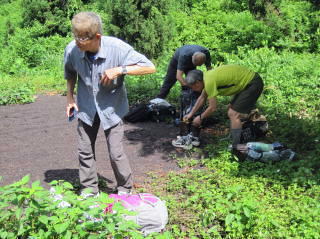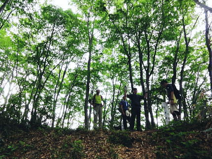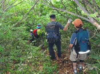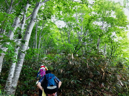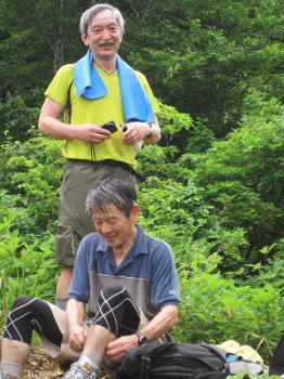 | 関越道の中越金城山と上州赤城山・・巻機山山塊Top 六日町を起点に竹永先輩の「百名山」を目指し.巻機山塊の本峰と里山としては深みのある金城山に挑む予定が少しよじれた山行になった。 翌日は朝から荒天に見舞われ巻機山は断念せざる得なかった。早朝からの雨堰が日本海側からドンドン南下するのを見て. 私は仲裁役に変わっている。.雨天の中.もう一の百名山.赤城山へ変更し酒宴になる。 2011年06月24〜26日.L滝島m見城.竹永.鈴木.松村 6.24.中越金城山.雲洞コース・・短パンと小アブ群 6.25.上州赤城.黒檜山と湖畔散策 関東地方は不安定な天候が続いていた。当日は梅雨前線が北上.新潟地方から東日本に掛け大雨警報がだされている。 新潟は最高気温29℃. 東京では昨夜我が家の上空に強い南風が吹き込み.夏とは思えぬウナる烈風が吹き付けている。そして今年初めて熱帯夜を記録した。 又翌26日には台風5号が東シナ海に入り.九州.四国では大荒れになる。前線に刺激された新潟地方は局地的に断続的な激しい雨に見舞われる。 竹永先輩が今年も税理士の全国大会に合わせ.百名山を目指し広島から上京。初日に入山の巻機山ピストンは時間的に厳しく. 昨年の浅草岳山行の前半に登る予定をしていたが登らなかった金城山に.まず登り.足慣らしをし.翌日巻機山へ出向く積りでいた。 それが天候の急変し諦めざる得なくなる。雨天でも如何にかなる.もう1つの百名山.赤城山に変更した。 本来は百名山の最終の岳として赤城山を残し.花火を上げる筈だった。 子持山に乗る天神尾根の残雪 翌年5月尻セードした肩の雪渓・・関越道駒寄PAを過ぎて高速道から.8:406月24日(fri).曇後雨 jr御徒町5:47=6:05東武池袋,急行:15=6:57若葉.全員合流=関越道.湯沢塩沢IC9:00=雲洞コース登山口P.二合目上9:35. 関越道 東武東上線若葉駅に7時,全員が集合. 高雲の層雲が大地を一面に覆っている。その中.関越自動車道を突っ走る。 天空は灰色の厚い層雲に覆われているものの.昨夜の吹き付けた烈風が中層の雲を巻き散らしていた。曇天でありながら以外と 高速道からの眺望はよい。左手には関越道を囲む北秩父の山並が連なり.それに続くよう昨年忘年会山行をした西上州の山々が望まれた。 高崎を過ぎると右手に榛名連峰の山並が.幾つものコブを乗せ.一山一山ははっきり描きだされている。 主峰榛名山から右端へと水沢山に延び.更に大きく右手に目を振ると.裾にはこれ又長い裾野を持つ赤城山が独立峰的な雄姿を構えどっしり構えている。 その中央を流れるのが板東の利根川沿いに高速道が綴られていた。そして渋川にでると正面に軍艦のように大地を跨ぐ大きな子持山が姿を現わしている。 その稜の中央ワインド辺りからは遥か彼方に谷川連山の双耳峰が遠望されている。昨年の今頃はこのメンバーで西黒尾根から入山していた。 頂の南肩にはまだ大きな雪田が残されていた。尻セードで天神を下った残雪も眺められている。 右側前方に迦葉山の円いコブが現れるとその先は上州武尊山へと導き出されている。豪雪に遭い野宿し.朝方は山寺で座禅勧められた迦葉山. 又このメンバーで.過って日光白根山の帰りに寄った.玉原の大ブナの森はその中程にある。 国境の山々が近ずきだすと左前方からは驚くほど大きくなった大峰山が構えている。 山陰には吾妻耶山が聳え.小出俣沢右俣の藪山がある。そして源流を尽きるとマナイタグラが現れ,山並の頂点に当る谷川岳に至っている。 この山懐は昔から春夏秋冬.季節を問わず歩き回り.国土地理院の地形図は赤線だらけになっている。 それは上越道を通る都度.若い頃歩んだ山域を見詰めては.改めて再起し望む.上州の山々でもある。 中越飯士山 建ち並ぶリゾートマンション群.越後湯沢付近.8:56塩沢大和線 清水トンネルを潜ると魚野川沿いに入り込む。上州側に比べるとやや気持明るい高曇に変わっていた。日にちに変化し崩れる天気. 今日は前線が南下する前に少しでも金城山の頂に近ずかねばと考えていた。山に入れば途中で必ず雨に叩かれるだろう。 後座席右車窓から望まれる風景は岩原のゲレンデ。上越道は飯士山の南裾を迎え.西側の肩を回り込んでいる。 積雪期にはナイフリッジを築く支尾根がゲレンデの左側端にあり.頂からストレートに落ちている。その尾根が正面が望まれていた。 高速道を塩沢石打ICに降りると高雲だった空が切れ薄日が射しだした。崩れる前の疑似好天,眩い陽射しが照り付けている。 もう崩れることは分かっていた。この天気を早く有効に使えねばと車は塩沢大和線を金城山の登山口.雲洞へと直進した。 割引岳と巻機山井戸尾根 塩沢大和線早川前の「ヤマザキ屋」の店先から.9:16割引岳と巻機山. 右がニセ巻機山と井戸尾根. 手前は金城山北之入コースと高棚コース. 高棚コースの裏が支流の高棚川になる。 前方に巻機山が聳え目指す金城山の山麓に入る。運よく早川手前で小さな「ヤマザキ屋」を見付けている。昼食用の食糧を買い込む。 ガランとしたケースには結飯6個