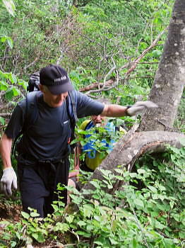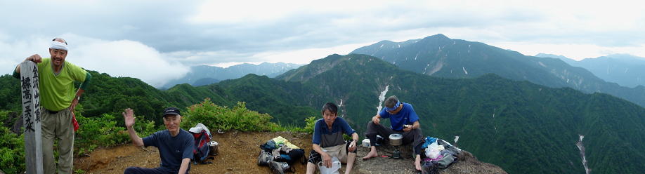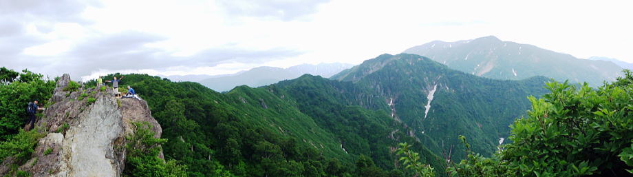 八合目前後から生い茂る煩い樹林の径脇にイワカガミの群生しているのが見られた。その群がる群生の密度は凄い。 歩む先々に右に.左に足元に咲き競い.群生の一房を見詰めているとその一輪に又華麗な小さな花の姿を見て意地らしくなる。 八合目先の「梯子坂」と呼ばれる細尾根の急登を過ぎて明るい台地にでる。三角点標石があり.長崎からの登山道の分岐になっていた。 少し下った窪地には板切れに「水場60m」の案内板があった。ここもズーとイワカガミ街道になっている。 南西方面・・ 上越国境稜線から信越国境 湯沢の街並みと一二峠.13:00右から鳥甲山,苗場山.下りて佐武流山. 左側は上越国境稜線の仙ノ倉山.万太郎山.谷川岳に吾妻耶山。 漸くして尾根は緩やかになり九合目「兎平」にでる。頂を前にしてここはブナ林の中だった。鬱蒼と生い茂る樹林帯. 頂はまだまだ先と思わす不思議な地形の場所だった。 右手に樹林が切れれば再び魚野川上流. 源流の山々や清津川を隔てた苗場方面が遠方の山並として眺められている。 霞が濃いにも関わらず以外と立体感を持ち.遠近を現す山並みで望まれた。1つの岳を見付けると綴るが如く.次の山名が頭に浮かび現れた。 短い間隔での休みが続いている。それでも時間通り.ラスト1本を頑張れば頂は目の前だった。 又やや風がでる。もう1歩で頂に立つ。ブナの切れた地点からは灌木混ざりの岩稜が目の前に姿を現した。 東面が望まれ.右手が抉れ落ち.登り返して越えた所で鎖場だ。越えれば頂に立つ。 巻機山北方稜線 ![]() 東側方面は手前のコブから金城山〜割引.巻機山.13:30〜14:20 金城山山頂1369mにイワキ頭1367.0mと1475m峰. その山蔭になるため大兜山.大割山は望められない。 割引岳に続くこの稜の左側(イワキ頭の先の北東側.)の谷間は五十沢川裏巻機渓谷の右岸にあたり.割引岳.巻機山と結ぶ厳しい登山道がある。 中央奥は牛ケ岳1961.6mと割引岳1930.9m.その陰に明日登る巻機山1967mが聳えている。 左奥が越後山脈で越後沢山に本谷山. 下津川山.奥利根源流の山々になる。下津川山の裏は見えぬ平ケ岳. 巻機山の右.井戸尾根を越える先が谷川連峰.朝日岳からの上越国境稜線へ。 金城山.頂の半分の狭い敷地 ![]() 左方から白霧が固まりが押し寄せる 山頂 後から追い付く形で待望の頂に立つ。ミソ汁.スープ類はないが美味いコーヒーを飲む。結飯を半分食べたところでコーヒーが届いた。 先に到着した仲間達がコンロの仕度をしてくれていた。食糧買出しから始まった今日の昼食はちぐはぐだが喉通しはよい。 やや狭い山頂に立ち背に体を向ければ西側に構える岩壁が石棚沢の谷底へ鋭く.それも垂直に抉り落ちている。ここ足元から谷底は覗めぬほど深い。 石棚沢は谷間の下流で高棚川と名称を変える出合は登川沢口付近になり.対岸の山々はガスで霞みだしていた。 起伏の激しい岩稜が割引.巻機山へ延びている。更にそこから右遠方は谷川連峰へと連ねる。 左遠方は越後主脈,本谷山や丹後山へと連ね.その先に越後三山がある。山名を確認する間もなく.一陣の風が目の前を抜けている。 左手の谷間三国川からは霧が巻き上がり.塊が追い風に乗ると.大きなガスの塊は大舞台で幕が閉じられるよう厚いカーテンに閉ざされた。 一瞬にして周りは灰色の世界に変わってきた。丁度1つの結飯を食い終え.メンチパンを齧り始めた時だった。 金城山 金城山南面に屏風のよう落ちる岩壁の頂に立っている。鋭く切り立ち.胆を冷やされるスケールの大きさに驚かさせられている。 正に石棚沢源流は垂直に落ちる屏風の大岩壁。それに比べ頂の表側は緩やかな藪に被われている。それでも里から見上げる頂は鋭かった。 対比するかのよう藪を漕ぎ.登り続けてきた登行は期待を裏切らなぬ頂になっている。 巻機山方面しか望めぬ頂は直ぐガスに閉ざされてしまったが.以外にも私達に神秘な気持を植え付け.満足ゆく頂として残された。 狭い頂に立ち.望めた眺望。天候から見れば一瞬の凱歌だった。一瞬だけに望めた周りの山々が脳裏に焼き付けられている。 そして大荒れになることも.又晴れることもなく.霧雲の湧き漂う霧粒は不安定に揺れ動くも.下山まで如何にか持ち続けくれていた。 ![]() ガスに包まれだした狭い頂 屏風の絶壁の対岸先は霞む飯士山 河原は登川沢口付近.13:49その後眺望はなくなった。束の間の眺望は細かい霧粒のガスが全てを埋め尽くし.灰色になった世界だけを動かしている。 風がやや流れる霧雨は小雨に変わっている。それでも頂には正味1時間ほど留まっていた。 一気に下る径.15:00往路を下山 13:30金城山.大14:20一15:15レモン:25一16:15四合目一16:45登山口=広域農道=旅館「龍言」=ダイヤパレス六日町.¥1000. 後は来た山径を下るのみ。重くなりがちな足を庇い両手で補佐し山を下る。掴む枝木が多いので助かっていた。 登り以上に急激に落ちる登山道。中1本でレモンを齧り里にでる。 トラロープ 谷間には所々に幾つもトラロープや鎖が据え付けてある。沢沿いは何処も岩崩れ混