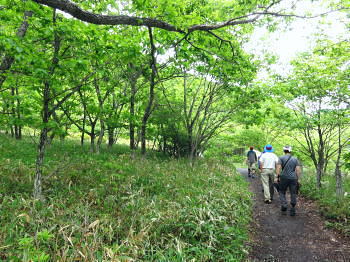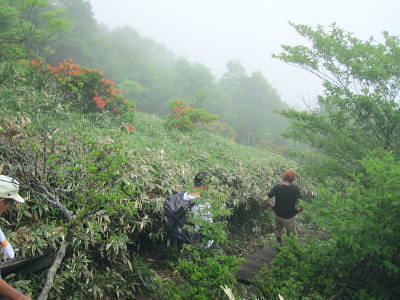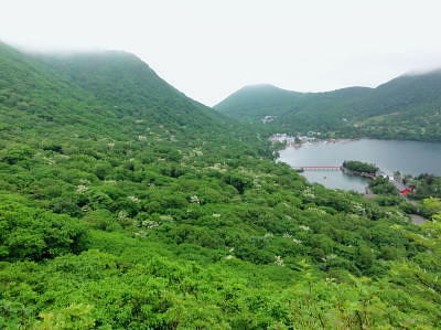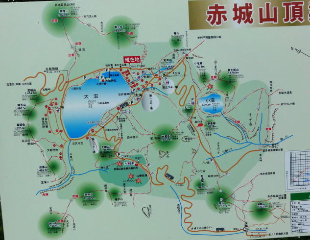 | 上州赤城山 2007年07月. 赤城山の湖畔を散策・・苗場山の帰路 2011年06月. 赤城山黒檜山と湖畔を散策・・越後金城山を下山して急遽 上州赤城山.黒檜山 八木原の黒岩邸脇より.2012.11上州八木原は渋川の南側の丘上にあり.駅で云うと上越線渋川の1つ手前になる。 遠望に優れ榛名山に大持.小持山.赤城山とそれぞれの独立した山塊に囲まれた台地にある。その山波を望む・・四阿山の帰路.黒岩邸横から撮影 越後から前線が見る見る南下するのを見て.荒れ始める巻機山を断念.中越金城山を下山してからは急遽百名山の巻機山から赤城山へ変更した。 沼田ICから赤城道路. 黒檜山登山口から赤城の頂に立ち.赤城神社から「みやま荘」へ・・湖畔を散策 同一m見城.滝島.竹永.鈴木.松村 6.24.中越金城山,雲洞コース 6.25.六日町から上州赤城黒檜山・・雨で巻機山中止・湖畔散策 天候 夜半.ガラス窓を叩き続けていた雨粒は朝方には治まる。5時ダイヤパレスのカーテンを引くと明るい陽射しが窓際から射し込み. 雲の切れ目から蒼空が望まれている。荒天が続くことで昨夜は巻機山登山を断念.百名山でもある赤城山に切り替え.酒宴を催している。 一瞬改めて登るべきか頭をかすめほど朝方の陽光が眩く照り付けている。ただ雨堤は越後の北方遠方に連ね.迫る勢いで望まれた。 改めて目指すには直ぐ行動に移さねば行動時間も読めなくなる。ただ2日前からの予報はほぼ予報通り正確に移り変わっている。 後1.2時間で山は再び荒れるだろう。昨日は以外と小太りの地形を持ち体力の消耗する山行だった。気象庁を信じ再び寝床に付く。 6時起床.天気予報は前線の南下を示し.十日町では今朝大雨警報が出されていた。前線が日本海から離れ近ずきつつあることを告げている。 ベランダにでて魚野川下流を望むと雨雲堤が綺麗に目に見える姿で近ずいきた。それでもここ六日町ではまだ朝の陽光が射し込んでいる。 以前クリスマスの頃.快晴無風の谷川岳に登り.頂で今回とは反対の南方から押し寄せる雪雲の前線が近づくのを見ていた。 雲堤を見付けてからが早く.遥か遠方の雲堤がアッという間に現れ地吹雪になり.蓬峠小屋に避難したことを想いだす。あの時は辛かった。 そうだ。あの時は別行動で谷川岳を越えたが.小屋には新津.中山.根岸に竹永先輩が居座っていたのを想い出した。闇の吹雪の中下山している。 6月25日(sut)霧雨 ダイヤパレス六日町8:20=湯沢IC8:45=沼田IC=国道62=10:05赤城山黒檜山登山口:20一10:50小11:00 一11:35黒檜山一12:50赤城ビジターセンター広場.車道=13:00戻る登山口=大沼湖畔食堂=13:45みやま荘. ベランダから国境の谷川岳方面.その岳を望むとまだ明るい霞みの中だった。これからはその空の下の清水隧道を潜り,目指す先は赤城山に変更した。 六日町より 湯沢ICより高速道を南下.清水隧道を潜る頃には霧雨が舞うようなる。ワイパーを使う。 昨夜2泊目をキャンセルし.赤城湖畔の「みやま荘」に改めて予約した。ここは数年前に苗場山の帰りに寄りワザワザ酒宴を催している。 K先輩の幼馴染が経営し.先輩の実家3軒目隣に住んでいた女将, 「しずちゃん」だった。昨日は晴れていたと云う。 清水隧道を潜り上州に入ると雲の切れ目はなくなり.再び重い雨雲が増し.降り始めた雨がフロントガラスを叩いている。 沼田ICから大間々赤城線(1/上旬〜3/末)へ。10kmの上越国境を越えるも前線は更に南下し続けていた。 赤城道路黒檜山登山口 10:20赤城神社湖畔の直ぐ上にある登山口 百名山を狙う広島の竹永先輩 雨足が早くなった黒檜山登山口の路肩に到着. カッパを着て直ぐ山に入る。斑に降る雨.樹林帯を綴っての尾根径を登る。 強まった雨も止めば霧雨に変わり.着たばかりのカッパを脱ぎ.一汗掻けば大沼が望める尾根にでた。 小地蔵岳 ![]() 尾根に乗り大沼の湖畔を望む.手前は赤城神社 ミズナラ.ダケカンバなどの広葉樹の急登.10:48 右下の大沼東畔の小鳥ケ島に鎮座するのが赤城神社・・10:34 左側は駒ケ岳からの尾根.中央が北山から右に登り小地蔵岳へ。見えぬ裏側が長七郎山.更に右に登り詰めれば地蔵岳にでる。 又北山の裏側には小地蔵から長七郎山へ通じる小沼を取り囲む尾根がある。 赤城大沼 駒ケ岳の裾野の先に大沼が見下ろされる。手前が赤城神社, 大沼を囲む山の起伏がカルデラ湖であることを示していた。 大沼の詰る先が覚満淵,その先の鞍部が鳥居峠.黒檜山を越えれば駒ケ岳からその峠にでられる。 ここで束の間の眺望に恵まれた。それも見ている間に山はガスに包まれる。 赤城山 私の赤城山に対する登山の予備知識は0に等しかった。概念もコースも掛かる時間も分からない。 ただ5,6年前に妻と南会津から金精峠を越え大間々に抜けたことがある。今朝車で走って来た街道は赤城山の東麓側を巻いていた。 一昨年はこの仲間達と苗場山に立ち.帰りに立ち寄り.大沼周辺の火口を散策していた。レンゲツツジが満開の少し前だったと思う。 その時広島からわざわざ出向いた竹永先輩が百名山を目指し.直前まで来て登らず.酒宴