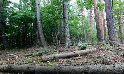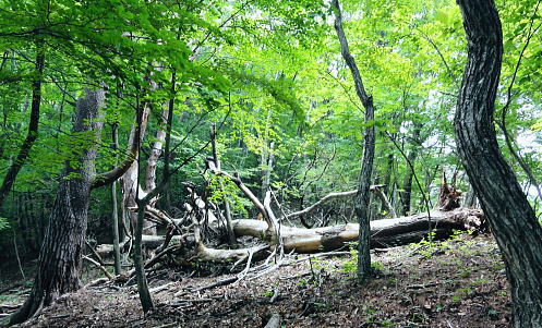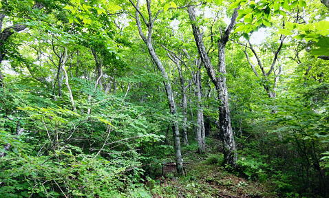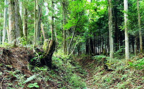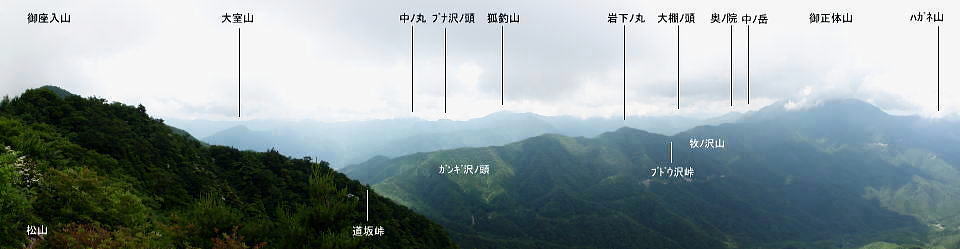 | 道志山域.今倉山稜からの北尾根群 ・・道志山塊Top 道志一部と丹沢山塊略図 2016年11月. 日陰舟北東尾根から岩戸ノ峰―ブドウ岩ノ頭から菜畑山.水喰ノ頭,御座入山長スラ尾根を下降.大旅沢より県道.馬場入口 2012年12月. ハガケ山大沢右岸尾根から北上し.文台山から尾崎山を越える・・富士急東桂 2011年07月. 今倉山稜1410m峰の北尾根右支尾根から今倉山北尾根を下り.猿焼山に立つ。「芭蕉待ち湯」から周遊 2017年06月. 今倉山稜1410m峰の北尾根左支尾根から道志二十六夜山西尾根を下り.引野田から富士急赤坂駅 2017年04月. 釣場bsから御牧戸山北尾根から大タギレを経て金波美峠―阿夫利山から金剛山北東尾根を経て富岡.奥牧野bs 2013年03月. 棚ノ入山北尾根から秋山二十六夜山―寺下峠から727m圏コブ北尾根・・jr梁川 2016年11月. 日陰舟北東尾根から岩戸ノ峰―ブドウ岩ノ頭から菜畑山.水喰ノ頭,御座入山長スラ尾根を下降.大旅沢より県道.馬場入口 今倉山稜の2つの北支尾根・・1410m峰北尾根と御座入山北尾根 今倉山稜の1410m峰北尾根右支尾根を詰め.入道P1コブを経て今倉山稜に立ち.今倉山西峰の北尾根から猿焼山へ北上する。 城ケ丸西肩からは戸沢川に戻り.「芭蕉月待ちの湯」に漬かる。 2011年07月09日.単独 1410m峰の北尾根右支尾根から今倉山西峰・・長い林道菅野盛里線を横断 今倉山西峰北尾根から猿焼山を越え.「芭蕉の湯」 先月の中頃に河口湖湖畔に没する御坂黒岳を南北に横断している。その折は松浦隆康著「静かない尾根歩き」を参考にさせて頂いた。 今回偶然にもその前ページに載る道志「今倉山北尾根から二十六夜山」の紀行文を読み.「芭蕉月待ちの湯」を起点とし1410m峰の北尾根を尋ねる。 「芭蕉月待ちの湯」から1410m峰の北尾根右支尾根を経て今倉山稜に乗り.御座入山北尾根から猿焼山に立ち周回した。 2008年12月に御正体山に登った折.道坂峠の北側に聳える2つの今倉山西峰と東峰を樹間越えを振り返る形で初めて見上げていた。 その茂みから見詰められた山容の感想と云えば全く好奇心も湧かず.気の惹き付けられぬ山波とは思えなかった。 当時は前道志から更に北方の桂川沿いに広がる背稜に初めて入り.道坂峠に立ち山伏峠から山中湖を経て三国峠を繋ぐことばかり考え. その余裕がなかったのだろう。それが松浦本を読み.道坂峠から望んだ今倉山の裏側からの山容と思い注ぐようになる。 「芭蕉月待ちの湯」をベースに今倉山の北面に連なる幾つもの北支尾根を見付けだている。 そしてその中から2つの北支尾根を結び周回することを思い付く。 今倉山の北面の尾根と谷 倉岳山々頂より.2012.03.04/13:294つの北尾根 今倉山稜を主とする山々の北面には4つの北尾根が戸沢川沿いに延び没している。 道志峠から今倉山に登り二十六夜山へ下る頂稜には登山道が綴られ.その東側の矢多沢に並行するが如く落ちるのが赤岩の西隣りにある1410m峰北尾根。 又西沢を挟んだ東沢との間には笹ケ原を頭とする北尾根がダイレクトに落ちている。更なる左隣には今倉山西峰の北尾根が猿焼山へとコブを連ねていた。 手前の西ケ原ノ台からは南東に支尾根を派生させている。何処も頂稜を含めた付近は.ミズナラ.ブナの巨木林が多く.心豊かなる尾根を創りだしている。 1410m峰北尾根は矢多沢と西沢とが分水嶺を成し.松山(赤岩)の西方の峰から戸沢へほぼ真北に延びる尾根。 尾根の中程には管野盛里林道が横切り.又直ぐ横では林道の延伸工事が進められていた。林道の両側から進められているが開通はまだ大分先のようだ。 戸沢川に没する末端にはツツジ公園があり.向かいには都留市の温泉「芭蕉月待ちの湯」がある。 ツツジ公園を抜け入山この湯館を起点に最短のルートで松山北尾根から御座入山に立ち.大旅沢と戸沢川東沢との分水嶺を成す今倉山北尾根を北側に下り. 猿焼山西尾根から「芭蕉月待ちの湯」に戻るルート。今倉山北面の2つの尾根を周回する形を取ることにした。 今日は一日中曇天の予想がでていた。青空が見えれば例年より2周間早い梅雨明けを迎えると。 その通り午後には層雲が切れ.それどころか雄大積雲が湧き上がる。蒼空が広がりだすと共に雷鳴を轟かさせていた。 7月9日(sut)曇後晴.後に雷雨 jr御徒町.始発4:36=神田4:41=5:43豊田.大月行:48=6:38富士急大月¥370. :53 =7:05赤坂.県道戸沢谷村線.タクシー¥2330=7:14「芭蕉月待ちの湯」. 杉の植林帯と作業道 ![]() 作業道と離れ.7:30 探せば何処もが薄い踏み跡に思える泥濘そうな斜面.7:46 1410m峰北尾根 7:14芭蕉月待ちの湯一8:20松山北尾根.枝尾根一8:40支尾根一8:50入道P1一9:10ミズナラの木:20一10:30山稜1410m峰:35 一11:20松山赤岩:30一11:35今倉山西峰:45. 谷村発電所と送電線都留線 予約したタクシーで赤坂の街並を過ぎ.菅野川左岸沿いに入ると直ぐ.高いところに送電線都留線が架かりそして戸沢川沿いを一直線に進んでいる。 谷村水力発電所(やむら)は都留市の街並の東端に位置し.最大14.700KW.水圧鉄管3本で大正09年に完成。 隣に大規模な谷村変電所があり.各方面に送電線を分岐させてい