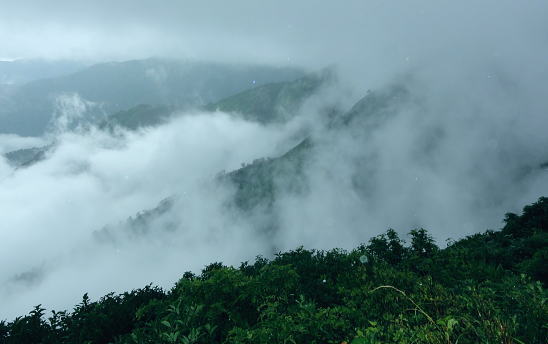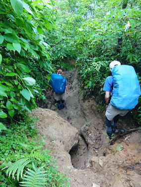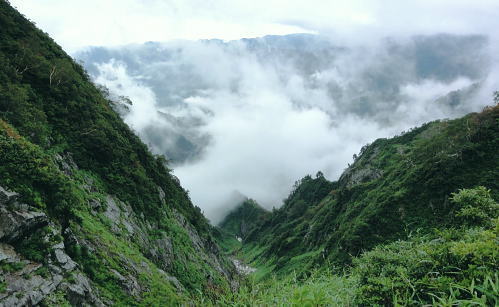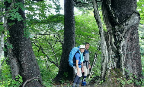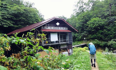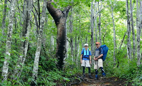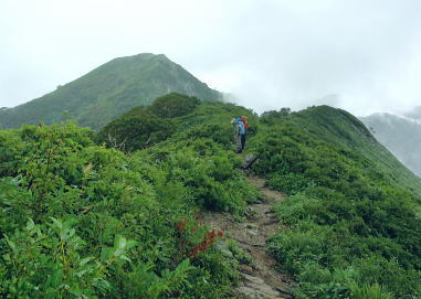 | 45年前に訪れた時は土砂崩れで白滝まで入れず.立木集落にあった立木小学校の分校の子供達に迎えられ入山している。 最終日も雨雲の山中.下山して雨上るも厚い雲に覆われる。大朝日岳避難小屋から古寺鉱泉 滝島氏の迎い車に恵まれ帰路は左沢.テルメ柏陵「健康温泉館」から小国街道.三国街道.日本海東北道.胎内.越後川口.関越道で鶴島IC 21日.泡滝ダムから大鳥池タキタロウ山荘T 22日.大鳥池から狐穴小屋U 23日.狐穴小屋から朝日避難小屋V 24日.朝日小屋から古寺鉱泉・・最後はブヨとアブ 24日.霧雨後曇. 4:30起床 大朝日小屋hc3. 6:15一7:10小:20一7:55古寺山レモン8:10一8:20三沢清水一8:50ハナムキ峰分岐一9:00一服清水:10 一10:10古寺鉱泉(T氏と合流). 夜半見下ろした送電線? 三度.目が覚める。夜半に一度外にでる。霧雨が舞い.闇夜はエレキに照らされた足元だけしか臨めなかった。エレキの光が霧粒を照らし出している。 玄関真向かいの小朝日岳方面に落ちる尾根を越え.その先をおぼろに広がる明るみが層のよう南北に帯びていた。 目を凝らせねば判らないほど薄い明るみ。足元から続く尾根沿いの茂みは暗闇で.天空に舞う暗黒一色の層雲との境がおぼろに望まれる。 その間の空間に不思議にも点で綴られる明るさが左手から赤.白.々.々と霞む闇に幻の如く小さく点されていた。 目でこれらの点を結ぶと一直線に繋がっている。恐らく山裾に広がる送電線鉄塔ではあるまいか。 地図で距離を追うと以外に距離がありそうだ。山を下り朝日川を隔て.横断する尾根を越えた先の裾野のようだった。 変わらぬ天候だが今は雨も風のうねりも治まっている。夜明け前の一時か? 夜霧が小屋を包み込み穏やかに舞っていた。 銀玉水と熊越の間で.6:35下山 明け方は今日も又屋根を叩く雨とうねる風と共に起こされた。下山の祝いに赤飯を炊き.茶代わりに氷砂糖水で体を温める。 出発は今日もカッパを被ることから始まっている。小屋番から携帯電話が繋がる場所があると聞き.アンテナの立つ所で迎いのT氏を呼びだすも応答はなかった。 緩やかに下る幅広い尾根。15分程で昨夜聞かされた遭難現場にでる。ケルンがあり遭難碑と小さな奥院の石塔があった。 この付近は乱気流が起きる所で足場が悪く滑落事故が起きている。小屋番は這松の向きを見れば相対している所があると云うが探すも判らず。 ここは荷揚げするヘリも通わぬ所。今日はずっと北風が吹き付け続ける雨雲の中になる。 朝日川右俣と遠方は御影森山に綴られる尾根 中央右が中ツル尾根中ツル尾根 明るく見え出した葉山小コブを越えて小朝日岳へ ![]() 小朝日岳と古寺山の尾根. 右裏が鳥原山になる ブヨとアブ 灌木混じりの痩せ尾根になり.コブを1つ越すとブヨが多くなる。ブヨはパーティーの列.先頭から中間のSでやや多く.ラストの私はブヨに酷く絡まれた。 煩く頭にまとわり付き腕の汗にも絡み付く。乱れたブヨ柱が私にまとわり.手で払いのけては叩く.そしてタオルを腕に巻き防ぎもした。 両腕に1ケ所ずつ刺されただけで済んだ。左腕は静脈の上に刺されている。 腰の所が白い小アブの「こすじろう」の襲来は入山.下山時に凄いと聞かされていたものの.古寺鉱泉付近で数匹に気が付いただけだった。 今回は用心の為.虫刺され軟膏を処方してもらい予防シートも持参するも.この天候では運がよいのか悪いのか? 最後まで使うことはなかった。 飯豊地区の小アブのことを川入の集落では「メジロ」と呼んでいる。 小朝日岳肩,向かいが御影森山の尾根 深く切れ落ちる熊越小朝日岳西側鞍部.熊越・・本流下流に朝日鉱泉があり.朝日川右俣黒倉沢のツメ ![]() 煩く舞うブヨを叩き振り熊越にでる。ここから鋭く黒倉沢の側壁が落ち.ガスを切った谷底には雪渓が雪白く見下ろされた。 この下流に朝日鉱泉がある。カッパを脱ぎ北側の巻き径を利用し.逆側の小朝日岳を越え小寺川沿いにある古寺鉱泉に下りている。 又学生の時に訪れたのはその手前の古寺川源流側の鳥原山を擁する尾根で.両鉱泉の中程にある白滝に下りていた。 古寺山を越え始まる黄葉 北の尾根を下る.8:20古寺沢沿いを見下ろす.中央付近に古寺鉱泉が見られる。 古寺山 古寺鉱泉のルートは根曲りで切り株も多い。古寺山の尾根にでて確りした登山道にでる。下ったコブが古寺山 ここは朝日連峰を含め周辺を見渡すには素晴らしい所らしい。幾つかの紀行文に,この辺は眺望は天下一品だと述べられている。 昨日は寒江山の頂からは望んだガスの切れ目からのパノラマでは右端に小さなコブとして望まれていた。今は360度の展望は濃いガスに包まれている。 頂中央の空地からは直ぐ傍の灌木林も判らない。身近な石を台にしてレモンを3つに輪切りにし.ここで酸っぱい甘さを味わっていた。 一時.花崗岩の抉り崩れた急坂を下る 不思議な造形を現わす巨木林達.8:40古寺山の下り分岐に至る尾根が気持ちよい。ブナの素晴らしい尾根が続く。老樹があれば巨樹があり.又場所により若いブナ林も茂る。 ヒメコマツの巨木林