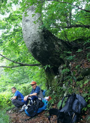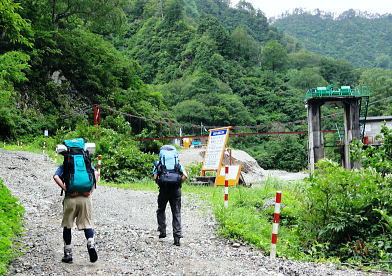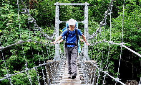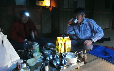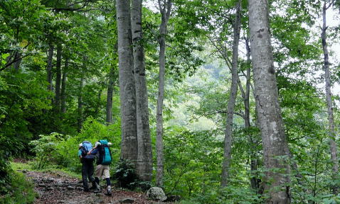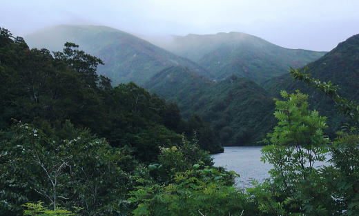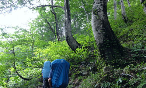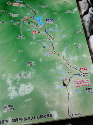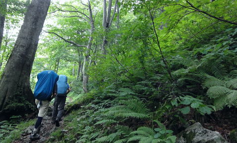 | 「青春きっぷ」第2弾. 45年経ち再び朝日連峰へ. 鶴岡から山形へ過っての逆縦走で南下を試みる・・朝日連峰Top 鶴岡.東大島川から左沢の最上川へ 以前下山した泡滝ダムから三角峰.以東岳.寒江山.竜門山.大朝日岳と南下し.古寺山から小寺鉱泉と左沢.テルメ柏陵 =胎内からは越後川口にでて埼玉の鶴島IC・・新たな会員バスと廃線の路線バス・・2011年08月20〜24日 L松村.m見城.鈴木.(滝島). 21日.大鳥登山口=泡滝ダムから大鳥池トキタロウ山荘・・赤サンショウオ 22日.大鳥池から狐穴小屋 23日.狐穴小屋から朝日小屋 24日.朝日小屋から古寺鉱泉=小国街道・・T氏の迎い車 朝日連峰 朝日連峰は越後山脈の北端に位置し.その東側には羽黒山.月山が聳え.更に東遠方には蔵王連山を含む奥羽山脈が連なる。 朝日連峰の南側には飯豊連峰.吾妻連峰と各連山が朝日連峰を取り囲むように連なり最上川.荒川の大河がそれらの山域とを隔てさせている。 又西側日本海沿いの山地は朝日岳の背稜から幾つもの支尾根を延ばす白神山地は日本有数のブナ樹林が広大な大地に広がりをみせていた。 南北に長い朝日連峰の核心は北部.以東岳からは西側に延びる桝形山まで真北に延々と支尾根を派生させている。 又荒沢湖西側には摩耶山が構え.尾根末端には庄内平野が広がり.鶴岡市内まで至っている。所謂長く連なる赤川大鳥川左岸尾根を綴る。 今年の夏山はこの大鳥川にアプローチを取り.過って入山した朝日連峰の逆縦走を試みることにした。 庄内あさひ付近 庄内バスは赤川左俣の東大鳥川の右岸を遡る現在はその東側面を流れる大鳥川沿いの長い林道は大島止まりで.その先は大分昔だが.下山した折泡滝ダムから延々と歩かされていた。 今回は会員制の小型バスを確保し奥深く入って頂いた。長大な連峰の割にはアプローチは大分短縮され.思いの外早く背稜に立つことができた。 背稜南部に位置する朝日岳から南・南西に延びる荒川の尾根を下れば五味沢の集落から小国街道.米沢線で小国にでる。 朝日の登山口であると共に一昨年入山した飯豊の石転び沢への登山口。 又祝瓶山を隔てた南西の尾根を下れば葉山の広大なブナの樹林帯から米沢に下りられる。 昔上杉景勝の家臣.直江義続によって開削され朝日軍道と呼ばれるのがこのルートだった。 朝日軍道 草岡から御影森山を越え,朝日の背稜に入り.三角峰(みすみ)から北上して尾根伝いに下ると戸立山.茶畑山.芝倉山. 葛城山.高安山.兜岩へと綴り今回入山の折.経由した荒川湖の東辺にある鱒淵に至る。 この尾根は以東岳からの東大鳥川右岸尾根にあたり.現在は大鳥川に山道は東大鳥川沿いには林道が築かれていた。 上流二俣の泡滝ダムからは新たに右岸沿いに登山道が築かれる。昔大鳥池から下山した折はその沢沿い上部の山腹を巻く 登山道を下っていた。今は廃道化されていた。 主尾根も今は廃道,藪に被われている所が多く.所々に朝日軍道の跡が当時の面影として残されている。 その思いを込め鶴岡から路線バス.繋いで繁岡からは会員バスを利用し.45年前は泡滝ダムから12kmの林道を歩んでいたが 今回は会員バスを利用した。そして初めての大鳥川沿いの新道から当時の逆縦走を試みた。 8月20日(sat).曇 jr新宿上越線「快速ムーンライトえちご」青春18キップ(¥11.500+指定¥500).23:10 8月21日(sun).小雨 =4:51新潟.日新線快速:56=5:19新発田.羽越本線快速=5:25村上.羽越線:56=7:35鶴岡.大鳥行¥1.360 7:42=8:35大鳥登山口(会員バス¥1.200)9:00=9:30泡滝ダム(鶴岡駅よりタクシー¥15.000位). 青春キップの応用 飯豊山に続き新宿発「ムーンライトえちご」に乗る。今回は羽越線坂田より更に北上し鶴岡にでている。新潟から鶴岡まで運賃は¥2500. 青春キップでは各々1枚分の切符が不足するため.車内で清算する形を取っている。車内で新たに高崎までの切符を切る。 運賃は¥1890. 0時過ぎてから初めて停車する駅は午前1時到着の高崎駅。高崎まで1人分購入することにより¥610の徳していた。 なるほど知恵比べか? 青春キップ利用法の本が出版されていたのには頷けられた。 登山口の登山コース図 ![]() 朝日連峰概略図 東大鳥川泡滝ダム.左が登山口 羽越本線 今日は日曜日と重なり何か行事があるのか? 羽越線は鉄道マニアに車内は溢れていた。 誰もが大きなカメラを構え.海岸線の左ボックスをひとり1人が陣取り独占していた。雨上がりの海岸線は重い雲が垂れ込んでいる。 山側は荒れた藪山が線路に平行するかのよう被い茂る。坂田を過ぎると何処も人を寄せつけぬ自然の間々の荒い起伏の地形が続いてている。 アプローチ 以外と質素な鶴岡駅前で路線バスを拾う。始発のバスの乗客は我々を含め4名.彼も終点まで行くようだ。 駅舎を外れると碁盤の目の商店街を抜けて.広い庄内平野を北上した。一直線に赤川大鳥川沿いへと街並を抜けて行く。 庄内あさひに入って湯ノ沢岳登山口のバス停をみ見る。その先に「大鳥池38km」の道標があった。 緩やかに緩やかに登る先への車道は下ることはなく.倉沢口あたりで前方を走る小型