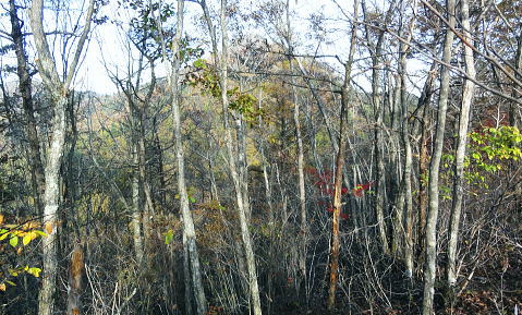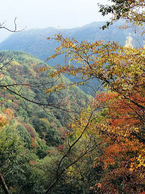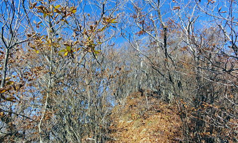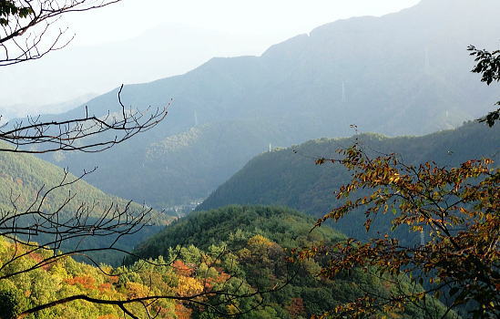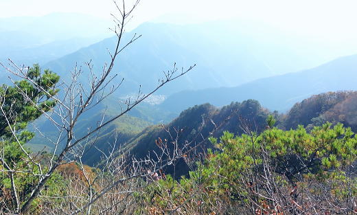 滝子山に係わる5つの支尾根 中央東線の車窓から穴沢出合神戸(こうど)付近.7:01滝子山を下るに当たり.朝方の中央東線沿線の車窓から初狩駅を過ぎた辺りで.朝日を浴びる滝子山南面が見上げられる。 滝子山の頂からは左方に南尾根と浜立尾根が望まれ.右は南東尾根と正面の滝子尾根。手前アップは北方川左岸尾根の末端. 葛野川線.笛駒線.jr大-勝線と各種の送電線鉄塔に.地元で発電された専用の小さな鉄塔も建つ。 北方川右岸尾根の末端に乗るのは葛野川線23号鉄塔と小さな笛駒線鉄塔群。 白い小さな鉄塔は葛野川線の手前を交差するjr大-勝線鉄塔。中央の鉄塔脇に甲州街道が走り.右上には中央高速道が横切っている。 滝子山 南面のどの方向から眺めても大空に君臨するが如く魅了されるのが大菩薩連嶺最南端の滝子山。中央東線の梁川駅ホームから 小さく望められた三角錐の滝子山は大月駅を過ぎると南側の山麓を廻り込み.車窓からは顎のでるよう見上げられた。 裾野から突き上げる醍醐味ある山容は.独立峰的な滝子山は低山に係わらず風格を持ち.誰もが仰ぐ頂になる。 私はつい最近まで,この滝子山とその周りの山々には気にすることもなく.列車の車窓から見過ごしている。 それが周辺の山々を訪ねるようになり.何処からでも望めるこの円錐形の独特の山容を改めて見直すようなる。 『大菩薩連嶺』岩科小一郎著では「この山は三峰よりなっているゆえミツマルと俗称され.柏木沢のツメ一帯の峰を浜立山と呼び. 1420mの仏岩で終わる。滝子.浜立間の大崩れのある尾根は笹子方面より防火線が入っており.それを利用する登山者が多い。 この尾根は南に水力発電の鉄塔が通っている遠見(トーミ.峠と同義)という鞍部まで一気に下り.峰山516mを起こして終わっている。 初狩方面から眺められる3つのコブも.山が近ずくにつれ鋭三角錐の山容に変わり見惚れるようなった。 笹子尾根周辺や東丹沢の鍋嵐周辺の藪に惹かれ.奥多摩.中央線沿線に足を向けるようなった。 そして大菩薩連稜に通いだすも.滝子山を知るようなったのは大分遅くなってからになる。 頂の三峰は三角点標のある東峰より中央峰の方が高く.北側は落葉松林.南面はブナ.ミズナラなどの自然林が多く茂っている。 狭く東西に細長い頂には左手の東尾根のツメに「この先危険」と目立つプレートが立てられていた。 又正面に.やや大きめな手製の山名標がある。 滝子山中央峰 雑木に覆われた最南端峰の三角点標石滝子山浜立尾根 14:20滝子山一15:05最初の岩一15:10下の岩一15:40(1200m地点分岐,10分ロス):50一笛駒線76号鉄塔 一滝子山登山口.林道大蔵沢大鹿線一林道大鹿線終点一16:50桜森林公園. 南方からの南大菩薩連嶺 滝子山々頂より下ってきた山並みを振り返る.14:18小金沢連稜に続く黒岳と,重なる白谷丸。右手に綴り大峠を下り返すと雁ケ腹摺山にでる。黒岳からの大峠は大きく. 丸い頂の破魔射場丸南東尾根のツメに隠れ望めぬが.長く延びる吹切尾根と林道奈良子線が山腹を横切っているのが分かる。 手前の鋭いのが大谷ケ丸本峰と右寄りに平沢ノ頭・・尾根は大谷ケ丸南東尾根になる。 遥か左奥は奥秩父連峰・・甲武信ケ岳.中央奥が雁坂嶺 左下に延びる尾根は日川尾根と重なり.今回入山した大蔵高丸南西尾根。ここからも202号鉄塔が大きく聳えるのが見上げられる。 眺望 大蔵高丸南西尾根.その上に建つ202号鉄塔は今回の山行では象徴的な建造物になっていた。 登り詰めた尾根上に202号鉄塔があり,この鉄塔を右回りに遠巻きに南下し南大菩薩連稜からは右手に見詰めつつ下った。 最後の頂,滝子山からも望んでいる。巡視路から藪山を漕ぎ.展望利く長閑な草原の縦走路を南下し. ここ最南端の頂に立っている。笹子峠の先は御坂の山域に入る。 滝子山の頂は爽やかな秋空の下.晩秋の仄かな赤味を帯びた午後の陽差しに染められていた。 振る返ると今まで歩んできた山々が重なり綴られている。そして北側の遥か彼方の山々までが鮮やかな紅葉美で飾られていた。 ただ明るく和み報いられた気持の反面。ここでもやはり南面は霞が強く.斜陽した逆光の陽差しを受けている。 頂に立ち,今日初めて見届けた中央本線沿いの御坂の山々は強い霞みに包まれていた。間近な対岸の山は薄いベールに包まれた見晴らしになった。 滝子山南尾根.(寂ショウ尾根) 尾根末端は吉久保の集落.14:28吉久保で隔てる笹子川の対岸は鶴ケ鳥屋山 手前.南尾根の右肩に登る尾根はお坊山東峰南東尾根。 笹子川対岸が鶴ケ鳥屋山.その上のガスが切れれば三ッ峠山.更に富士山と一直線に重なり望まれる。 白く霞む淡いカーテンに包まれた南稜は向かいの谷間.笹子川へ駆け下りている。数日前まではこの尾根を下る積りでいた。 難路として高度感はあるがホールドが多く確りしている為.一般道と変わらぬと聞く。そして南西尾根にルートを変えている。 浜立尾根と呼ばれ.本来は尾根一帯をその名で呼んでいたらしい。 「大菩薩連嶺」朋文社によると「浜立のハマ」は郡内地方の訛で阻むの意が