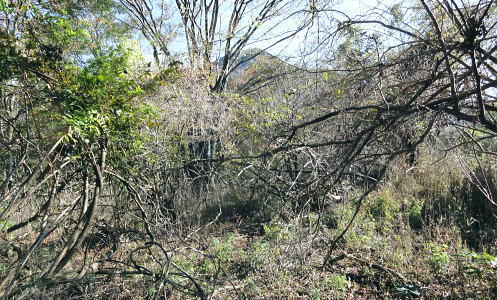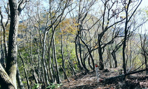 | 河内川左岸尾根・・西丹沢山塊Top 2013年04月.つつじ新道からガス濃く湧き上がる同角山稜から雨山峠越え.寄林道から宇津茂.寄bs・・西丹沢自然教室から玄倉林道・寄ユーシン線 大杉山山稜 2011年11月. 遠見山(戸沢ノ頭)西尾根から大杉山稜を北上―弥七沢ノ頭.穴ノ沢ノ頭.ヤブ沢ノ頭を経て板小屋沢ノ頭南東尾根を下降・・ズサ平ノ沢 2017年07月. 押出沢右岸尾根から穴ノ沢ノ頭.弥七沢ノ頭と主稜を南下―大杉山西尾根に入り.馬草山を経て中川温泉新土沢 新松田駅から初の西丹沢・・丹沢湖北岸の中川橋から大杉山山稜を北上 丹沢湖北岸を取り囲む大杉山尾根を北上し箒沢公園橋へ 入り江の中川橋.対岸の上平に乗り.遠見山西尾根を経て大杉山―小割沢ノ頭・弥七沢ノ頭・ヤブ沢ノ頭から板小屋沢ノ頭南東尾根を下降 2011年11月13日.松村 遠見山西尾根から大杉山々稜を北上・・湖上平 弥七沢ノ頭から平小屋沢ノ頭南西尾根を経てズサ平ノ沢 東丹沢と西丹沢を暫定的に東西に分けると酒匂川の支流.中津川を境に行政区域として.愛川町・清川村・伊勢原市・秦野市と 松田町・山北町・小川町・山中湖村とに分けられる。又北限は県境と相模原市に囲まれる山域で.丹沢には1年振り.初めて西丹沢に入る。 3年前の晩秋.表丹沢から入山し.丹沢主脈・主稜を南下し甲相尾根へと山小屋2泊で尾根伝いに縦走していた。 その時の私のHP「川辺と山径」から振り返ると不動ノ峰や臼ケ岳付近から玄倉川流域の紅葉満ちる展望が写真と共に記憶に強く残される。 西丹沢に連なる紅葉の山並が幾重に重なり合い.紅・黄色・緑と鮮やかに彩られ.錦織の蒔絵の如く映しだされていた。 その飾り立てられた樹葉の一葉一葉が陽光に照らされ.遠方からでも華麗に煌めきが眺められていた。 針葉樹の裾野を抜けた高度1000mにも満たぬ低山から始まる西丹沢の山並は灌木混ざりの自然林で描き彩られている。 この時期とは少し遅れているが.今朝訪れた山々は山肌を植林帯の緑とパッチワークの如く分け.ひとしを紅葉美を漂わしていた。 丹沢湖の入江.中川橋から遠見山西尾根を経て.大杉山の植林帯を抜けている。そして晩秋に差し掛かる紅葉樹林に覆われ.大杉山山陵を北上した。 湖畔では紅葉が真っ盛りだったものの.登るにつれ杉林を抜けた北稜は既に紅葉は錆びた淡い色合いに変わり.渋く色ずく初冬走りに染められている。 石棚尾根に乗ると既に冬木に覆われていた。残念だがヤブ沢ノ頭を越え.渋く染まる山肌に.入山から極端に変わる自然の厳しい姿を実感させられていた。 哀愁おびる河内川上流の板小屋沢沿いのズサ平ノ沢(板小屋沢).その河原に架かる箒沢公園橋に下りている。 河内川左岸尾根・・大杉山南山.稜湖上平 中川川の入江右岸の焼津付近の車窓より中川橋から植林された正面.左斜面を登り.湖上平600m圏峰から入山した。重なる小コブの先は遠見山.左にずれ大杉山が聳え望まれる。 隠れ小屋沢と右側は日向沢出合.その間の中央に遠見山の西尾根が延び.末端のコブが湖上平になる。 背景は604m点コブと馬草山. 重なる大杉山.遠見山.右脇には戸沢ノ頭と尾根を連ねて丹沢湖の北岸に没している。 大杉山山陵 丹沢湖の北岸に流れ込む河内川と玄倉川小川谷に挟まれ.北岸を取り囲むよう長く延びている尾根が大杉山山陵。 石棚山稜の南側にはヤブ沢ノ頭があり.南南西に尾根を派生させ.尾根の末端は丹沢湖に没している。そこを遠見山西尾根から北上した。 小さな入り江の奥の中川橋で左岸に渡り.戸沢ノ頭の西尾根に取り付いた。杉・檜林の植林帯を詰め.雑木から再び頂稜の植林帯に入っている。 大杉山を越えると低山の割に起伏は激しく.尾根筋は湾曲の複雑な地形を繰り返す.面白いほどの痩せ山稜が築いていた。 そこに薄い踏み跡を求め尾根伝いに辿っている。 尾根筋は自然林に恵まれ.紅葉の華麗さから最後のツメでは.枯葉の敷き占められた裸木の哀愁溢れる錆びの世界に変わっていた。 侘びさを想わす晩秋の風景に帳は早く.午後になると薄い日差しは陰りだしている。 4日前に東京でも寒気団に覆われ.今年の最低気温を記録した。それが今朝は弱い冬型になり.表日本は2日続けての小春日和. 10月の陽気に戻っている。小田原では21℃を記録した。 入り江になった中川橋バス停から焼津地区を振り返る丹沢湖 丹沢湖は8年の歳月をかけ1978年(s53年)に酒匂川水系の河内川に三保ダムの建設により出現した人造湖。 丹沢山系の西側に位置する。丹沢湖には玄倉川.世附川.中川川の3つの支流からの水が流れ込んでいた。 新たに永歳橋西詰に落合発電所が写真左端に建てられ,1978年4月に運転を開始している。水圧鉄管は埋められ落差は185.38m 最大出力7000Kで発電所の丘の上に落合線第一鉄塔が建つ。背景は対岸の南岸に聳える太郎小屋山と重なる栗ノ木日影山。 旧発電所は大又沢ダムと同じ1917年に運転を開始したが三保ダム建設に伴い移設された湖水に没している。 11月23日(sun)快晴 jr御徒町4:36=神田5:00=5:18小田急急行:31=7:04新松田富士急湘南バス:20=8:18