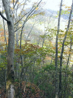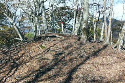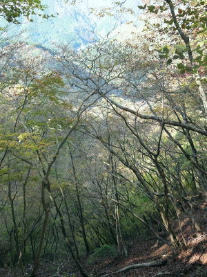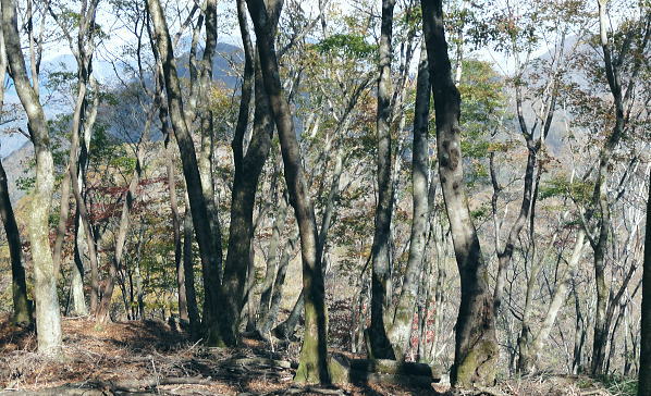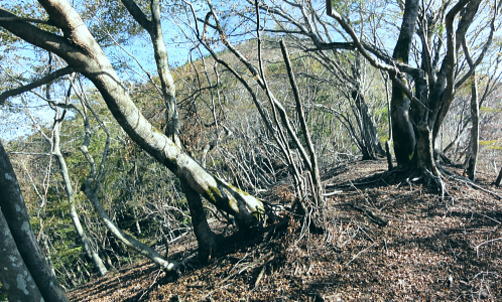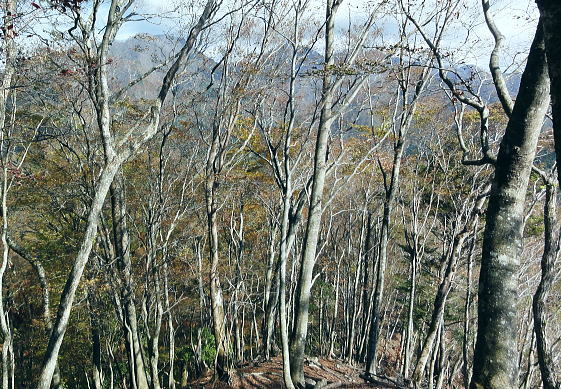 溢れ.零れるような幾つもの小コブを見ている。右手に尾根を取り.少し先で急に尾根が落ち込む所は左手が深田ノ沢湯ノ沢でガレ落ちていた。 下った所が湯ノ沢乗越. 登り返し北側から2つ目のコブで北西へ仲ノ俣乗越に下り.登り切ると撫ノ平956m圏の細長い台地になる。 ここから西に762m点を目指す尾根は冷静な地図読みが必要で.北へ向かうとやや右回りで弥七沢ノ頭956mに立った。 踏み跡は尾根筋らしくなり.又尾根が捩じれ過ぎているのがよい。眺望は利かぬが我が趣に叶う.面白い尾根筋が続いていた。 弥七沢ノ頭956m ブナ.ミズナラの囲まれた小広い頂.12:09撫ノ平を含め標高を同じようなコブが3つ連なっている。その真中の1つ先のコブで,やや遅い昼食を摂った。 1人でのコンロは久し振り.おでんが温まるまで.駄菓子袋から甘納豆を見付けほうばっている。 遥かなる感じの薄日を受ける昼下がり.初冬の日差しは既に弱まっていた。薄いベールを透す蒼空が大地に降り注いでいる。 ブナ.ミズナラのふくよかなる香りに包めれた台地。そこに坐って.大気を胸深く吸う。この先にもう1つの弥七沢ノ頭と呼ばれるコブがあった。 この頂956mのコブは昔呼ばれていた山名の「弥七沢ノ頭」。登山記録を調べると数は少ないが統一が取れず.各々の考えで延べられていた。 ここから真っ直ぐ北へ下った所が950mコブ.そして700mほど先で右手に回り込めば.新たに呼ばれだした950m圏の「弥七沢ノ頭」がある。 弥七沢ノ頭から西側に延びる長い尾根は枝尾根を多く派生させ.中川川沿いに広く落ち込んでいる。762m圏コブを経て藪径で下りられる。 それに比べると950m弥七沢ノ頭から南東に延びる尾根は単純なルートで仲ノ沢林道.穴ノ平橋を渡った所にへ下りられていた。 ここは又石棚山からの登山道口にもなっている。ただ玄倉まで長い林道歩きがある。 取付きから地形的に見ると後者の方が遥かに早く下れ.又弥七沢に水を集める源頭のもう1つのコブを最近「弥七沢ノ頭」と呼ぶようなった。 ただ表の街道.中川川側から見上げられている956m圏コブは昔から「弥七沢ノ頭」だった。 遠見山西尾根から大杉山山稜を北上・・湖上平 弥七沢ノ頭から平小屋沢ノ頭南西尾根を経てズサ平ノ沢 |