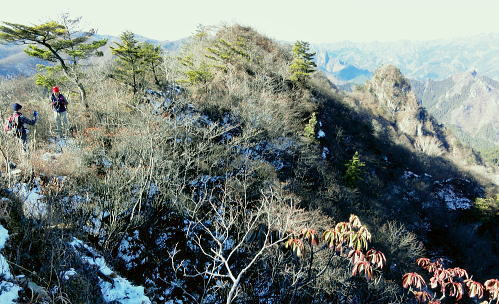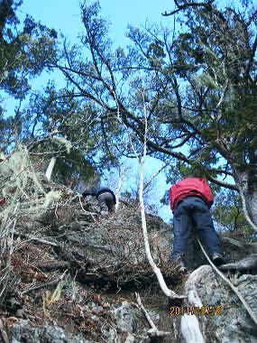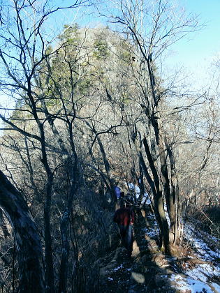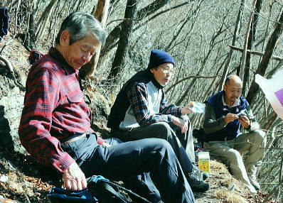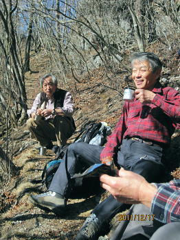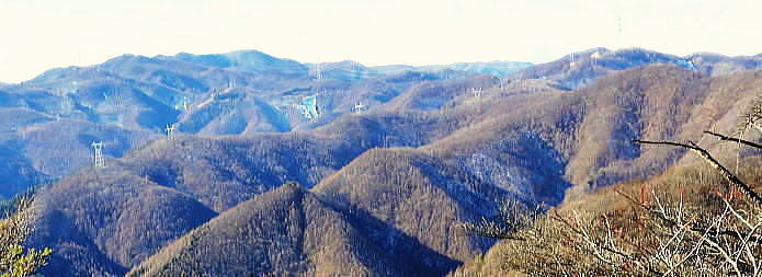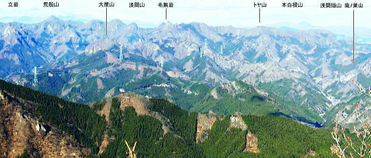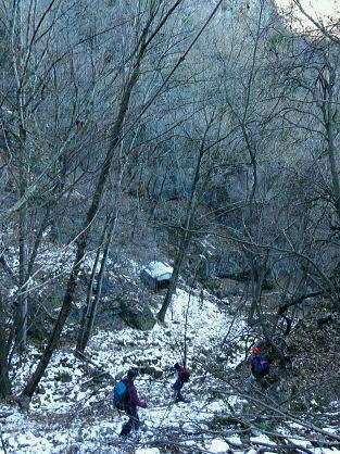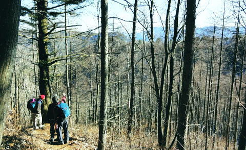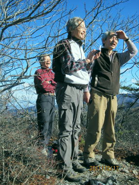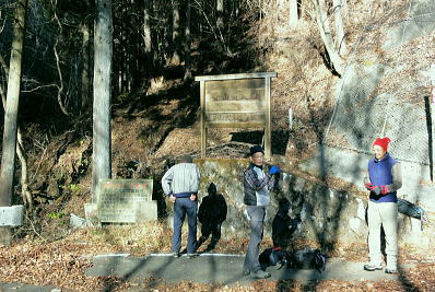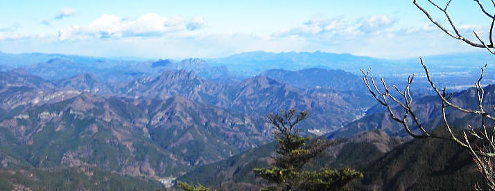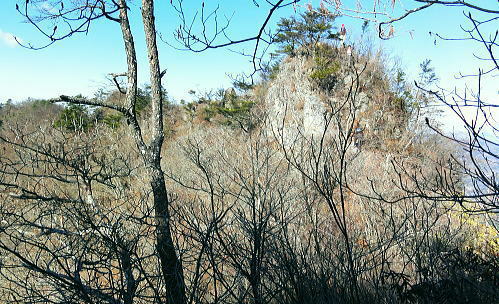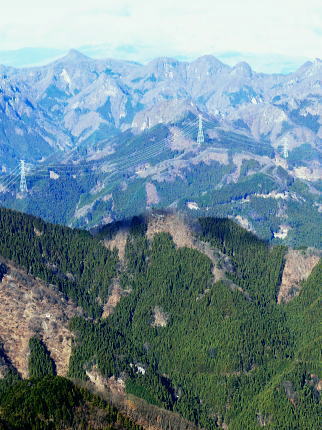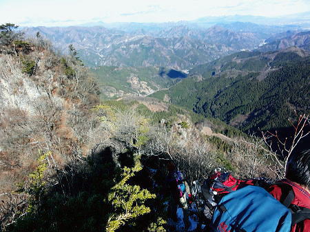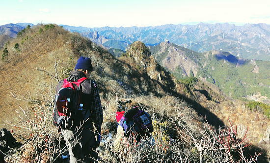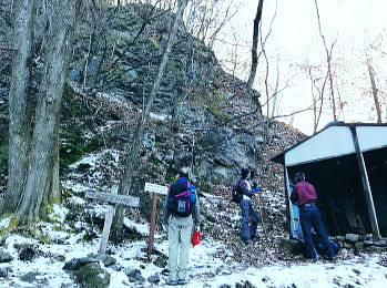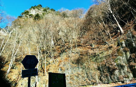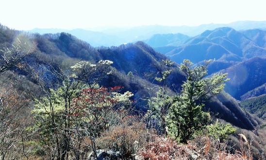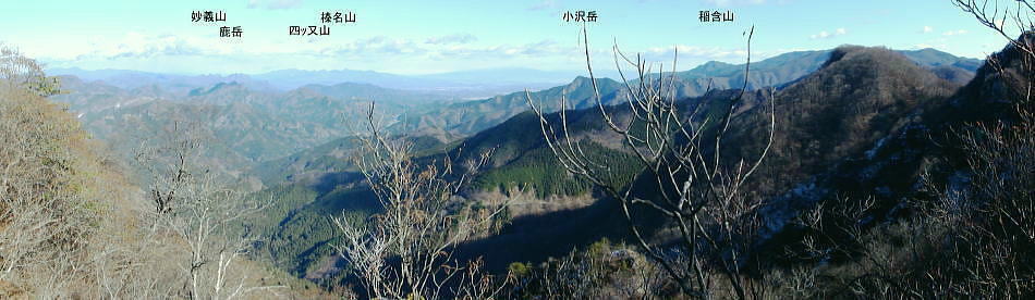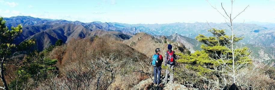 | 前日との対比.快晴無風の西上州の台地・・シラケ山.烏帽子岳 好天に恵まれ.濃紺の天空が開かれた台地. 天狗岩登山口から奇岩を連ねる日溜まりの岩稜と.そこから見下ろす山村風景 烏帽子岳.シラケ山は南牧川と神流川に挟まれた西上州のほぼ真ん中に位置し.甘楽郡南牧村と多野郡上野村との郡界尾根に連なる岳 大山北尾根を断念.天丸山へ 紺碧の空と天狗岩と烏帽子岳 12月17日(日)快晴 「やまびこ荘」9:15=9:10天狗岩登山口一9:50尾根上10:00一11:10キレット一11:30マル巻き道分岐 一11:40烏帽子岳:50一12:00分岐一12:05コーヒータイム:41一13:20二股廃小屋一13:35天狗岩登山口=「やまびこ荘」. 県道45号線の怪 天狗岩の尾根の東側を地形図で読むと塩之沢峠があり.県道45号下仁田上野線を越えている。 その中ほどの山腹にはふるさと林道湯の沢線.4.932mと湯ノ沢隧道.全長3.323mが2004年に繋がれた。 湯ノ沢線は南牧村大字桧沢を起点とし上野村大字檜原に至る林道で.暫定区間とされ.南牧村側の完成により県道標識が設置された。 隧道開通と共に幅員8m.2車線のゆったりしたバイハスは便利さから09年03月に供用するようなった。 故急勾配の狭い幅員5mの今までの県道は旧道になり.新たな林道が主役に変わっていた。 ただ道路地図はそれぞれ異なりるも現地の道路標識は同じものが立ち.少し混乱を起こさせる表示になっていた。 烏帽子岳の登山口は宿から今回登って来た塩之沢峠に至る旧道の途中にあり.その脇に真新しく県道45号線の標識が立つ。 2つの道路に同一の標識が表示されていた。それは今でも県道であることを示している。 又塩之沢隧道の上野村口少し手前には御荷鉾スーパー林道が接続している。上州と武州の境.御荷鉾山系を東西に横断する林道。 東京近辺では1番長い林道で群馬県多野郡鬼石町(林道東御荷鉾線)〜甘楽郡南牧村(村道羽沢檜沢線)間.延長67.1kmを結ぶ。 s48〜58年11月.幅員5m.冬季閉鎖は例年12/10〜4/20頃. 塩ノ沢峠を横切る旧県道脇 ![]() シボツ沢左岸の天狗岩登山口.9:13 登山口上.P脇の道標と絵地図.13:34 群馬県県道45号標識.下は(主)下仁田上野線・上野村楢原 入山 昨日とは異なりゆっくり宿を発ち烏帽子岳をピストンする。 風もなく穏やかな登山日和.快晴の蒼空に恵まれる。今日も登山者は私達だけのようで.山を独占していた。 不安だったS氏の足.具合が悪ければ天狗岩で引き返すと覚悟させるも.天狗岩まで行けば西上州の主尾根の縦走ができる。 冬型の気象条件の下.今日は上州特有のカラ風もない。好奇心を湧かせ展望のよい頂稜歩き.又下りは散策的な落葉が敷き占めた横道が待っていた。 猟師 旧道をそのまま塩乃沢峠に向い.タルの沢の林道口を左手に見て.更に遡ると天狗岩登山口にでる。 共に駐車した猟師の車4台の内の1台が一緒に登山口Pに並んで駐車した。 1人がここから散弾銃を肩に担ぎ.山で待ち伏せすると云う。3人は峠から追い込む計画のようだ。猟を聞くと猪に熊,鹿と何でも。 主は鹿が多いと。私達が烏帽子岳まで行くと伝えうと「天狗岩の手前だから大丈夫!」.「撃たないから!」と言葉が返ってきた。 二俣分岐 9:25タルノ沢の山腹道沿いに入ると途端,杉林に被われた沢沿いは朝の陽差しが閉され.斑な雪に広く覆われた。 薄暗い谷間の左岸沿いの小径を綴ると廃小屋のある二俣にでる。右手の尾根を取り二輪草コースを選んでいる。 まだ朝早く尾根上も陰り.何処もが残雪で埋め尽くされていた。 このコースは紅葉期がよく.又春先は天狗岩の尾根筋は二輪草が咲き競い.烏帽子の稜にはヤシオツツジが見事に咲くと云う。 下仁田.南牧の山々 天狗岩より.10:10中央左雲の中に浅間山がある。手前に東西に延びる谷間は上信国境へ続く田口街道が通っている。右下の谷間には宿から続く下仁田上野線 尾根の肩で1本取る。向かいの西面に明るさが増し.登れば直ぐ天狗岩にでる。樹林帯を綴り.抜けると突然飛び出す形で真近な頂にでた。 小さな空間の台地には石塔の祠があり.絡む枝木の切れた茂みの窓からは北面の眺望が開かれている。 最初に目に入ったのが東信国境尾根.続いて昨年同じ頃に訪れた四ッ又山だった。 ![]() 天狗岩の祠.10:10 シラケ山へ落葉松の鞍部へ.10:12 このコブの祠から少し進むと鉄製の橋があり.渡ると展望台があったらしい。 案内板もなく.分からず過ぎている。予備知識不足が前日と同様ここにも現れていた。 落葉の敷き占めた大地の鞍部を下り返すと岩稜帯にでて.烏帽子岳の巻き道.ピストンの帰路利用する横道との分岐にでる。 共に確りした登山道があるが道標類はなかった。やや煩い枝木を分け一気にシラケ山に立つ。 頂には三角点標があり.既に大展望の開かれる小高い台地だった。 烏帽子へ続く郡界尾根の岩稜帯.10:17 ![]() シラケ山(カヤドラ)1270mからの県境界尾根・・遠方左端の御座山〜右端の荒船山 手前左側が橋ノ台(藤畑)1264.8mで右奥がククリ岩(栗木立)1354.7m.更にその奥が県境に立つ広小屋山1484.4mになる。 中央はマルで奥が立岩. マルの右脇は小さな突起の烏帽子岳. その