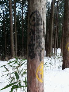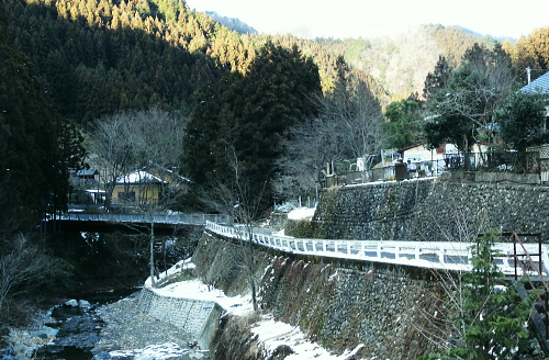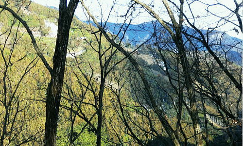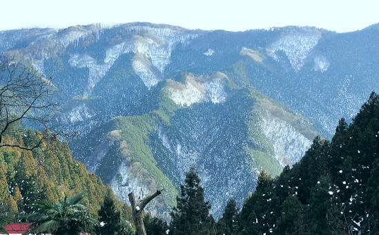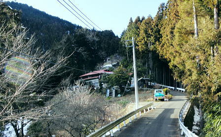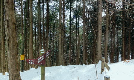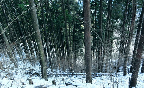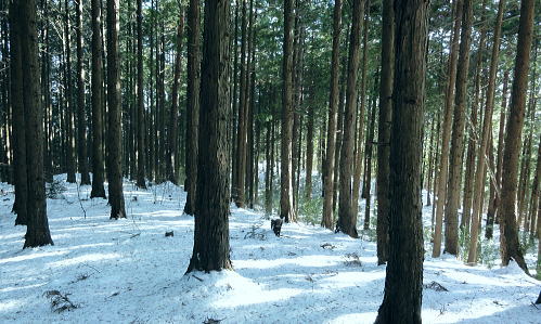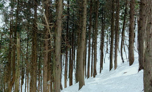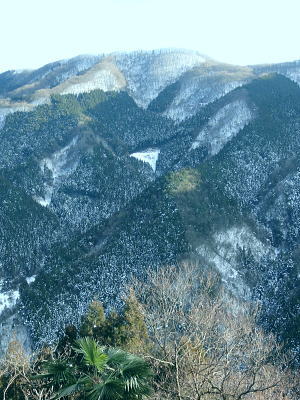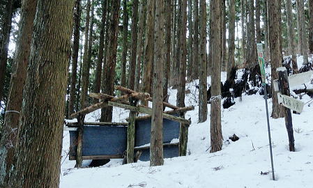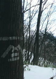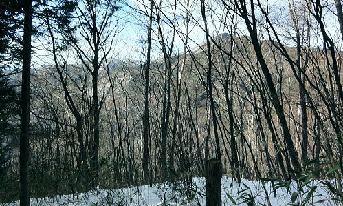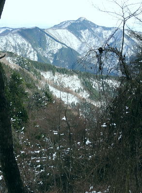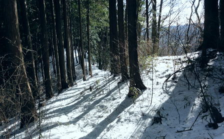 | 御前山の裾野まで続いたラッセルと日だまりの山上集落. 心地よいラッセルを味わい尾根通しを下る。・・水根本宿線.小岩 シゲクラ沢右岸尾根から惣岳山.御前山 湯久保尾根.湯久保山南西尾根.尾根通から小岩・・春雪のラッセル 御前山湯久保尾根と尾根通 湯久保「尾根通り」.2018.02/12:56初めての藤倉から入り浅間尾根を東進してバケモノ山を下った折.浅間嶺の展望台からの眺め. 尾根通し 「バリエイションルートを楽しむ」松浦本によると『湯久保尾根は御前山から南東に延び.神戸川と湯久保沢との分水嶺を成し.北秋川宮ケ谷戸付近に没する尾根。 この尾根の南面には支尾根をほぼ並行して派生させている。尾根上には山上集落が点在し.冬でも日溜まりを持つ明るい尾根。 「尾根の通り道」がそのまま地名になったもので.素朴過ぎるストレートな地名にも心ひかれる。』とある。 湯久保山から尾根通しの支尾根を歩むことにした。途中の人家を過ぎ簡易歩道にでるまでは雪藪でトレースはない。ただ抜けると日溜まりの 暖かさを感じさせられ.殆どの家屋は日溜まりを浴びていた。里道には雪解け水が流れ.明るさが満る尾根になっていた。 湯久保尾根に入る 御前山東肩の分岐・・栃寄.鞘口山.湯久保尾根の十字路.2:59湯久保尾根(御前尾根).尾根通(おねどうり) 12:05御前山.大:50一13:00分岐一13:10尾根に乗る一13:50⇔モーテ山. 一14:22湯久保山一14:45東尾根分岐 一15:17山上の家屋一16:00小岩bs:23. 東肩の分岐 御前山から東方へ町界尾根に綴られている登山道のトレースを辿ると肩の十字路にでる。 直進し,道標「大ダワ.大岳山」に従え目指せば1つ先のコブ(クロノ尾山)を越し鞘口山.九鬼山江戸小屋尾根の頭に乗る。 5年前再び山へ登り始めて奥多摩川苔山に登り.3週間後に再び鋸尾根から小河内峠大平尾根を下っている。 その折り高校生の集団登山に出会い.登り優先と学生達の待つ間をハッパを掛けられ登った山道でもある。 登山道の両側は植生の棚に囲まれての登りだった。今は全てが雪の中に埋もられている。 左に折れれば避難小屋から奥多摩都民の森を経て栃寄にトレースが綴られていた。 道標は「左避難小屋2分.湯久保尾根・小沢2時間20分」とあり.逆の右に折れ.主尾根を分けて杉の植林帯に入り込む。 御前山湯久保尾根 檜の急斜面をラッセルし湯久保尾根に乗る湯久保尾根 御前山から南東に延び.神戸川と湯久保沢・北秋川の分水嶺を成し.小岩に没するのが湯久保尾根・尾根通し。 尾根通しは湯久保尾根南面の支尾根で.尾根上には素朴な集落が点在し.浅間尾根と並行する疎林の日当たりよい日溜まりの尾根を下る。 分岐を離れると直ぐ檜林の薄暗い湯久保尾根の南側を巻き込む斜面になった。 確りした雪のトレースは登りの右岸尾根と同様.足穴深いトレースのルートになっていた。見るからに登っている踏み跡径。 降雪後,ここから下山した人はまだ居なかったようだ。 トレースはジグザグに切っている。勿体ないほど丁寧に綴られたトレースを下りということで押し崩してゆく。 両手を振るい.股を広げ.膝を曲げ雪穴を屑り落とす。雪塊がクッションとなり足には負担を掛けず.時にはトレースを外し下った。 トラバース気味に10分ほど回り込むと惣角沢(惣岳沢)と神戸川水ノ戸沢に隔てられた湯久保尾根(御前尾根)に乗る。 吊尾根と大岳山馬頭刈尾根 左後方の樹間の切れ目より.13:03手前が南東へ延びるクロノ尾山中尾根 湯久保尾根 本尾根(若緑山)に乗ると傾斜は緩み.南東に延びて尾根らしくなる。起伏もなくトレースを崩しつつ下る。 尾根上に変わり樹間の隙間が広がりだし.やや明るさが増してきた。 檜の樹海を掘るようラッセルし下っ行くと左手の立木越えからは中尾根に乗る大岳山が独特の山容で望まれた。 周りは狭い空間だがここだけは枝木が途切れ.邪魔されることはなかった。 頂稜の中程が中ノ岩山1107m南西尾根で.裏側は海沢谷側に915m峰か? 右隣りが山ノ神沢左岸尾根.続きドバノ岩山クドレ沢右岸尾根。 正しければ中ノ岩山の裏側は海沢谷側の915m峰になる。 手前が南東へ延びるクロノ尾山中尾根.手前の水ノ戸沢と奥の赤井沢との中間尾根で.合流して神戸川(かのと).神戸岩入口にでる。 作業小屋跡分岐 ここからトレースはモーテ山の東山腹を回り込んでいた.13:26小沢への道標 湯久保尾根は次第に南側に巻き込んで行くと起伏とも思えぬ雪コブ.若緑山を越えた。 ここは後日知ったことだが御前山から直接.御前尾根沿いに下れる踏み跡あるようだ。南方へ雪面を切りながら急斜面を下ると浅い鞍部にでる。 朽くれた原型を留めぬ小さな掘立小屋があり.「御前山ノ湯久保・小沢」と示された道標が脇にあった。又「←ユクボ」の板片がある。 ここで見る限りトレースは谷側に落ち込む雪原を巻いをり.見た目では谷底へ落ちていた。 神戸川水ノ戸沢と湯久保沢を隔て道標がなければ地図を見ても分からないルートになっている。 モーテ山 雪坊主と白ペンキので山名標もない小コブ.13:47モーテ山 南方に張り出
