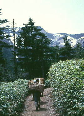 | 5月18日. 新宿23:45.\650= 9日晴. 5:02小淵沢:49=7:15松原湖7:42.千曲バス\60+15=8:00稲子 佐久の裾野 千曲川を右へ左へと綴り高原列車は登って行く。車窓から春の陽気な日差しを受け.カタコト.カトコタ走る。 牧草の生い茂る丘は裾の豊かな高原となり.立木には陽炎が掛かっている。 そして河原沿いの田圃にも.引き込まれたばかりの水面に朝陽が反射し.眩しく煌いている。 小海線小淵沢始発の列車は清里.野辺山を過ぎ.次第に通学の学生達でラッシュになった。 賑やかになった会話が車内に満ち.学生の笑い声が何か朝の明るい風景をつくりだしていた。 小海線松原湖の駅は土手の下にヘバリ付いたようにある。 その為.駅前広場に出るには30mほど土手を上がった高台でにあり千曲川の対岸になる。バス停はその高台にあった。 裾野の丘はここから開から明るく広がっている。 アプローチを楽しむには稲子バス停からがよい。途中の農家で水を分けてもらい荷車道を遡る。 バス酔いも納まり空腹感を憶える頃.道脇の落葉松林で朝食を摂る。空は蒼く澄み渡り.今日一日の好天を約束していた。 車道が交差する小径を20分ほど進むと幾らか尾根上になり,快適な山径に入る。 新芽を抱いた喬木に包まれ.尾根径は真直ぐ岳へ向かっていた。 登りと云うより平坦な草原状に台地は気侭に歩むなら.つい寝転びたくなる所でもあった。 松原湖〜黒百合平 松原湖7:42.\60+15一8:00稲子:15一8:30朝食9:00一10:10小:20一11:30本沢温泉:45一13:00昼食:35 一14:30稜線一14:45天狗岳15:06一15:47黒百合平テ1 山への一歩 三田をトップに意気揚々と歩きだす。 トップに離れまいとする新人の中川.関根.痩せた体で無我夢中で付いてくる。 時たま高畑の力強い掛け声が掛かる。掛かる前にちょぃとサイドに寄り.新人の顔をを見るのが面白い。 オッサンは相変わらずドスのある声を吐き。狐さんはカメラに納めるバックを探し々歩いている。 賽ノ河原と呼ばれる涸沢周辺を過ぎ.落葉樹や白樺の散在する木陰に入った。 樹間を透して硫黄岳のアルペン的火口壁が望まれる。蒼空に冴える残雪が眩しかった。 硫黄の臭いが鼻に付き始めるころ本沢温泉にでた。かなり早いペースだ。 本邦第2位の標高を誇る温泉. 先順を好む日本人にとっては以外な程.静かな孤高の温泉に思えた。 山径に入る雪径 本沢の裏から直接.根石岳にでる。 山径は日陰になると共に残雪の世界が築かれ.足がよく雪面に取られ潜りだす。 すると今までの淡々とした山径も急に競り上がり.うっそうと茂る原生林に絡みだしている。 又残雪の敷き占められた東面は針葉樹の梢が交わく.倒木も多いなってきた。 残雪は思いのほか少なく.楽に稜線に飛び出すと思われたが.勾配が急になるとペースは落ち一年生に夜行の疲労が目立ちだす。 1本取った昼食も食欲がないよう思われた。再びファイトを燃やし這松を漕ぎ.稜線にでた。 |