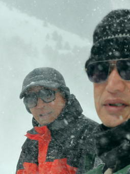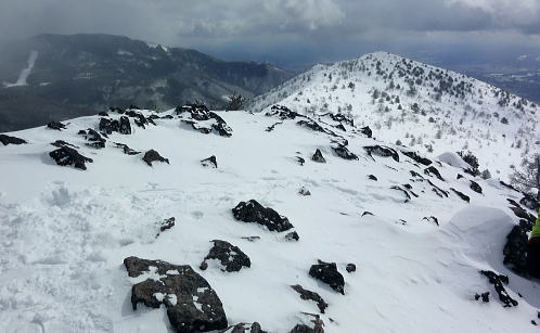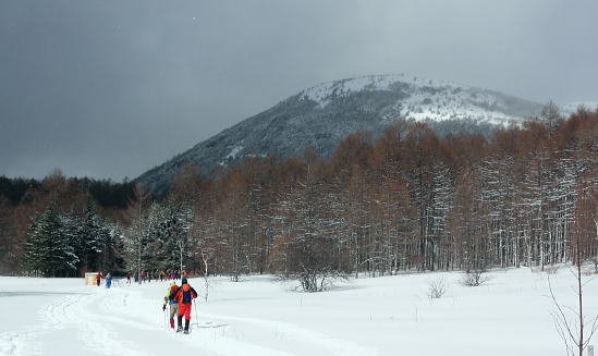 | 上信烏帽子岳・・山頂では雪雲堤と蒼空の気圧配置が連なる前線接線上にあり。仰ぐ スノーシューに替え.地蔵峠から烏帽子岳ピストン ・・休暇村鹿沢高原でOB会 2012年02月18日.L立松.m滝島.松村 2.17.地蔵峠から湯ノ丸山・・輪カンジキ 2.18.地蔵峠から烏帽子岳・・頭上の天空には冬型の気象配置が接線・確りしたトレースと硬雪のスノーシュー・白樺の一代 湯の丸山.烏帽子岳は浅間山系の最西端に聳え.周りには鹿沢・角間・奈良田と温泉地に恵まれる。 山名は古の貴人が被る烏帽子のような突っく頂上の形から.その名が付いたと云われていた。のんびり登り.雪とたわむれる雪山だった。 雪稜の烏帽子岳南面 高速信越道の小諸の裾野に下りて.19日/10:382004m圏峰から南へ延びる尾根.烏帽子岳の頭が仰がれる。右奥は湯の丸山. 湯の丸山 雪原化したアヤメの白窪湿原.10:38左端が鐘分岐への中分岐.前日は右手前方の湯の丸山を滝島先輩とカンジキでピストンしている。 翌日はスノーシュで左手の烏帽子岳へ。下山日は表日本側の高速信越道に入る。 2月18日(土)薄曇 北軽井沢9:10=10:00地蔵峠:30一10:40中分岐=11:30湯ノ丸山鞍部手前:40一12:10(2040m圏コブ)一12:30烏帽子岳 一14:00中分岐手前.大:30一15:00地蔵峠=15:25休暇村鹿沢高原. 天気予報は外れ.雲量の占める割合は高いものの.冬山としては明るく申し分ない天気。ただ眺望は望めぬかも。 今日は地元のガイド.後輩立松君の案内で.初めてスノーシュを付け山に入る。又スキーの仲間達は今日はゲレンデを変え鹿沢スキー場に向かうようだ。 地蔵峠でTt君と合流,早速林道に入り.初めてスノーシューを履き.浅間キャンプ場経由で入山した。 足に付ければスノーシュは以外と手に持つ重さとは異なり重さは感じさせず.軽く爪先を上げて前に進めばよかった。 スノーシュー ワッパの如く足を高く上げる必要はなく.歩む一歩で安心感が生まれ.少しぐらい重荷でも楽に歩めそうだ。 私のスノーシューはアルミ製のポールで全体が作られ.ワッパと材質は変わらぬものの足の大きさは倍ほどの楕円形の形をなしている。 底には鋸のような爪が3本付いていた。ワンタッチで付け易い。私の履いた種類はやや横滑りし易いとのこと。 材質と爪の種類,付け方等でスノーシュも色々選べられるらしい。価格的にも幅があり.価格@1万〜3万,借代は¥1000 ワッパに比べると段違いに潜らない。又頂ではカメラを構え.少し後伝えしようとした途端.後につんのめりそうになった。 足先が固定されバックは禁句。スノーシューを付けてバックするには大きく回り込まねばならなかった。 ストックは共に昨日リンクが落ち破損する。ストックも改めて彼に委ねている。 雪田 夏径には綺麗なトレースが雪面に刻まれていた。私の前を行くツァーパーテイ18名程がルートを確実なもにしていた。 トレースはキャンプ場を過ぎ.雪田化したアヤメの湿原帯を綴っている。白く眩い陽差しがサングラスを透す。空はまだまだ蒼い。 見上げる右奥に緩やかに丸みを持つ湯ノ丸山が望まれた。その斜面の一角の一部分に陽光が差し込んでいる。 日本海からの雪雲と表日本に広がる快晴の接点が頭上に流れている。雪舞う天候か.好天か.どちらに転がるか分からぬ場所にいた。 今は幾らか蒼空も覗まれている。早く崩れないことを祈る。頂での眺望を楽しみにしている。 前を歩むパーティは中分岐1925mで右手に折れ.大部隊が移動してホッとする。湯ノ丸山に登るらしい。 烏帽子岳の鞍部までは湯ノ丸山の南山腹をトラバースする水平歩道。トレースが薄くなり.新たに雪溝を作ってゆく。 湯の丸山と2040m圏コブ鞍部手前 11:371本取り.遠方は烏帽子岳.左前方で尾根に乗る 漸くスノーシューのありがたさを味わう。ガイドのTt君は途中.々で立ち停まり.周りの木々をうまく引き付ける言葉で説明している。 白樺と岳樺は非常に似ている。その違い,枝打ちされた跡から樹肌を見れば分かるとのこと。近親の繁殖と広がる岳樺の森。 白樺との交配は一代で自滅し育たないらしい。又落葉松林も多い.移植して広がったことにも聞き驚かさせられている。 鞍部で1本 鞍部手前で1本取る。まだ樹間を透す日差しはあり.樹冠からは蒼々とした空が仰がれるも.雲行きは雪雲が領分を広げだしている。 時折雪粒が舞う。山風に流されているのだろう。前方には灰色掛かった空と烏帽子岳の稜が望まれた。 夏ルートは鞍部から2040m圏コブの東面をトラバースし.南尾根に乗り.尾根を北上する形を取っている。 ここから見ると烏帽子までの稜は小さな雪庇が幾つも造られていた。例年ならもっと雪庇は成長しているらしい。 今年は降雪が少なく.この数年では半分の積雪量.何時もなら何処もが雪原化している筈だと云う。斜面はまだ灌木が斑のよう頭をだしていた。 2040m圏コブの肩に動く黒点が2つ望まれる。先行パーティのようだ。夏径を綴っていた。 2週間前彼はここ烏帽子岳に入山していた。その時は降雪後で2004m圏コブを直登し.倍の時間を費やしている。 烏帽子岳20