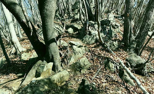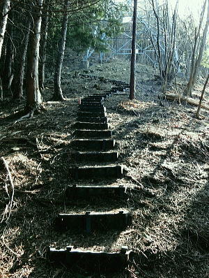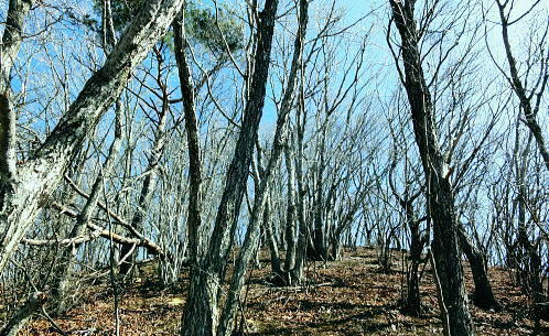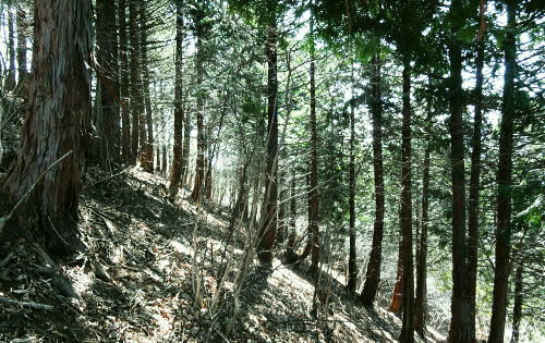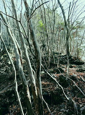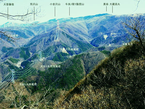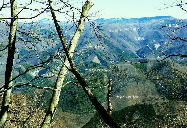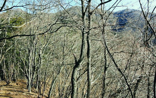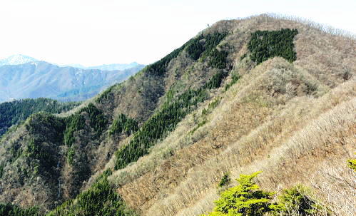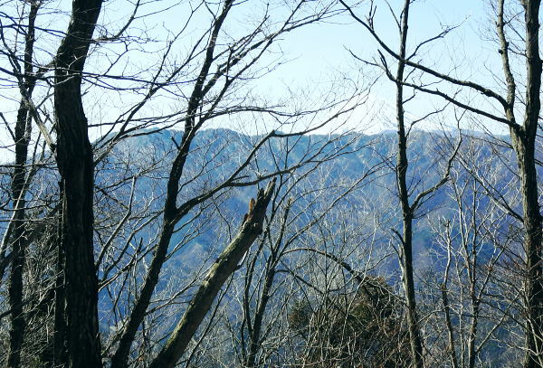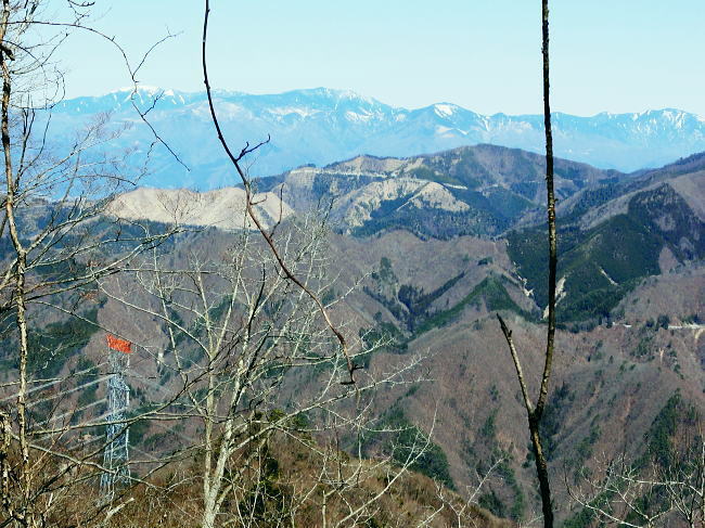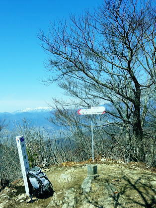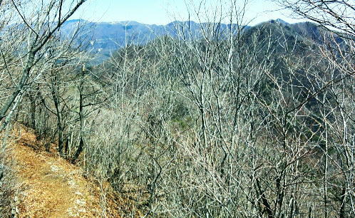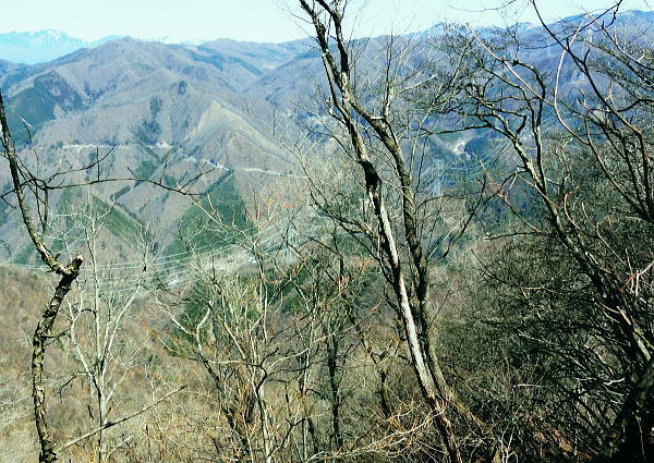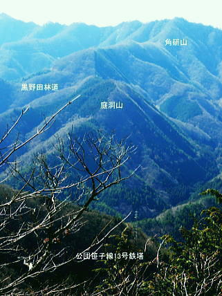 | 大菩薩連嶺最南の山.笹子雁ケ腹摺山20.を越える。jr中央東線.笹子駅から笹子トンネル越えの甲斐大和駅・・桂川笹子川流域Top 笹子御殿を挟む2つの支尾根. 朝方は笹子峠北肩を横切る日当たりのトクモリ南尾根から小路沢左岸の尾根を下り日陰の集落へ ヒオドシチョが踊る笹子御殿から笹子峠北脇の小路沢左岸のjr八-勝線の鉄塔尾根を選び.東支尾根を下る 2012年03月29日.松村 トクモリ南尾根から米沢山.笹子雁ケ腹摺山・・道路公団笹子線15号鉄塔とヒオドシチョ 笹子御殿から小路沢左岸尾根(jr八-勝線鉄塔尾根) jr笹子駅北側に広がる笹子川北岸には笹子御殿・米沢山・トクモリ1412m・お坊山本峰・東峰1421mと笹子川左岸沿いに連山が聳え. トクモリとお坊山東峰からは南方に顕著な2つの南支尾根を延ばし.笹子川のjr笹子駅.上流側を取り囲んでいる。 笹子雁腹摺山からお坊山南東尾根へは3年ほど前の師走に出向き.南支尾根と鉄塔枝尾根を下りている。紅葉真っ盛りの中だった。 その後.滝子山を取り囲む各ルートにも踏み跡を残している。ただ笹子川北面からの入山は何時も下るだけで今回が初めての登り。 朝方は冷え込みが激しい厳しさで.南面の日向斜面に入山を求め.トクモリ南尾根から笹子御殿に立ち.小路沢左岸尾根を下ることにした。 トクモリ南尾根 追分地区より見上げる2012.12.02/15:48裾野の枝尾根を横切る送電線は道路公団笹子線鉄塔群 笹子新田の集落から右上はお坊山東峰の南尾根と南東尾根 トクモリ南尾根 雁ノ腹摺山手前の展望台より変電所を発ってから笹子御殿の展望台に立ち.南尾根を真横より見下ろしている。・・10:50 3月29日(木)快晴・・トクモリから笹子御殿 jr御徒町¥1890=神田5:00=5:57高尾,松本行6:14=7:06笹子一8:10一8:25岩場前小さな鞍部:35一9:53トクモリ 一10:30米沢山一11:30笹子雁腹摺山12:00. 冬富士 まだ真っ暗闇の神田駅で中央線に乗り換える。 白みだした星空は電車が新宿を過ぎる辺りから次第に明るさを増し.阿佐ヶ谷を過ぎる頃.明け方の明かるさを取り戻している。 武蔵境付近で雪白き富士の全景を仰いでもいた。純白に煌めく富士の姿が周りの山並を従え.秀麗たる山容は一層大きく望まれた。 立川駅を過ぎ多摩川鉄橋を渡ると電車の左車窓からではなく.右側から改めて富士山がその姿を現した。言葉としては錯覚に覚える。 過って大分昔の話だが中央東線の長坂付近で列車がスイッチバックした折,やはり右側の車窓から秀麗たる富嶽を仰いでいた。 子供がはしゃぎ「富士山だ!」と奇声を上げていた。あの時も朝日を浴びる車内にいた。正月を餓鬼ケ岳で迎えるための車中だったと思う。 豊田に入り.朝の日差しが車内にも射し込むと眠む気を覚ますよう車内は活気ずき.雲1つない蒼空は今日一日の晴天を約束させていた。 今朝は大きな移動性高気圧の影響を受け.本州全土が束の間の晴天に恵まれた。 笹子の集落群 追分地区より.7:44中央の背は滝子山と花咲山 お坊山南東尾根と向い合せの対岸は石切山北尾根の末端尾根. 奥が滝子山.中央に霞むのがjr大月駅前の菊花山。 右端の坂道.林道は昨年暮れに48年振り南岸に入り.凍り迷った追分隧道への道。 甲州街道を西へ 笹子駅では久し振り,数人のハイカーと下車を共にした。暖かい日差しを浴び.駅舎前に集う姿は長閑な風景に見える。 駅舎から朝日を背に受け.笹子川右岸沿いに並行する甲州街道.R20号を笹子隧道に向かい西へ歩みだす。 街道右手の狭い歩道を歩むと直ぐ右手に.笹子川日向橋が架かっている。 お坊山東峰南尾根の取付きで.笹子駅からお坊山を周回して.この尾根を下ることを考えていたが距離が短すぎ諦めていた。 その先が妙心寺.朝日を真面に受けた明るい南台地の墓地を見上げ.お寺さんの正門脇には「江戸日本橋ヨリ二十五里」の石碑がある。 昨年暮れに訪れた時は左側の歩道を歩.「東京まで107km」と観光用の標柱を見ている。 タンポポ 明け方前に家を出ている。我が家の脇.タイルの歩道縁の隙間に一輪のタンポポが黄色い花を咲かしていた。 昼間は陽当たりのよい場所で.今朝はまだ街路灯に照らされていた。時期早々で珍しく見とれながら通り過ぎている。 この甲州街道の道路脇はまだまだ雑草も生えぬ殺風景な場所だった。常緑樹林以外は何処も裸木に被われ,庭先も裸の大地が多い。 米沢山とトクモリ南尾根 再び国道.甲州街道にでて.7:44取付きのコブ上に15号.14号鉄塔が建つ jr笹子駅舎から新笹子隧道方面に甲州街道を25分ほど歩むと街道の右脇に「公民館前」のバス停がある。 右側の川沿いには2本目の橋が架かり.先の屋影橋を渡り直ぐ左折し.細い舗装道伝いに辿ると追分の西側を抜け再び街道にでる。 大きく西側へ廻り込む街道を進むより早い。 やや高みに入り.振り返れば笹子川の支流.新田沢の谷間が大きく開かれていた。大菩薩嶺南端と御坂山塊北端とを隔てる大きな谷間。 左岸沿いの東南斜面は朝焼けも薄れ.カラッとした溢れるばかりの朝の陽差しを浴びている。 大沢山北尾根と中尾根ノ頭中尾根 追分地区より狩