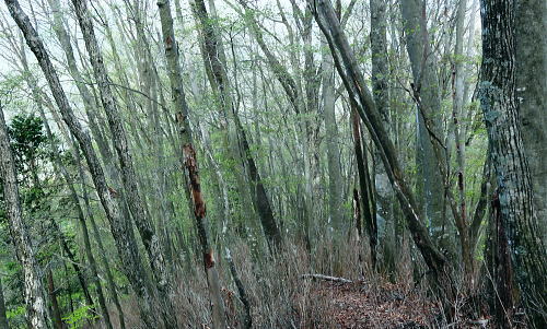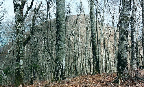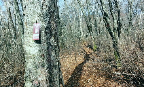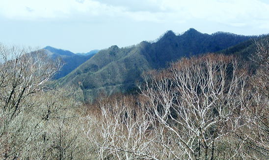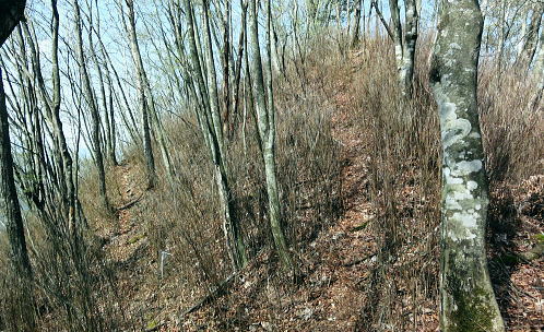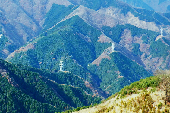 | 三ッドッケ横篶尾根.長沢脊稜.七蹴山と秩父大平山・大ドッケ・・秩父浦山流域Top 天目山横篶尾根から長沢脊稜を綴り.七蹴山を経て秩父へ。天目山林道大クビレを横切り大平山・大ドッケ 大ドッケ峠ノ尾根から末端の地蔵峠を経て浦山川川俣へ。秩父.峠ノ尾根からの展望・・仙元尾根の鉄塔群と新秩父線61号鉄塔 東日原から横焉尾根を詰め長沢脊稜を七蹴山へ 天目山林道から秩父へ。大平山の大クビレ―峠ノ尾根を下り.再び天目山林道にでて起点.川俣・・バス停のノビルとラッシュの街道 七蹴山・大平山の大ドッケ峠ノ尾根 有間山稜.滝入ノ頭手前より・・2020.11.26/10:28奥武蔵・鳥首峠から蕨山金毘羅尾根を縦走し下り名栗湖に下山した折に撮る。今回は峠ノ尾根の右支尾根を下山 七蹴山山頂(大麦スダレノ峰) 長沢脊稜のブナの老樹.11:50 境界石標と括れた標柱.1651m.11:58本番は大平山と峠ノ尾根ルート 11:50七蹴山一12:20天目山林道.大クビレ:40一12:54大平山一13:00分岐一13:12大ドモ尾根分岐一13:45二重山稜 一13:57独標一14:07大ドッケ峠ノ尾根一14:31東端鹿棚一15:00(61号鉄塔)一15:15地蔵峠一15:30天目山林道口川俣bs. 脊稜で一度.巻き道の縦走路と合わさり.七蹴山手前の鞍部から再び脊稜を歩む。そして七蹴山(犬剥簾ノ峰)の頂に立つ。 七蹴山の縦走路は南側の巻道を通っている。それ故踏み跡は確りしているものの.山頂の雰囲気は少し荒れていた。 奇形のミズナラの太樹が頂の前衛に構え.少し離れた木立には赤く錆びれた古い目出標と手製の山名標があった。 その手前には三角標石と朽れ読めぬ標柱が折れ.大地の北を向き置かれている。頂と云うより見た目は細長い平頂の手前肩になる。 写真で見る高みの脊稜を右に巻き込めば秩父に入り.休まず天目林道にでて.大キビレで1本取る積りでいた。 脊稜から離れ穏やかなコブを2つ回り込み下ると大クビレが現れ.又南に延びる七蹴尾根を下れば1時間10分ほどで大麦林道にでられる。 左.酉谷山(黒ドッケ)への脊稜 七蹴山西側の肩より見上げた眺望.12:03右は日向山ノ頭に重なる坊主山石楠花尾根 秩父大平山 脊稜から離れ2つ目の小コブより.12:14天平山との間には天目山林道の峠道が広がる,大クビレがある。 七蹴山から東北東に延びる尾根を丁寧に回り込み.落葉と共に崩れ落ちると林道大クビレの広い大地にでた。 林道天目山線大クビレ 林道を見て赤棒に向かい降りている.12:19左先が峠越えの大久保谷へ.正面が大平山の登山口 大クビレ 明るく開放的な野球のできそうな広場から天空を仰ぐ。ここ大クビレからは一段高くに天目山の頂に聳え.3つコブが2つに重なり望まれた。 大クビレの南寄りの林道脇の木陰で大休止する。今日も時間を有効に使うためテルモスを持参し.オニオンスープにカツサンド.野菜サンドを摂っている。 手際よく食欲を味わいう間もなく食後の一服とコーヒーの香りも味わっていた。 天目山林道(細久保川林道)は広河原逆川林道の支線で.現在はダートを含むピストン林道。 終点の川俣橋から細久保谷沿いの先2.6kmはジーコ平. 細久保橋にゲートがある。そこから更に0.6km先に起点の標識がある。 ここから更に支線を分け.仙元林道は仙元峠と云うよりも天目山方向側に回り込んでいた。 本線は七蹴山と大平山の鞍部. 大クビレを越え大久保谷の源流を巻き込むよう下れば矢岳1357mの南裾まで延びているようだった。 誰も居ない大地に子供のよう大の字になり.一人でいられるのがいるの嬉しかった。満足感か? 真っ青な紺碧の天空が目の上を覆っている。 藪山だけのどうと云うこともない山だが比べて見るものでのななかった。ここは素朴な里の裏山のような気持ちを起こさせている。 偶に野鳥の囀りを聞くも.静か過ぎる場所。何処からも他に発する音色は聞こえず。何故か? 自分でうなずき体を起こしている。 ここからが本番だった。長いアプローチも初めてのコース。巻道を通らず天目山の頂を通し.眺望をも楽しんできた。 長沢脊稜は尾根筋を歩んでいる。その間を綴る縦走路では2人の単独行者と擦れ違ってもいた。 蕎麦粒山と天目山(三ッドッケ北峰シャクナン尾根と中央峰) 大クビレより.12:20細久保谷を遡る天目山林道が横切っている。二峰の間に頭を現したのが川苔山. 野草が漸く大地から顔だし大クビレの端で.寝転び煙草を吸っていると単独行者が大平山から下りてきた。ビニール袋を片手に持っている。 人と遇うとは全く思っていなかった。驚き何処から来たか尋ねると大平山の頂に立つことを目的に.林道をピストンして来たと云う。 山の登り方には色々あり.私とは全く違った思考で同じ頂に登っている。ただ登りたい感性は私と同じだと思う。 のんびり林道を戻って行く彼。別れてから私もパッキングを済ませ.改めてザックから地図と磁石をだし軍手を持つ。 寂峰の大平山 新・旧重ね吊られた山名標1903.0m.12:54大平山 大平山稜に入る。大クビレを横切ると確りした踏み跡が大平山まで続いていた。一気に登り頂に着く。 小さな小平地.木の枝に木片に書か