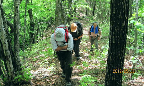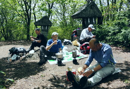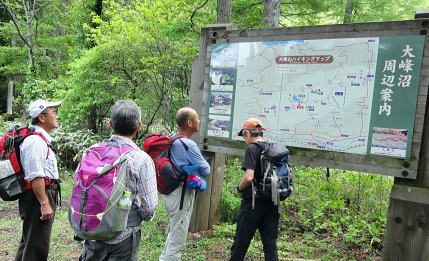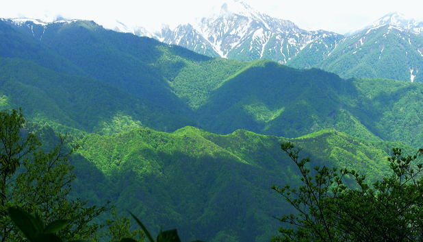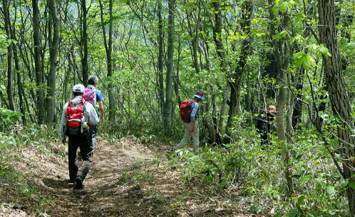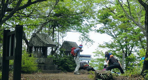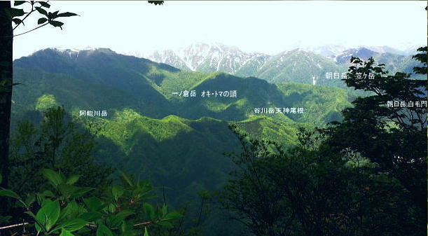 | 赤谷川流域下流の南端の山々.大峰山と吾妻那山. ・・赤谷川流域Top ・・赤谷川左岸尾根末端地形図 翌日は安定した陽射しに芽吹き始めた赤谷川流域の南端の新緑の大峰沼から大峰山.吾妻耶山を周回する。 L見城m.滝島.鈴木.松村.田島 迫る雨堤にデポし.白毛門ピストン 大峰沼から大峰山.吾妻耶山を周回・・谷川連峰の展望と山ビル 宿.湯檜曽温泉「湯の陣」は湯檜曽川右岸の河原台地にあり.部屋の大き過ぎるガラス窓からは裏山に溢れる新緑と尾根裾が望まれている。 窓枠一杯に新緑に萌える若草色の山肌が緑の壁を創り.窓縁から溢れ出すよう飾り立てられていた。 見上げる尾根筋には2本に分かれたJRの送電線信濃川線の谷側に連なる送電線一回線が横切っている。 雨に叩かれた樹葉は朝日を浴び.葉の一葉.一葉が雨粒を乗せ煌めき輝き.そして又鉄塔をも朝陽を反射させ煌めき聳えていた。 飲み放題.各サービスを受け.1人¥5.900 登山口から吾妻耶山コースを選ぶ大峰山・妻耶山へ 大峰山登山口Pで.立松君の見送りを受ける入山オジカ沢ノ頭からの尾根 吾妻耶山.大峰山に通じる尾根は利根川本流と支流赤谷川とに挟まれ.国境稜線から続く長い尾根の末端にある。 北面に位置する阿能川岳との間には赤谷越があり.更に尾根は小出俣山を越えて俎ー.オジカ沢ノ頭に国境稜線に至っている。 赤谷川源流の国境稜線からは荒々しい岩肌や峡谷を築き.中流の小出俣山.阿能川岳へと尾根を繋げ.この台地まで延びている。 これらの山々には沢沿いにルートを求め.過って残雪期と初秋に訪れ横断していた。 赤谷越から南東に延びる尾根の末端は赤谷川出合の月夜野に没している。 一昨年の春,谷川岳西黒尾根の帰路.この吾妻耶山を南側から登ろうと.登山口近くの「見晴荘」に宿るも.明け方から濃霧強く入山を諦めていた。 又秋口には会津浅草岳の帰路.やはり三国峠を越え.赤谷湖から北側の仏岩隧道を潜っている。 ここは北側から入る吾妻耶山の登山口. その時は登らず奥利根に入り「奥利根ゆけむり街道」.照葉峡の紅葉を観賞していた。 既に見捨てられているような山々.低山だが私にとっては忘れられていた山域だった。 吾妻耶山の頂から改めて阿能川岳を真近に望んでいた。憧れと青春とが入り混じった赤谷川の岳.残雪期の岳を思う。 今日の参加メンバー大峰沼左岸 大峰沼の標高は1.000mほどT氏の影と浮島 ![]() 5月30日(水).快晴 「湯の陣」8:30=9:20大峰山登山口P:30一9:50大峰沼一10:10大沼越:20一10:50大峰山一11:00小:10 一11:50吾妻耶山.大12:50一ノルン水上スキー場一13:50登山口P. 大峰山の山麓には大峰沼があり.湿原植物と日本最古の浮島がある。円周2k. 近くの古沼はモリアオガエルの生息地があった。 又大峰沼野生動物植物保護地区に指定され.大峰沼浮島に自生するサワギキョウ.ツルコケモモたど貴重な湿原植物の保護がなされている。 シダの緑深い浅い谷間を登る大峰沼休憩所から湖板を半周して対岸から尾根に取り付き.大沼越にでると道標の対は「湯宿」とある。素朴な地名だった。 昔何度となく通った赤谷川流域の川古温泉からの街道で.赤谷湖下流の県道は月夜野へでている。 幾度も通っている筈が地形の概念が掴めずにいた。当時は国鉄後閑駅を起点に路線バスやタクシー.ヒッチハイクで入.下山を繰り返していた。 大峰越からの稜 ![]() 若葉の萌える大峰山の稜 若草色の台地 木漏れと若葉萌ゆる裾野の台地.谷間から尾根にでて峰を越す。標高か低いせいか.広葉樹林の茂る大地に全てが覆われている。 尾根にでても深い樹林に覆われ眺望は得られない。谷間から沼畔への径.尾根にでても覆い被さる厚い樹林帯に包まれ.その樹海を綴る径。 落葉松からブナの森.何処も豊かな緑多い大地が続いている。新緑の豊かさを肌で感じ.時を忘れ歩む仲間達。 ふと緑溢れる色彩にひたり切っていると誰もが口数は少なくなっていた。 熊笹覆う大峰山 道標と径を隔てた反対側にある目に付きにくい三角標広い頂には各種の鉄塔が多く建つ頂 大峰山の手前に展望台があった。ただここも周りの樹林の育ちがよく.閉ざされた展望台はその役目を失っていた。 確りした鋼鉄製の展望台だが.ある意義が失われている。それは見ても判る低さ.鈴木が登るも確認するだけで顔を横に振った。 展望台と名付く所で視界が閉ざされている所は意外に多い。丹沢三峰への尾根・御池から尾瀬沼への径・大菩薩の大志戸林道にもあった。 何処も建てた時は眺望が良かった筈である。今は周りの樹木が育ち過ぎ.視界は閉ざされていた。登山口の大峰沼では展望台を指す道標があった。 道標だけでも消す必要があると考えるが展望台が又地名にもなっている。健全の時からの道しるべ.欠けるのは難しいだろう。 落葉松林 裾野から尾根径まで若葉薫る緑に覆われ.落葉松林の先は更に薄暗い熊笹が被い.大岩が転がるアヅマヤ山弁才天にでる。 吾妻耶山手前の鞍部が赤谷越. 標識には左に折れれば赤谷.高原千葉村へ.右折すればスキー場経由大峰沼へでるとある。 真