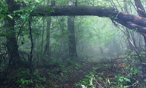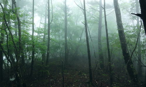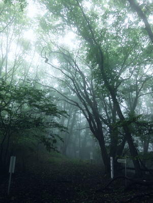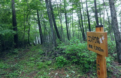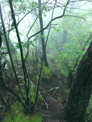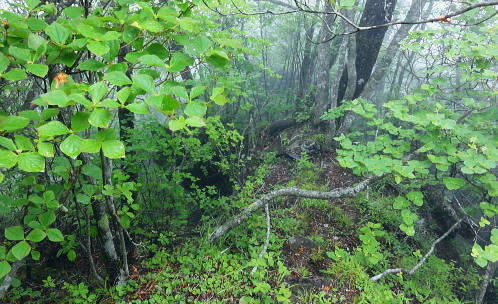 | 山中は白霧一色に染まり霧雨が舞う幻想的な世界・・大谷ケ丸南東尾根の上部と天狗尾根 ホリヌキドウミから大谷ケ丸―濃霧強く大谷ケ丸西尾根を諦め.大鹿峠天狗尾根から田野.景徳院へ下る・・jr甲斐大和 切目峠から岡松ノ峰南尾根―ホリヌキ1447m ホリヌキから大谷ケ丸―大鹿峠天狗尾根・・鉄塔尾根と赤鳥居からの水野田山.田野集落の展望 1447m圏コブ スズタケから解放された立木も疎らな平頂.12:00南東尾根ツメから縦走路 12:00ホリヌキ1447m一堀抜ドウミ一12:50縦走路一13:05平沢ノ嶺:15一13:05大谷ケ丸:35一14:11コンドウ丸 一曲り沢峠一14:41大鹿山,景徳院分岐一15:00笛駒線68号鉄塔. スズタケの藪から解放されると1447m圏コブ.ホリヌキにでる。平地の台地の立木にマーキングがあるだけの.山名標もない殺風景なコブ。 幾つもの色テープが小ブナの幹に巻かれ.ここがホリヌキ(堀抜)だと示している。気にせねば通過してしまいそうな閑散としたコブ。 包容する霧粒に緑が冴える小ブナの森 12:00ホリヌキを過ぎると小ブナの茂る樹林帯に入る。まだ下草の笹葉を付けぬスズタケ帯を抜けてきた。それでも緑被われだした大地は素晴らしい。 モヤが包容し癒される風景だ。又今回は常にモヤの小さな霧粒が樹海に漂い放徊していた。それが又幻想的な風景を創りだしている。 先のキレットは堀抜ドウミ.12:06そのなだらかさもホリヌケの肩を過ぎると直ぐ西へ急下降して細尾根になる。 灌木混ざりの岩場になり.深く切れ落ちるキレットがホリヌキドウミだった。 まだ幾らか若草色の樹葉が見られた.12:42ホリヌキドウミ 確りした立木の混ざる岩場にザラ地,丁寧に下れば気を張るほど心配する必要はなかった。 古い焦せたテープのマーキングがあり.右手の白いザレの足元には太い麻紐が長さもなく根元に確り括られていた。 大分昔のもので古く切り落とされ.取付きの部分だけが残されていた。昔付けた補助ロープの端の締め部分だろう。 この通過は尾根から体を外側の空間に離すため.これだけでも掴める縄があると体を谷側に浮かす安心感をもたらしていた。 右側に巻き気味に斜め下にトラバースする。ホールド.スタンスは土壌混ざりで脆いが大きい。 最後の登り気味の所で一度力を入れ過ぎたため.高めにあった大き目の突起石を抱え込むと砂のよう崩れた。 ただ慎重に通過すれば不安を抱かす場所ではなかった。アッと云う間の10m足らずの距離.ホリヌケドウミを越える。 この下には巻き道が何本かあるようだ。 ドウミ.キレット越えは昔は米背負峠から大ゴ沢沿いに開かれた古道がホリヌキドウミを越えている。 そして恵能野川沿いの堀抜ドウミ沢にルートが開かれていた。今は荒廃が激しく踏み跡すら消え伏せていた。 峠越しの掘切ドウミ沢への踏み跡はここからでは分からない。沢沿に下ると小沢ドウミを横切る新たな林道桑西線にぶつかる。 そして林道止まりから下れば今は巡視路でもある恵能野川本流の古道にでられる。 後日アモウ沢に入ったところ.アモウ沢左岸尾根の中程に横断する古道の形跡を見付けている。 コクトチ沢側の古道は判らなかったがその先はアモウ沢乗越と思われる。 ホリヌキドウミ越え 右手のオオゴ沢伝いの日向部ルート・・利用者のない割に道形はよく保たれている。 懐も浅いので後記.恵能野川コースより安全確実な下山路。下り初めはコゴ沢と出合い.次いでオオゴ沢を丸太橋で渡る。 その後は伐採の手が入った山裾を辿り.やがて堰堤工事絡みの林道に降り立つ。 公営テニスコートが設けられた真木川日向部にでる。 左手は小沢の源頭を絡んで恵能野川本流コース・・滑りだしは緩斜面の山腹を絡む穏やかな径。 5分も下ると乾いた沢床を踏むようなり.それが小沢の源。程なく一筋の流れが岩を濡らし.やがては躊躇いながら水音を立て始める。 ノボリオ沢,更にアモウ沢と出合うまでも,ずっとそんな調子になる。恵能野川と名前を変えた本流へ。 やがれ山仕事の径と合う.その直ぐ先には仮橋も設けられている。鞍吾山からの下山路を右に見て,左岸に移る。 ・・「中央線の山を歩く」藤井寿夫著の下り道から. 米背負(米背負ノタル)越え オオゴ沢は昔,国中から真木の谷へ米を運んだ古道。大蔵沢米背負沢緩いジグザグの沢沿い径で, 昭和57年の台風10号で荒れたとは言え通行には支障がない。オオゴ沢上流の古道は荒れて消えてしまっていた。 HP「花ひかり」氏によると2004年06月.大ゴ沢沿いに延びるであろう真木へ下る古道を探る積りでいたが造形すら 見つからなかった。そして切り替え.米背負峠から大ゴ沢一堀抜ドウミ一エデ穴沢一恵能野川一真明野にでている。 そして「今回は沢歩きが大半なものの.悪場はなく登山靴でもさほど問題なく歩けた。」と述べている。 米背負からまだ大ゴ沢のツメは覗き込んでいないが道があるとは思えぬほど急斜面だと云う。 それに比べ米背負沢側は緩い斜面のジグザグ径。真木川右岸の各尾根を先ずは踏んでから考慮することとする。 平沢ノ嶺から綴られ