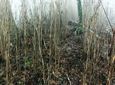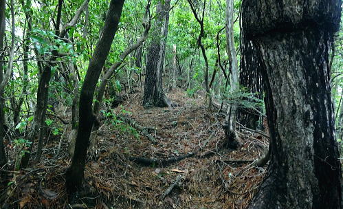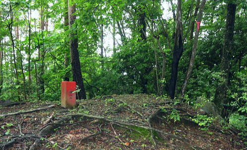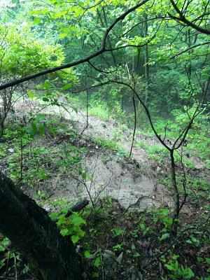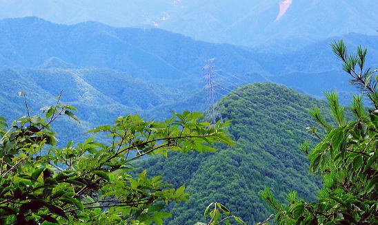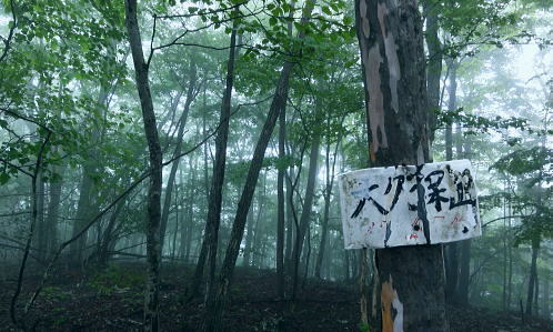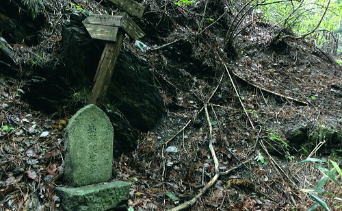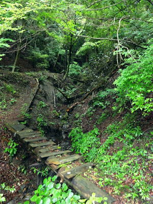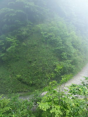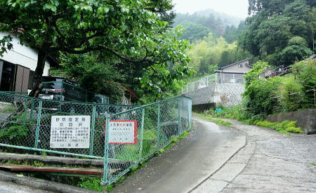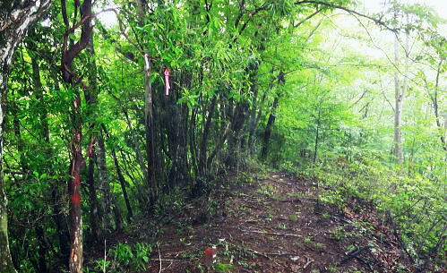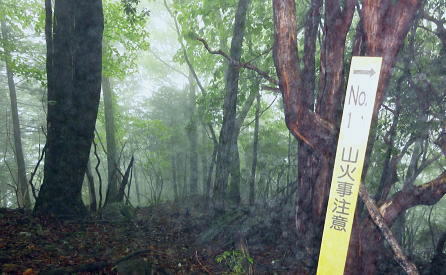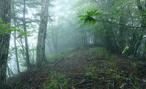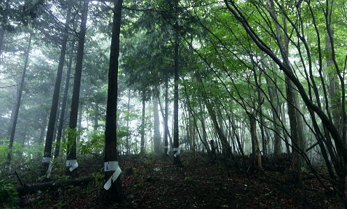 | 大菩薩連嶺.真木川右岸流域の林道桑西線に係る尾根と谷1 ・・笹子川真木川流域Top 1964年03月. 高校時代に裂石から明け方に掛けて登り.小金沢連嶺の新雪をトレースし.南下.湯沢峠から真木沢林道を下り国鉄初狩駅へ下りている。 それ以後は真木川右岸流域の支尾根群を登山. 2012年6月の上信越国境の白砂山登山を間に挟み.6.7.8月と日帰り山行として3本連続で出向く。 2012年06月. 大谷ケ丸南東尾根・・掘抜ドウミと小沢ドウミ. 又山椒沢左岸尾根から登り返した岡松ノ峰南尾根 2012年07月. 破魔射場丸南東尾根・・霧雨から土砂降りの雷雨に追われ.桑西林道起点から米背負沢を下り大蔵沢大鹿林道 2012年08月. アモウ沢乗越・・恵能野川を遡り.巨大堰堤の桑西線終点からアモウ沢左岸尾根・・滝子山南陵を下る 2016年05月. 藤沢川ウシロ沢左岸尾根から滝子山東尾根―沼ノ沢を下降.林道大沢ドウミに至る予定が時間をロス,コクトチ沢.恵能野川へ 2012年10月. 藤沢から滝子山東尾根(御正人ノコル).南東尾根を経て北方川右岸尾根から天狗山を南下し周回・・恵能野川右岸尾根 林道桑西線に係る尾根と谷T・・大谷ケ丸 梅雨の隙間を狙い霧中の大菩薩大谷ケ丸から大鹿峠天狗尾根を横断する 間明野.切目峠から大谷ケ丸南東尾根。一度巡視路で山椒沢二俣から下り返し岡松ノ峰南尾根を詰め南東尾根へ 小沢ドウミから大谷ケ丸に立ち.南大菩薩連嶺を南下して.大鹿峠天狗尾根から景徳院の里にでる。jr甲斐大和. 2012年06月23日.単独 切目峠から岡松ノ峰南尾根―ホリヌギ1447mから山椒沢を一度下り返す ホリヌギから大谷ケ丸―大鹿峠天狗尾根.景徳院 大谷ケ丸南東尾根 破魔射場丸より2011.10.28/12:02破魔射場丸からの3つの山域を分ける遠望風景 大谷ケ丸南東尾根の背は左奥が道志山地で一段高いのは九鬼山。右寄り中央が高川山になり.御坂山地で桂川がその境になる。 高川山の手前を横切るのが笹子川.手前北岸流域は南大菩連薩嶺東面になる。中央の谷間鞍部に林道桑西線が横切っている。 左側は雁ケ腹摺山吹切尾根の末端に当たり梅久保山がある。谷間は真木川で各南東尾根の取付き地点がある。 中央が真木川の支流大ゴ沢と恵能野川に挟まれるるのが大谷ケ丸南東尾根。 末端の大久保山から山椒山に乗る18号鉄塔.岡松ノ峰.小沢ドウミ(林道桑西線).ホリヌキ.掘抜ドウミ.平沢ノ嶺へと続く尾根。 大谷ケ丸南東尾根 今年の初めの南大菩薩連嶺は東面に入り.セイメイバン.大垈山から宮地山へ回っている。 ただ大垈山西方の吹切尾根を始め.真木川流域の山域は私にとってはまだ広い範囲で空白地帯が続いている。 昔.小金沢連嶺を南下して湯ノ沢峠の旧道から国鉄初狩に下っている。そこで少しでも真木林道周辺をを想い出すことができればと考え. 真木川に没する幾つのも尾根の中から間明野を選び.大谷ケ丸に突き上がる南東尾根を詰める形で入山した。 この山行が切っ掛けになり.後に「林道桑西線に係る尾根と谷」を続けて綴ることになった。 大久保山の尾根 笹子川の支流真木川から大峠に向かい遡ると左手から恵能野川が合わさる。この合流部か身を起こし.この頂点が平沢ノ頭を経ての大谷ケ丸。 大谷ケ丸南東尾根は大ゴー沢と恵能野川を挟まれた尾根で堀抜ドウミ.小沢ドウミと2つの深いキレットを擁し.大久保山を起し.真木川に没している。 距離の割に起伏の激しい藪尾根を持っていた。 又ツメに雑木の深い森がある。下山は日川の田野に落ちる大谷ケ丸西尾根を一気に下る積りでいた。 それが思い込みの深さから山椒沢右岸尾根を登り.岡松ノ峰までの時間をロスする。更に下山は先の判らぬ濃霧に遇い.西尾根を鈍らしていた。 大谷ケ丸でバスに同乗した親子連れと再会し.谷間は何処も全て濃い雨雲の中だと情報を得て.大鹿峠から鉄塔尾根を下りjr甲斐大和に降りる。 昨日.一昨日と梅雨前線に台風4号が重なり.直撃を受けた日本列島は西日本から関東.東北へ縦断し膨大な被害を各地にもたらした。 その上.梅雨前線を刺激させ.被害は更に広がっている。 台風が通過後.前線が太平洋沿岸を東進し.予報では南下する前線の影響を受け.明日は梅雨の中休みを報じていた。 勝沼菱山.高尾.奥多摩に晴天が望めると予報している。その梅雨の隙間を縫い.山に出掛けている。 ただ谷間はガス濃く.この数日の大雨が谷間に湿気を抱かせ飽和状態を導いている。更に霧雨は気温を低下させ.予想できぬ肌寒い山行になった。 真木川右岸支流.切目沢出合 間明野手前の金山神社.道1本手前から取付く.7:20切目沢橋から真木川切目沢左岸道・・桑西下真木線より 6月23日(土)霧雨後曇 jr御徒町¥1450 4:36=4:39神田:41=5:43豊田:48=6:38大月,富士急山梨バス¥430 7:00=7:20切目川出合. 大月駅 jr大月駅に着いてからハマイバ前行バスが発車するまでまで28分待つ。 その間を利用し大峠へ出向く登山者が居ればとタクシーの相乗りを考えていた。2人でもよい.半額になる。 楢ノ木尾根を末端まで歩くことを考え数年になる。乗物の経費が掛かり過ぎていた。 タクシーの運転手に
