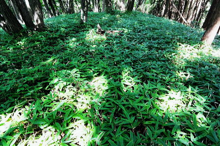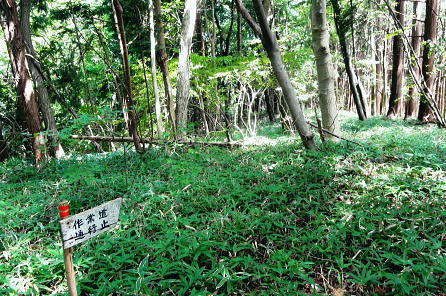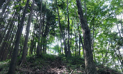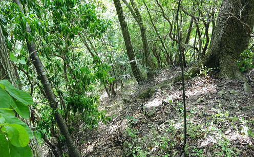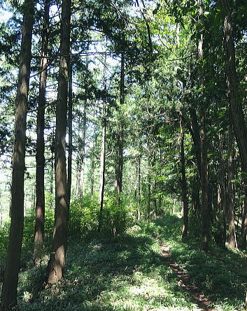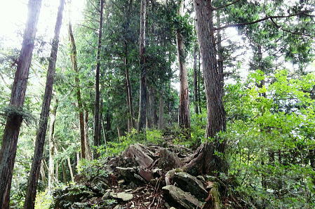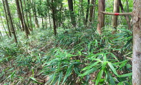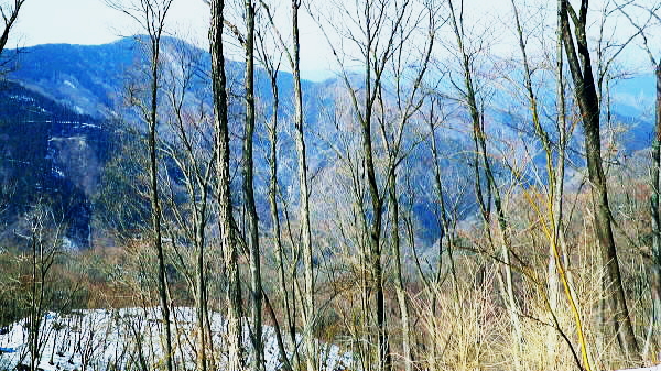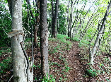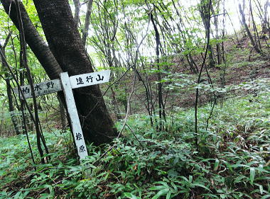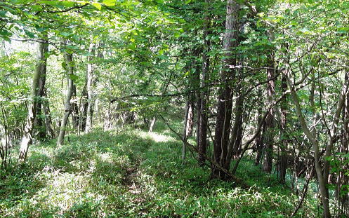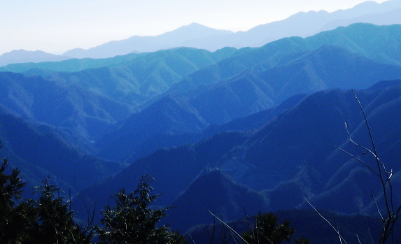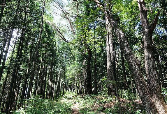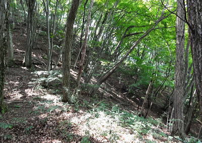 | 連行峰を南北に横断・・沢井川鎌沢入口bsから連行山鎌沢尾根を詰め.万六尾根の.万六ノ頭883m北東尾根を下り.南秋川小坂志川へ 万六尾根のコウタイコウタイ坂を下り.湯場ノ頭から万六ノ頭北東尾根―763m圏峰から小坂志林道に下り.檜原街道笹平橋bs 藤野佐野川から鎌沢尾根 笹尾根連行峰から万六ノ頭北東尾根・・笹平.野村邸の茶席 笹尾根連行峰 頂のベンチから生籐山への縦走路連行峰 連行峰(れんぎょうほう)からの展望は殆ど得られなかった。木製のベンチ2つと幾つもの看板.標識が立つ その背後の樹間の隙間から霞む富士嶽望まれる。3合目から5合目にかけ層雲が掛かり.富士の頭が天空に突き出しだし眺められている。 遠望できたとも云えぬ霞む中.狭い樹間を透し.霊峰富嶽だけが何十にも重なる山並に乗り望まれた。 笹尾根を乗り越す.この頂が今日の最高地点と理屈を付けては.ザックからビールを取り出しトマトを齧る。 喉通しが落ち着くまでに半分ほど呑んでしまった。ハイカーと擦れ違う。彼から山名の呼び方を聞かれ.又山の由来を尋ねられる。 連行峰万六尾根は三国山字副尾根にある鎌沢の軍刃利神社下の庚申塔に三差路がある。 その道標から続くのが古道「桧原御嶽道」と示されている。三国山.連行峰を経て柏木野に下りて奥多摩の御岳山(御岳神社)を指していた。 その為連行峰を抱く武相国境稜線は「日本武尊東征の道」とされている。御岳神社の祭神が日本武尊とある。 連行峰万六尾根と万六ノ頭北東尾根 小坂志川流域の左岸尾根画像は大岳山御坂尾根から馬頭刈尾根へ下った折.大岳沢への分岐からの遠望・・2015.12.08/13:00 小志坂志川流域を取り囲む山並の左下は石津窪山南西尾根。その上が市道山のヨメトリ坂を登り.吊尾根から源頭の醍醐丸に登れば 笹尾根の連行峰へ。背の上部は丹沢山塊・・鍋嵐.三峰山と小さく見える相州大山。中央に三角錐の塔ケ岳.手前の丹沢三峰と丹沢山だろう。 連行峰万六尾根 今回のルートは矢沢と小坂志川を分ける連行峰万六尾根を下る。コウタイ坂を下り.登り返して湯場ノ頭927mに立ち.湯場ノ頭湯場ノ尾根を 右に分けている。尾根筋は雑木で小笹が茂り.通う人が少ないのか.以外と登山道は確りしているものの土壌は柔らかい。 万六ノ頭にでると北東と北西に支尾根を分けている。末端は南秋川沿いに枝尾根を多く派生させ扇状に広がりを見せている。 登山道は左支尾根を選び柏木野に下りている。私は北東尾根に乗り.画像の左下の小志坂志川出合に下りていた。 途中の790m小コブでは湯場ノ尾根との間に延びる北尾根を分けてもいる。ここは以外と面白いかも。 右手前が浅間尾根末端の松生山端になる。採石所に至りると禿山になったバケモノ山がある。左下が秋川二俣の本宿. 万六尾根に乗り北上 古く読めぬ道標が続いて2つ.10:50万六尾根から万六ノ頭北東尾根 10:33連行峰:45一11:13湯場尾根上取付き一11:44万六ノ頭北東尾根大12:15一12:36(763mコブ) 一13:11(700mの次のP)一13:24伐採地一14:03小坂志林道一野村宅一14:40檜原街道笹平bs. 分岐にある大きな赤松から覗き込む万六尾根の道は奥はお伽の世界に入る扉のような風景を潜り.尾根筋は細い小径が綴られている。 「三国峠のみち」と呼ばれ.古くからある信仰の御嶽(五日市)道。最近は行き通うハイカーも少ないようだ。・・甲斐の国.上野原が起点 笹尾根の縦走路を歩むより.跨った尾根に心が躍るのは何故だろうか。若い時は奥多摩に出向くこと自体.考えもしていなかった山域だった。 過っては日帰りは殆どしたことがなかった。あって夜行日帰りか.列車2泊日帰り山行で上越国境の山域へ多く通っているた。 万六尾根 連行峰万六尾根は昔.藤野町上岩.岩地区と檜原村の南郷辺りを結ぶ峠路で生活道.交易路として栄えていた。 古くは甲州から御嶽講の信者も通っていたと云われている。 左に矢沢,右にコザカシ沢を分ける連行峰万六尾根は湯場ノ頭手前の鞍部に至る辺りまでは昔.「コウタイ坂」と呼ばれ,「交替」.「交替」としての 意味があったらしい。又古い地図には「万六」は「番六タワ」.「トバ番六」.「奥番六」とあり.万六尾根は番六尾根となっている。 湯場ノ頭付近 昔の道標が生きている道標「柏木野(バス停)5.0km」に導かれ.連行山から笹尾根を分けて北側の柏木野へと右に折れ万六尾根に入る。 この尾根は湯場ノ頭927m.万六ノ頭883mを越え南秋川へ下る登山道でもあり.「三国峠のみち」にも指定されていた。 又一歩入ると靴底の感触が縦走路とは全く異なり.柔らかい草付きの優しい土壌に変わっている。 万六の尾根伝いは大きな起伏もなく.足元は落葉の積み重ねられた土壌のクッションでこの上もなく心地よい。 それでいて古道の「三国峠のみち」は程よく踏み固められている。尾根を囲む高木は木陰を創り.緑の深い大地に覆われている。 それでも汗は途切れることなく垂れ.タオルで拭き続けているが気持ち安らぎをもたらす尾根道が続いていた。 風がないのが残念だが.主尾根から1つ脇に逸れただけで.草