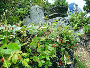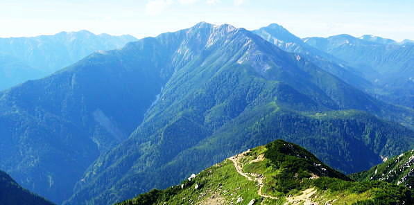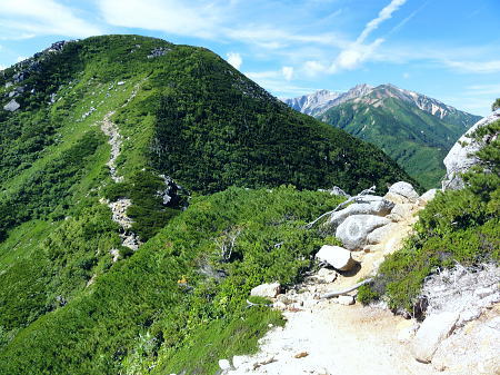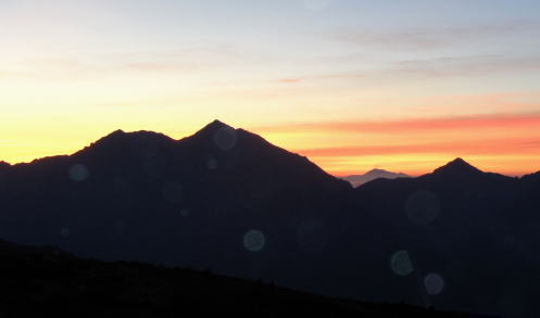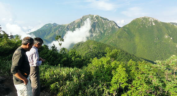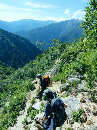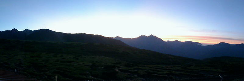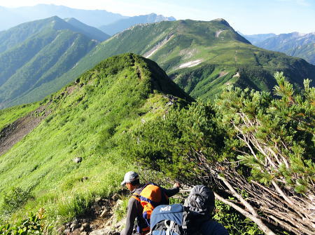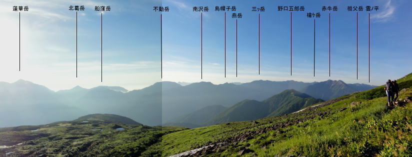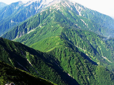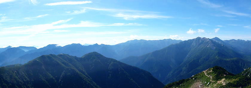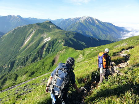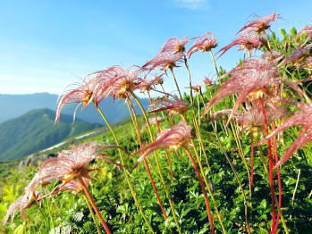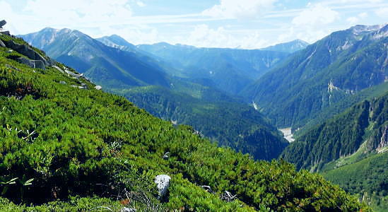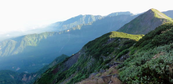 | ・・立山~薬師岳地形図 黒部川周辺概略図 五色ケ原から越中沢岳・憧れのスゴ乗越へ 昨夜の星空に.夜明けの広く開けたガラス窓.その五色ケ原の草原から岩稜を越え.立山連峰の深いシラビソ林に囲まれる 室堂から浄土山.五色ケ原 五色ケ原から越中沢岳越えのスゴ乗越・・シラビソの森とアルプスの大展望 スゴ乗越から薬師岳越えで繋ぐ 太郎兵衛平から折立へ下山 立山と後立山 4:53後立山・・赤沢岳.スバリ岳.針ノ木岳.七倉岳.唐沢岳 8月24日(土).快晴 五色ケ原山荘5:50一7:10越中沢乗越:20一8:20越中沢岳:30一9:15スゴノ頭手前:25一9:30スゴノ頭 一10:50スゴ゙乗越11:00一11:50スゴ乗越小屋. ![]() 上の写真10分前に撮影.4:52 赤沢岳に針ノ木岳.蓮華岳.4:50 針ノ木岳.蓮華岳と北葛岳. 中央奥は浅間山 日の出 頂の尖っ突きで仰ぐ日の出や狭い谷間から迎える日の出と異なり.大草原の台地に宿り.壮大な日の出を迎えている。 如何に広い頂でも視角の隅に谷間が入りると眺望は更なる立体感をもたらすが見渡す限りの草原から望む山並みは異にしている。 普段と違った景観を見せさせていた。山上に連なる山並は谷間を含め全てが広大に開放的な横たわえ.アルプスの醍醐味を現わしている。 後立.蓮華岳より雲ノ平 6:22広大な台地は更なる広さを見せている。カメラのレンズに入り切れぬ眺望が視界を広げていた。 周りはどの岳も既に歩み続けた懐かしい岳々だった。忘れていた昔を想いださせ.新たに歩み出す岳にもなっている。 中央に小さく頭を出しているのは餓鬼岳だろう。私の北アルプスの正月山行はこの前衛の岳から始まっている。 草原からは何処からでも広いアルプスの山並みが望まれた。又向かいの山々からもこの晴天なら大草原が眺めていられるだろう。 特に立山を越え.黒部川沿いに開かれた後立山の山々はそれぞれの個性を剥き出しにた姿・形を現していた。 秋の縦走は水の確保に大変だった。冬は幕営が殆どで.春には雪洞を利用している。 山行を重ねる都度.その個性を考えて登っていた山々が連なり.今日一番の展望台になっている。 チングルマの穂.6:10遠方は越中沢岳 大日岳.天狗山.龍王岳 鳶岳より振り返る6:22右手は五色ケ原の広大な台地 越中沢岳と北薬師岳 鳶岳を越え.先の鞍部が越中沢乗越越.6:27左上が水晶岳と赤牛岳 赤い屋根 写真では見分けができぬがスゴ乗越の少し先.白くザレた所の上に赤い屋根の小さなスゴ乗越小屋が眺められる。 一昨年読売新道からも薬師岳の北側鞍部に小さく点のような赤い屋根を見ている。その時の夢が今.現実に続いていた。 五色ケ原山荘から歩き出して40分程.もう今日の憩いの場.スゴ乗越小屋が見えていた。見えてからが長い道中になる。 鳶岳南側コブ 鳶岳南鞍部より.6:46先に従えるのが越中沢岳.間山. 奥に薬師岳が連なる ![]() 越中沢乗越手前の木道の隙間から越中沢岳 7:33右側のコブが頂. 左のコブからは奥?山を越え南東に派生する尾根・・その尾根の末端が上廊下の下ノ黒ビンガに繋がる。 五色ケ原全景 背は立山三山.左肩は剣岳.8:092つのコブを持つ鳶岳 上の五色ケ原.左端をアップ縦走路は右の鳶岳を越え鞍部から南峰を巻き込んでいる 水晶岳から北上する読売新道 ![]() 左背は裏銀野口五郎岳. 中央が赤牛岳.右肩が水晶岳. 右側が笠ケ岳と三俣蓮華岳・・越中沢岳より.8:15 中央アップ・・読売新道 8:17後立南部・・裏銀と読売新道 ![]() 東側糸魚川の谷にガスが湧き始めているのが分かる. 手前は越中沢岳の東尾根.中央コブは木梚山・・黒部湖に没している・・8:25 薬師岳への径 縦走路が南下を続ける内.後立の山々も少しずつ移り.南部の山々が次第に姿を変え現わしだす。 そして退く山々.真横に聳えいた針ノ木岳周辺も遠のいてゆく。そして1つ.1つ新たな岳を望むようなった。 ここからは少し貧弱な形だが秀麗な鷲羽岳が姿を現した。まだ遥か先だが山形はよく分かる。 この鷲羽岳は2度挑戦しているが未だ頂に立てずにいる。常に荒天に遭い.迂回させられていた。 荒れれば風雨強くジャリが飛ぶ岳。前回も後一歩と踏み込むも記録だけの山行になるのを恐れ.黒部川源流に迂回している。 左端アップ・・後立南部 越中沢岳より左半分を撮る一昨年8月のルート・・針ノ木峠から烏帽子岳へ モモコチ(苔桃) アオノツガザクラ(青の栂桜).8:19スゴノ頭とスゴ乗越 8:27背稜のスゴ乗越を越え小コブを登り返すと白いザレ付近い赤い屋根のスゴ乗越小屋が肉眼で小さく見えてきた。 赤牛岳 廊下沢沿いに巻き込んで越中沢岳へ.8:48裏銀三ッ岳と野口五郎岳 ![]() 越中沢岳南面 鞍部より振り返り北面を見る.9:43右へ航行する旅客機 飛行機雲 この2日間数多く青空を横切る飛行機雲を見ている。ジュラルミンの機体を煌めかし繊細な姿を現している。上層は風が強い. 1万m上空を飛んでいる。輝く機体の型がよく見え.ジェットから吐き出された気流は白雲を一直線に曳いている。 空を仰ぐと綺麗に並行する飛行機雲があればややズレる雲。羽田から金沢へ本州を横断する航路が頭上に通っている。 