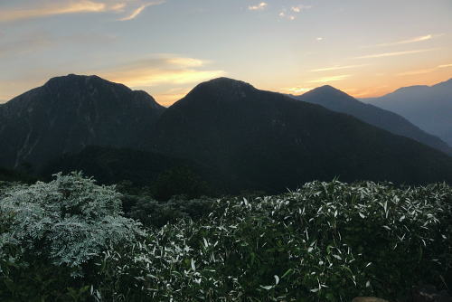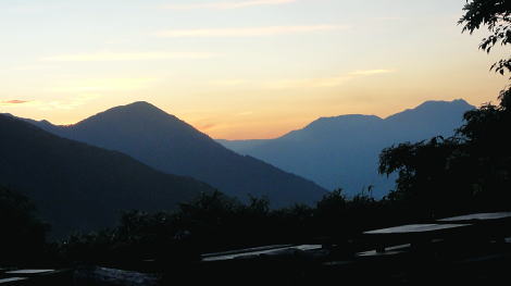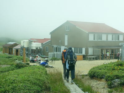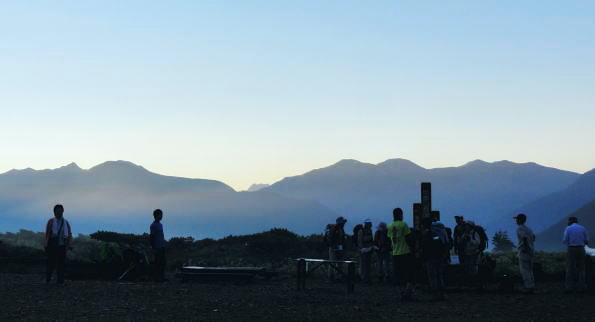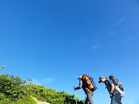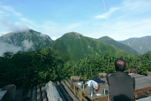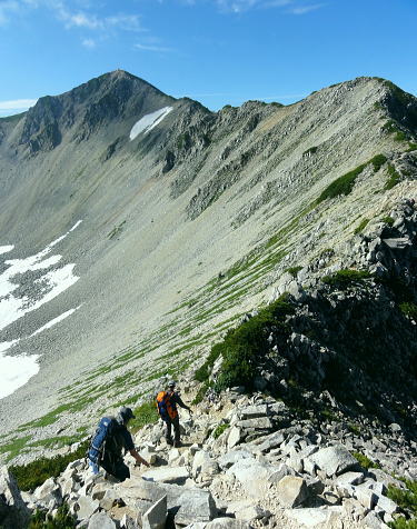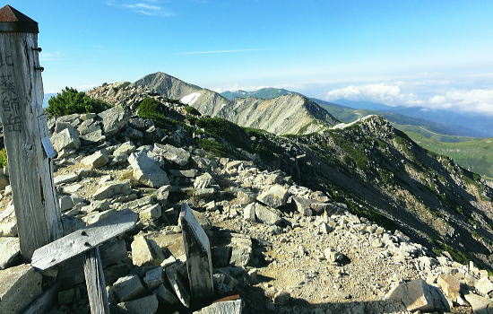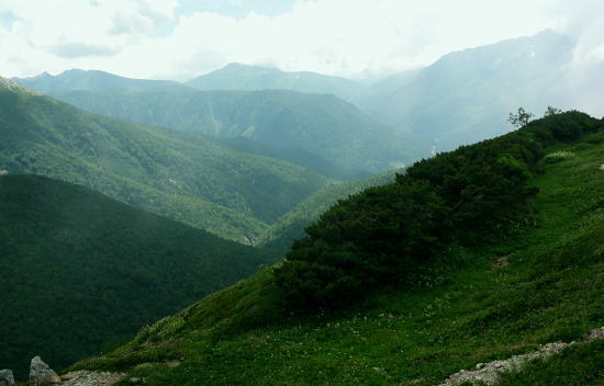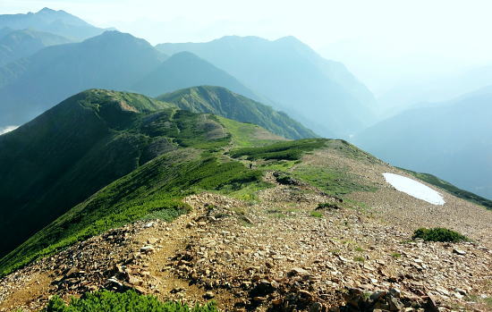 | 立山連峰.今回は晴天に恵また薬師岳・・薬師岳.読売新道.裏銀地形図 並行する読売新道を望みつつ森林限界を抜け.間山を経て念願の北側からの大きなカールを持つ薬師岳に立つ。 そして過って暴風雨の大荒れの中.ピストンした太郎兵衛平へ下りる。 室堂から浄土山.五色ケ原 五色ケ原から越中沢岳越えのスゴ乗越 スゴ乗越から薬師岳越えで繋ぐ・・学生時代の回想・夕焼けの北薬師岳・笹原の太郎兵衛平 太郎兵衛平から折立へ下山 大地の深みを思わす裏銀の稜 スゴ乗越小屋.5:23不動岳.南沢岳に烏帽子岳.右へ登って三ッ岳 後立,不動岳から望む南沢岳越えの薬師岳~立山・・東面の稜.写真 8月26日(日).快晴 スゴ乗越小屋6:05一6:30間山:40一7:30小:40一8:10北薬師岳:20一9:10小:20一9:30薬師岳10:00 一11:00小:10一11:30沢:20一12:10太郎兵衛平.太郎小屋. 夜明け スゴ乗越小屋の庭先からは昨日の五色ケ原とは全く違った感覚の朝焼けを迎えていた。 シラビソの森に開かれた台地. 左手には昨日越えてきたスゴノ頭からの尾根と右手には間山から派生する尾根とに挟まれている。 その空間はまだ闇の窓。スゴ沢の谷間を真正面に向え.黒部川を隔てた後立の山々が望まれる。 まだ日の出前のひと時.谷間に横たわる読売新道の尾根も闇の中だった。 濃紅の空との境には墨一色に染まる後立の山陰は大きく連なる激しい起伏の流れで望まれる。 大きなコブが2つ。不動岳と南沢岳が大きい。又烏帽子岳の三角峰も.ここからは顕著に大きく望まれた。 ニセ烏帽子岳の右の窪地には一昨年宿った烏帽子小屋がある。近年歩んだ峰々を目で綴るのも楽しいものだった。この時の山行は単独行だった。 越えてきた越中沢岳とスゴノ頭 前日のテラスから.18:20又もやテラスからの飛行機雲 左景・・朝方の同山.5:00スゴノ頭右肩は越中沢岳から東に派生する尾根にある木梚山 木梚山と針ノ木岳方面 右景・・朝方のスゴ乗越小屋食堂より間山と北薬師岳 昨日はここまで登り見上げた岳.薬師岳を目指す.25日16:48間山と北薬師岳 日の出と共に朝焼けが下りてくる大きな岳.5:40今日は薬師岳まで少し長いアプローチになる。登り一方で誰もが長いコースと考えていた。自然と昨日より早く4.5-5-5.5で5時半に小屋をでる。 直ぐ昨日訪れた展望台を抜け.小尾根を越えるとシラビソの森とも別れ.右手(西)に草原が広がりだす。 前方に円形状のふくよかな2つの起伏が重なるよう見上げられる。朝焼けを受け.紅葉のように赤く燃えさせる山肌を覗かしていた。 朝方の陽光に霞む裏銀三ッ岳.5:57広大な立山連峰の西裾尾根 6:33大日岳.剣岳.立山三山. 龍王岳.右上が獅子岳. 手前へ鷲岳.鳶岳 越中沢岳.越中沢岳 薬師岳 1967年08月.立山から大喰岳縦走・・太郎兵衛平より薬師岳ピストン 2012年08月.室堂から薬師岳越え 北薬師岳と間山池 間山より.6:34間山池 間山に掛かる森林帯を抜けると這松に草付.ザラ地混ざりの稜にでる。視野は四方に開け.直接主尾根に当たる陽射しは 更に強さを増していた。それでも偶に抜ける風が心地よい。その足元に小さな池塘があった。驚くことに頂稜の片隅にである。 頂稜を綴る幅広い尾根が狭まりだし,稜にでて初めて小さな池塘を見ている。場所柄.何故ここに池塘があるのか? 水が留まり何故涸れないのか? 不思議に思う。雨水だけなら強い陽射しに照らされ.既に干し上がっている筈だった。 又水が流れ集まり留まっている地形でもなかった。湧水とは言えぬ場所,残雪は既にない。それでも何処かに繋がる水系がある筈だが? カールでもなく.間山の東縁である。地形図にも間山池と記されている。6m程の短い水溜り。8月下旬でまだ池として確保していた。 気にせねば通り過ぎてしまう小池だが考えるとトンチになった。 越えてきた北方の立山の峰々 雄大な雲上漫歩.6:52 今日も藍色の夏空.7:02上弦の月がスナップ写真から食み出していた 間山を登り返し北薬師岳の径.黒部川を巻き込むよう登ると左手後方.頭上高いところに上弦の月を望む。 真っ青な空を背に昼近く.全体に白みを帯びた半透明に欠けた月を見る。今日は8/24日で上弦の月.中潮になる。 まだ夜道は心細いが欠けた左側が少しずつ膨らみ.後一週間も過ぎれば満月になる。 立山と黒部川を綴る山々 夏の陽炎が出てきそうな霞.7:06中央にはみ出す五色ケ原 強い陽射しに霞む赤牛岳.水晶岳・・読売新道2009.08 左奥が裏銀.7:42右遥か奥に槍穂高連峰が連なる 北薬師岳 薬師岳北面の稜.8:19背は北ノ俣山.右に延びる尾根が神岡新道への県界尾根 右中段は太郎兵衛平で肩遥か前方下に太郎小屋がに見下ろされた。 間食 1本取りレモンを齧る。1個の両端,頭と尻の皮を剥ぎ1/3に切り.各々に手渡す。 酸っぱい中.甘味が口の中に伝わり.口の中をさっぱりさせていた。気がよかったのか今回はT君も手を差しだす。 彼はツマミ兼行動食として美味いサラミ類を持ち込むも.酢っぱいものを嫌い.甘味の食べ物にも手を付けず.ビスや飴にも手が遠のいている。 そして喉の渇きを嫌い断る煎餅を間食にする強者だった。栄養はあ
