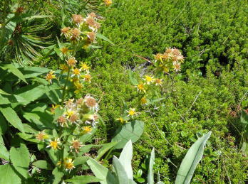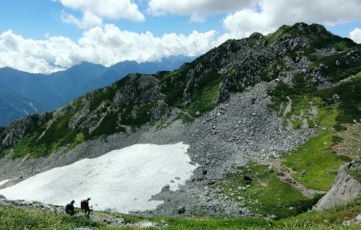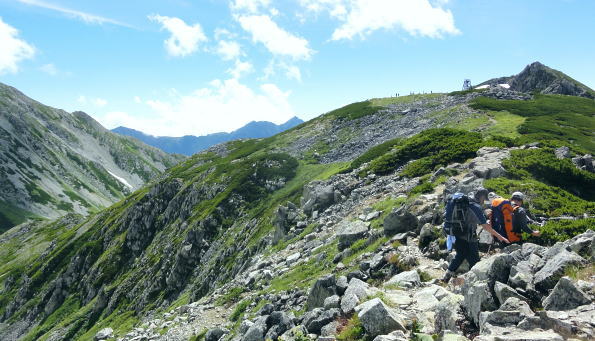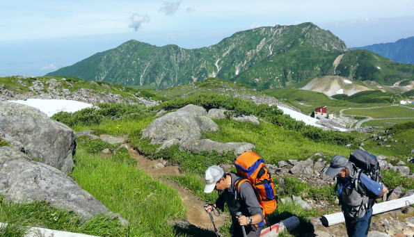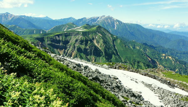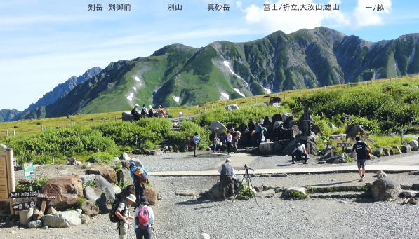 | 立山連峰を南下し浄土山から薬師岳へ・・立山Top 立山〜越中周辺地形図 室堂から浄土山を経てザラ峠―五色ケ原.越中沢岳を経て読売新道を眺めつつ.五色ケ原〜薬師岳間の空白部を埋める。太郎兵衛平から折立へ. 2012年08月23〜26日 L松村m見城.立松.(迎え車で滝島.鈴木) 立山室堂から浄土山.五色ケ原・・入山トラブルと弁当.草原とライチョウ親子 五色ケ原から越中沢岳越えのスゴ乗越 スゴ乗越から薬師岳越えと繋ぐ 太郎兵衛平からは折立へ下山 立山連峰 室堂からの入山は1966年08月と翌年08月.そして今回と3度目になる。1966年には寝台列車で剣岳東面に入り.欅平へ抜けている。 そして67年にRHCの主将を任された私達は夏合宿に鈍行夜行列車で立山温泉から立山三山を経て南沢岳.大喰岳へと北アルプスの雲上を大きくS状に縦走した。 その折は立山温泉から入山しザラ峠から五色ケ原をピストン。そこから北上し黒四から後立山へS状に絡め.中盤で太郎兵衛平から薬師岳をピストンした。 その後は合宿の集中地.新穂高へと縦走したため.立山連峰の空白部分として.その間の五色ケ原から薬師岳間の間だけが残されていた。 後立山は一昨年に蓮華岳から南沢岳へと縦走して昔の踏み跡と繋がれて.親不知から上高地まで地図上では赤線で結ばれていた。 又3年前の08月にはその間を連ねる読売新道を新穂高から黒部川K四ダムまで先輩・同期と縦走している。 この立山周辺の山々は幾つもの山行を積み重ねてきた。今回は夜行登山バスを利用しての回想する山々でもある。 立山から薬師岳に繋ぎなぎ.又並行する読売新道を一緒に歩んだ仲間達と共に.長大な尾根を間近から懐かしく懐古したいと思っている。 メンバーは仕事の関係で鈴木に代わり.後輩の立松君が加わる。本来は北俣岳(上ノ岳)から神岡新道まで下りる企画を立松君の参加で. 車の回収ができず中断して薬師岳止まりになってしまった。それは結果的に迎い車の配慮にも欠けてもいた。下山も立山に戻ることになってしまっている。 同じ往路通うことになり申し訳く.地元でガイドをすると云う彼はその後もトラブルメイカーになってしまった。マイカー泊りで東京から来た者が室堂は1時間待つことになる。 当日の弁当も然り。私は買出しを済まし立松君は装備をお願いしたが.出発直前にコッヘルがないと云いだす始末。ガイド仲間もいる筈が調達できず.私の2人用を持参。 3人の炊事は2度手間で作らねばならず.2度手間の不便を味わい.山中で昼食を抜いている。 最終的には炊事どころか茶類を沸かすのも億劫に.持参したコンロは一回しか使用せず.ゆっくり山を味わうどころか山小屋には早過ぎる時間に着いている。 好天にも係わらず下山してから食材を分け合っている。食料・装備を供え.その上コースまでも短縮し.雑用が多過ぎる山行になってしまった。 山で遊ぶのではなく.決めたコースを詰めるだけの昼寝に変わっている。ただ慰められたのが迎い車。 今回も滝島先輩・鈴木に迎い車の手配をして頂き.何時ものことながら感謝に堪えない。5日後の27日正午に折立での待ち合わせをお願いした。 立山三山 室堂ターミナル前から.8:15剣岳.別山.真砂岳.富士のノ折立.大汝山.雄山 上ノ小平付近.室堂で富山湾.日本海が遠望できたものの.その後海原を見ることはなかった。 山中では連日.素晴らしい山並みの眺望が見られた割には水平線は常に霞みに包まれていた。 8月23日(木).快晴 秋葉原ロータリー.¥12.000=竹橋毎日新聞社.毎日アルペン号.見城先輩と合流22:30=信越道. 8月24日(金)快晴 7:10室堂ターミナルで立松君と合流.8:25. jr秋葉原駅ロータリーに着き驚く。多くの登山者が群れをなし.夜行の出発点の送迎車を待っている。又案内人もいた。 3年前この時期に同じコースで新穂高に出向いている。その時は私を含めて乗客は3人だった。 初めてのことで本当にバスが来るのか心配だった。それが今日は臨時のバスも出ると云う。 今日.明日.明後日と涸沢でフェスバルが模様しされていそうだ。それにしても北アルプスの人気は凄い。 前回より車は新しくクーラーの調整もよくホッとする。又室堂行の登山者もかなり多くなっていた。 竹橋毎日新聞社内で見城先輩と合流.竹橋を出発した夜行バスは信越道.北陸道を抜け.途中4ケ所の休憩後立山ICから一般道へ。 直接室堂に入るため富山地鉄立山駅の先.称名川沿いの桂台で室堂線のゲートに至る。6時の開門まではまだ時間があった。 外の気温は13℃.ゲート脇にはバスの通行料が大きく示されていた。1台¥50.400とある。桁が違うのではと驚く私. この料金が春の雪トンネルに化けるのだろうか? 一般車は通行不可. 何故か? 更に北軽を出発したT君は前日魚津で一泊,。8/16日から始発のケーブルは1時間遅れ.室堂には8時20分頃になると電話が入り. 突然知ることになる。マイカーで来ている筈.現地に宿りながら約束の時間に着けぬとは如何したのだろう。彼を待つ現地で電話をもらっている。 余りにも雑過ぎる態度.そこまで迷惑をかけてまで