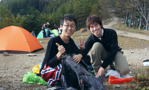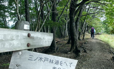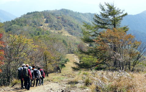 | 平成24年度RHC一年秋合宿・・雲取山石尾根 雲取山と石尾根Top 鴨沢の登り尾根から奥多摩小屋のキャンプ場へと詰め.雲取山石尾根をピストンしr奥多摩駅に下る・・2つの三角点標石と銃に追われた鹿 2012年10月13〜14日 L原賀sL坂田m羽太(2年)小野.田畑(1年).田島(s48卒).松村(s43卒).見城(s41卒) 秋合宿 今年5月のRHC総会で学生と酒を交わし,ふとした切っ掛けが現役と山に登ることになった。 現役に付随するのではなく,後輩田島君からの仲介で.現役の実力も分からぬま間々.何故か? 山行の企画を任されている。 要望は何処でもよいとのこと。繋ぎの伝言に要望を得ず.決める手筈の基準も分らない。一番オーソドックスな天幕による一泊山行を企画した。 見城先輩と後輩の田島と私.OB3名は現役5名と共に40年振りに山に入る。山行は現役が主となる秋合宿を企画・参加した。 鴨沢から七ッ石山登り尾根を経て.奥多摩小屋で天張り雲取山をピストン。翌日石尾根を末端まで下りjr奥多摩駅にでるオーソドックスな山行。 雲取山は4年前に「雪が降っている!」と初めて入り.その年の秋にも先輩の下見山行で出向いている。 私の現役時代は東京近郊の山々を敬遠していた。山域は奥秩父中部以西から八ケ岳.アルプスへと殆どが飛んいる。 それが2005年の半ばから再び山に登り始めると東京近郊の山々を主にし山へ入るようなる。 本来なら八ケ岳がよいのだがあくまでも現役を主に考えてみた。現役の実力と一泊山行を限度に.雲取山に決めている。 私は今回で3度目の雲取山になった。・・現役合宿を企画した経緯 10月13日曇 jr御徒町6:00=6:04神田特快:07=6:48立川7:05=8:28奥多摩.丹波行9:30=10:07鴨沢bs. jr山手線の遅れから坂田君が一列車遅れ.奥多摩駅発の路線バスは次の丹波行9時半発まで待たなければならなかった。 バスは異常な混み合いだった。終点.鴨沢 まで行く登山者が多く.臨時便がでている。その為鴨沢からの歩き始めは10時を楽に過ぎている。 登り尾根末端の800m圏コブと鴨沢地区 留浦浮橋より・・2021.11.15/8:21左端の針葉樹に向かい登山道が登っている。又見ずらいが林道が横切る。 七ッ石山登り尾根 鴨沢bs10:20一10:05小:15一11:55水場大12:15一12:55小13:05一13:55ブナ平14:05一14:35奥多摩小屋Ts. 登り尾根には2008年の積雪期に往復し今度で3度目.黄葉にはまだまだ早々だが緑豊かな山並に入山している。 過って雪積もる登り尾根の途中にあった「H20」の看板を見付けている。やはり水場の印だった。 当時は入山の前々日からの新雪を重ね.鴨沢の取付きから真新しいトレースを辿り.途中の立木に古い小さな看板「H2O」が掲げられていた。 今は「H2O」から「水場」に書き直された2つの大きな看板が目に付く。ここで昼食を摂っている。 現役は若い割には軽食の部員が多く.昼飯を忘れてきた後輩にも驚かされている。 分け合って昼食を摂るがドカ弁と云う言葉は今ここに居る若者には誰も当てはまらなかった。これで山に登れるのだろうか? 2年生の坂田君をトップにリーダーは原賀君.学生の列の後ろにOBが付く。彼等は私達のテントと食糧を担いでくれている。 陽射しは雲に閉ざされているものの程良い陽気に汗は滴り.高度を稼いで行く。下半は登り尾根のほぼ右側沿いを絡んでいた。 鴨沢からの登り尾根.12:21鹿害防御用テープ 小袖川側に鹿防御用に紫.青.白のテープが杉林の幹に巻かれ.ひとまとめに集められた所に付け加えられていた。 紫のテープは初めて見るタイプ。色々と混ぜて標されているところを見ると試験的な色合いとも受け取れる。 最近鹿棚のない所では色々な色,形のテープが幹に巻かれて目立つようなった。それほど鹿害は目に見えて多くなっている。 山梨県北杜市のある私有地の檜の森には人の色濃い衣類を直接幹に巻き付け.見上げると異常な風景にもなっていた。 当の本人は鹿害にはよい防ぎ方だと云う。人の匂いがあるせいか.被害は今のところ鉄条網や鹿棚と違い.以外となくなったと断言していた。 ・・2012.10.24のテレビ朝日「ナニコレ珍百景」より. 小橋を渡った後の窪み沿いの桟橋は最近改修されてらしく.大きくガッチリした丸太に改修されていた。 今日のコースのほぼ中間地点.灌木林に囲まれた小さな平坦地.堂平に着く。左前方の細い踏み跡は水道局の水源巡視路。 ここから片倉谷側に回り込み.再び小袖川沿いに入り込むと.並行する赤指尾根(あかざす)を見下ろすようになる。 右頭上には梢越しに石尾根の稜が望められ.その上に高曇の明るい空が広がりを見せていた。 ただ小袖川を越えた背には鶴峠方面の山並は望められる筈だが灰色のガスに霞み閉ざされている。 石尾根ブナ坂の落葉松林 14:0ブナ坂 七ッ石小屋への分岐を過ぎブナ坂(ブナダワ)へ.尾根筋の左山腹をトラバースする。根曲りが多くなり雨が降れば嫌な巻径に入る。 足元には衰退する枯スズタケが山腹道から深く谷間に広がりを見せている。枯落とした茎だけが薄汚く朽れ.大きな斜面を占めていた。 その茂みのコブに隠れるようモノレールの軌道が見え