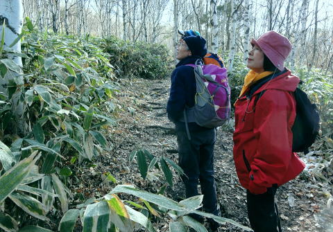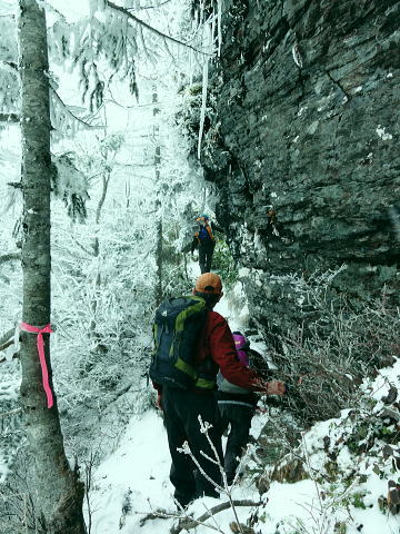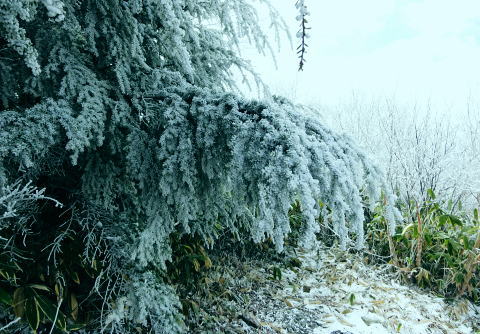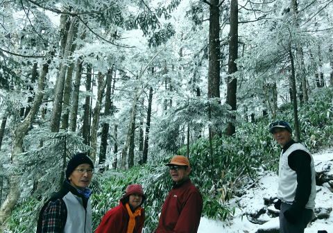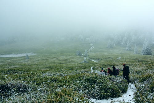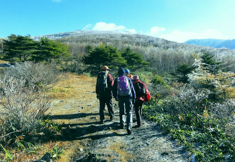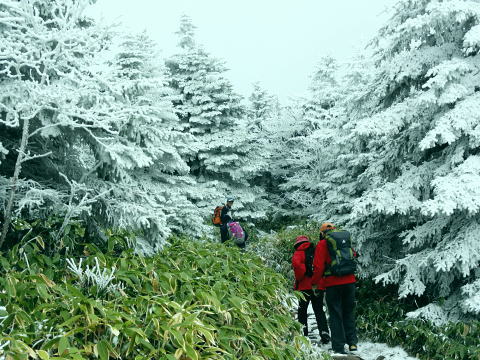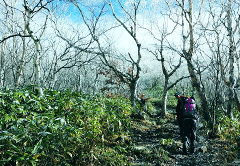 | 晩秋の上信越国境の根子岳と四阿山・・根子岳Top 上信国境と四阿山周辺Top 同期.鈴木邸と北軽を繋ぎ.華麗に染まる落葉松林の菅平高原から根子岳と新雪に覆われる根雪の四阿山 出だしは鈴木邸にお世話になり.上州街道から根子岳・四阿山と周回.鳥居峠から.嬬恋「ツツジ苑」に寄り北軽井沢に入る 2012年11月02〜04日 L立松m見城.黒岩.鈴木.松村 菅平高原から根子岳.四阿山・・鈴木邸 四阿山中尾根から菅平高原 四阿山(あずまやさん)2.354mは信州と西上州の上信国境を跨ぐ山域に位置し.吾妻.嬬山(あがつまやま)などと呼ばれている。 嬬恋村では吾妻山が用いられ,壮大な裾野を持つゆったりりした山容は.屋根の棟に見えることから四阿山と名付けられていた。 34万年前の噴火により.頂には直径3kmのカルデラが形成され.その後の浸食により現在の複数峰が生まれている。 これから登る菅平岳や四阿山の元は四阿火山と呼ばれる1つの山塊から成り立っていた。 四阿火山は志賀高原から続く火山帯に属し.根子岳.四阿山.浦倉山.奇妙山の総称。この山の南西側には峰の原高原が広がり. 山スキーをしていた1972年代には新津先輩と根子岳へ出向いている。 ここ数年は見城先輩のお世話を受け.北軽や草津温泉を起点に湯ノ丸山周辺や草津白根山周辺の山々を歩んできた。 今回はその中程にある渋峠と鳥居峠に挟まれた四阿山を北軽に通い始めて5年目にして目指した。 菅平高原の駐車場に8時集合.早朝の為.同期鈴木邸に前日お世話になり.下山後は冬季に備え北軽での薪作りに精をだす。 根子岳と四阿山 桟敷山より・・2016.02.13/13:50上信,地蔵峠越えの民宿「わたらせ」Pに車を停め桟敷山を回り込みピストンした。その折頂から北方のパノラマ。 山頂の北側は笹原の雪原が広がり.北側半円球が開かれ大展望に恵まれている。層雲が乗る西北側には関田山脈が横切り. 更に遠く北信州の山々へと綴られている。その右手には真近に聳える雪白さを誇る根子岳が顔を覗かせていた。 堂々と構えるのが四阿山。手前が足元の主稜沿いは大塚山と鍋蓋山 11月02日(金).曇 jr御徒町15:32=15:49西武池袋.急行16:00=16:42飯能=鈴木邸.消灯23:30. 11月03日(土)晴後曇 鈴木邸5:00=鶴ケ島IC=7:00佐久平ハイウェーオアシス=上田IC.真田バイパス(上州街道)=7:50菅平高原P8:00. 気象庁11月2日の予報では今年一番の寒波の来訪を告げている。 木枯らし一番の条件としては風速8m以上.西高東低.9/上旬から11/下旬の間に.前日より低い北風を謳っていた。 3日の夜半は風速8m以上の風の条件は満たされなかった。それでも四阿山は新雪に見舞われた。 信越道で碓氷峠越えをすると佐久の丘陵は一面に霜が降り.白く朝方の大地を変えていたる。上田ICでは1℃.今朝の北軽では−4℃を記録 菅平高原と北アルプス連山 菅平牧場Pから.8:15 上田菅平高原.峰の原高原と背は遠く北アルプス連山 根子岳と四阿山 7:50菅平高原P.合流8:00一9:15小:25一9:50根子岳10:00一10:35十ケ原一10:55小11:05 一11:50四阿山.大12:40. 四阿山は日本海と太平洋の水分嶺にあり.又西高東低の冬型の気象配置の常に境い目上にある。 裾野の高原は紅葉に萌え.快晴の蒼空を覗かしている。そして山の中腹以上は根子岳・四阿山とも雪雲に覆われていた。 昨夜の寒波で山は根雪になり.雪白き頂を目指し新雪を踏むことになった。 長野気象台の気象現象は横手山.四阿山を対象に「東方連山」として通報している。 10/24初冠雪.11/03日の降雪で山は完全な根雪になった。 根子岳へ.そして四阿山 菅平牧場から根子岳登山道この1時間後.中腹以上は雪雲に覆われる 南側の牧場には風がなく朝の日差しに恵まれ澄み切った空は何処までも蒼々していた。 菅平牧場管理事務所のある小さな掘っ建て小屋で管理料金2人.¥400を支払い,広い駐車場の一番上で軽井沢組と合流。 到着早々根子岳を目指し菅平コースを歩む。 白樺と覆いだす雪雲 白樺の枝先に付く霧氷は朝日を浴び煌きながら雫を落とす その天空と雫を見詰めるお二人さん四阿山から根子岳に接する南面の裾野は四阿高原から菅平高原に掛け.帯状に幅広く白樺林に覆わ.東京育ちの私には見応えがある風景。 足元の裾には熊笹が生い茂り.広大な大地を覆っている。 頭上は山を覆っていた層雲が切れ始め.覗めた蒼空が雲を払うよう広がり始めていた。 ここ牧場の上部から見下ろされる上田・菅平高原や峰の原高原は既に眩い朝日を一面に浴び.煌めく黄葉の原を更に深く染めている。 その奥に白く輝く北アルプス連山が横たわっていた。初冬走りの寒気に包まれ.今季初めて毛糸の帽子を被り.そしてカッパの上着を着ている。 白樺林に混ざる岳樺.8:591本取ると周りは既に霧氷の世界に変わり.寒い筈である。朝陽を浴び煌めくも.登るにつれ.流れゆく雪雲に再び閉ざされ始めていた。 牧場までの車窓からは流れる落葉松林の紅葉美を堪能してきた。広大な牧場を横切り.登り始めるまでは新雪とは無縁の世界と思っている。 それが見る間に陽光は雪雲に閉ざされ覆われ.見上げれば蒼空は小さく萎み込み仰げな