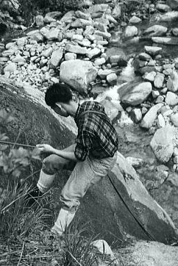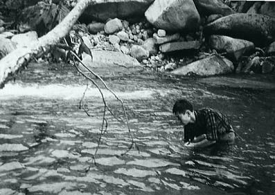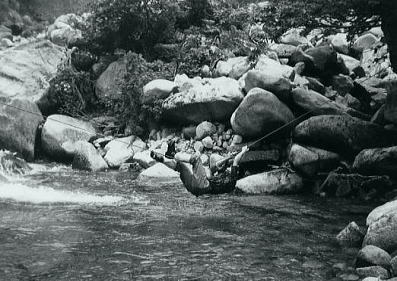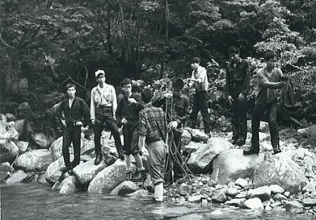 | 懸垂 午後.沢登りも考えたが渡渉を十二分にしたい関係からイイ沢出合.左岸で懸垂訓練をする。 高度10m強.傾斜65度内外.ピンは縦.横各1本を使用。ゼルベストと結んだ補助ザイルは確保用とし.縦のハーケン1本を使用した。 緩斜面でも初めての懸垂に一年生は緊張感が漂っている。それも懸垂を繰り返している内.余裕が現れ.馴染みだしている。 仕舞いには見ているだけで良いと言った女子まで.うずうきだし.島田がとうとう参加した。 渡渉訓練 ![]() |