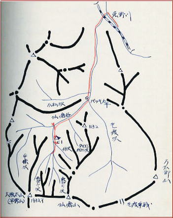 | 技術山行・・氷水の仙ノ倉谷.s42年(1967年)06月22〜24日 L松村進(3).m竹永靖正(4).西沢隆雄.斎藤吉男.中川保.大塚栄.新崎啓一.満尾.林幹夫.島田純江.古田和佳子(1) 技術山行 本年度の年間目標「我がクラブにおける特殊技術」の一環として.雪上訓練.ザイル作法による一般技術を修得すべく 3日間を費やし仙ノ倉谷に入渓した。 6月22日. 野= 6月23日.晴.午後一時小雨.土樽5:15一8:45河原9:35⇔9:10西ゼン出合.テ 幕営技術 12:00〜 懸垂 14:00〜16:00 渡渉 16:10〜18:10 消燈 24:00 仙ノ倉谷概念図 上越国境周辺全体地形図仙ノ倉谷 土樽から2本取って河原づたいに進み.20m程藪を漕ぎ.右岸の立派な平標新道にでる。 雪は殆どなさそうだ。谷筋にある事を祈り仙ノ倉谷に入った。 雪は全くなし。尾根取付き地点で.一年男子全員を連れ空身で西ゼンノ沢出合まで偵察する。案の定.雪は例年となく少ない。 西ゼン出合で見止められた雪のブロックも化石化し.訓練する程大きくなかった。 舐め落ちる西ゼンの第一ゴルジュ帯. 見える限りナメが続き.皿上に流れるような水流が如何にも涼しげに落ちていた。 設営 雪上訓練は取り止め.最も基礎的な技術からやり直す。時間を区切りテント設営技術を学ばせた。 一年生自ら幕営地を選び,整地し,幕営,釜造りを一時間半で完成しろと命ずるのみだった。 一年全員がナタ.ノコ.スコップに天幕を持ち動きだした。僕の助言は「沢での幕営を考えろ!」と言うだけに留める。 |