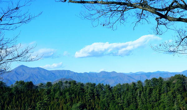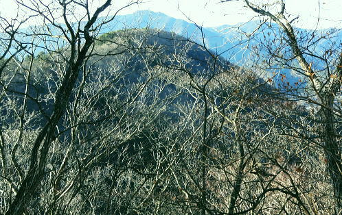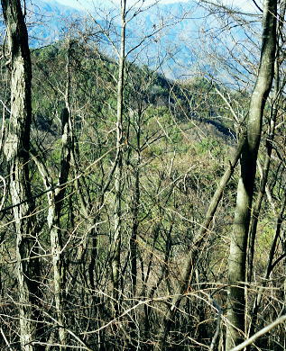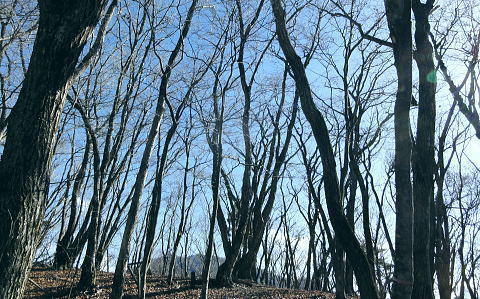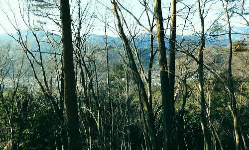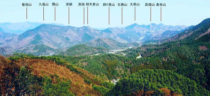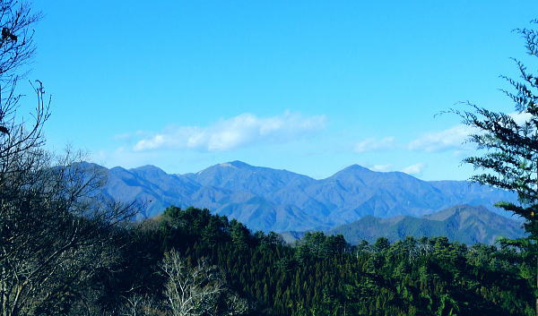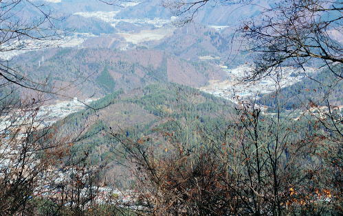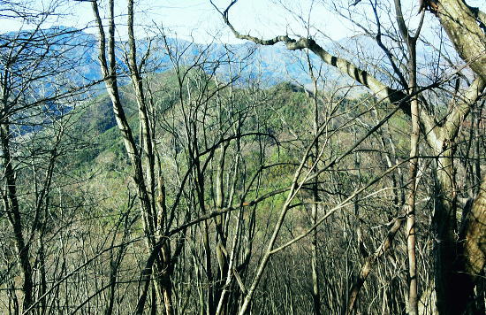 | ハガネ山から続く1本の長い尾根・・藪絡みの里山と平尾根の丘陵台地を結び綴る 文台山西峰でコナラの疎林に囲まれ昼食―北西尾根に入り.930n圏峰・尾崎山を経て.夕陽を浴びる鹿留川.古渡の集落へ 細野からハガケ山大沢右岸尾根 ハガケ山から文台山西峰へ 西峰から930n圏峰.尾崎山と古渡の集落・・富士急東桂 文台山西峰 ミズナラ.コナラ林と御正体山.12:42昼食 裸林の木洩れ日に御正体山を真向かいに望みながら,逆光を浴びて西峰の頂台地に腰を降ろしている。 今回はテルモスと久し振りコンロを持参した。気温が上がらないことを考慮し.行動中の飲水は贅沢に湯とし.昼食はラーメンを作る。 日清「ラ王」味噌味に沢山の野菜を盛り.ベーコンに生卵を加える。 足元を広げ.股の真ん中にコンロを点け.コッヘルから直接箸でほうばった。熱く体が温まると共に新たな活力が湧きだしている。 コナラ林に囲まれ,誰も居ない頂に1人.木洩れ日の日差しを浴びている。静かだ! 風の音もなく.まだ小鳥の囀りも聞こえない。 見上げる冬木の樹冠の先に蒼空が開かれている。裸林の枝々が蒼空に染まるよう綺麗なモザイクを描いている。 桂川都留市流域を望む 文台山西峰から見下ろす里.12:00手前が都留市の街並み.右中央が玉川.左上が中津森. 手前の尾根末端は二十六夜山から西に延びる尾根。 左手南北に延びる鉄塔は送電線山中線。 文台山西峰から尾崎山 12:00文台山西峰三角点大:45一13:15迷い戻った地点一西に道標を下り迷う40分.一14:18踏み跡分岐一14:26東伐採帯 一14:30(930m圏峰)一14:24尾崎山:34一15:50古渡の集落一15:56古渡橋一16:08国道一16:16富士急東桂駅. ハガネ〜分台山〜倉見山への稜線を展望・・玉川集落の高台より.2013.04 都留自然歩道は谷村東山稜に延びる延長12kmの探索路で九ケ所の登り口があり.何処からも軽ハイキングが楽しめられる。 今回は文台山で.朝方通った細野川沿いの「文台山登山口」からのコースと合わせ.尾崎山から古渡に至る都留自然歩道を歩むことにした。 尾根上の分岐 尾崎山へは北面の急峻な尾根を一気に下降することから始まっている。登山道と云うよりは踏み跡径. テープはここから頻繁に現れる。 細野からの分岐にでて初めて「登山道」のプレートを見ている。頂以外では初めて.1150m地点のここでこのブレートを見ていた。 踏み跡も確りし藪も少なくなった。露岩が現れた1080mで尾根は分かれるが.一時そのまま北東尾根を下ってしまっている。 頻繁にあったテープがなくなり.直ぐ可笑しいと気ずき登り返した。分岐にはUターンする2つのブレートが間近にあったが2つの道標の間隔は 間近に位置し縦.横に方向をZ字に変え.見ずらく立てられていた。 気が付いていたが文台山を発ったことで先が安易になり.調子に乗ってしまっている。雑に見た道標の位置に意味があった。 北東尾根と分かれる地点に1枚のプレートがあり.北東に少し下った所で向きを変えるプレートがあった。 改めて先を探るとテープが点々と幾らか戻る気持ちで付けられていた。少し戻り気味にUターンし.北西の尾根に乗る。 尾崎山と930m圏峰 背は三ッ峠〜清八山・・左下が東桂.13:18930m圏峰 930m圏峰から浅い尾根を見付ける.13:56テープ道を失い1本 急斜面の下りが続く。途中で右手に針金が固定している所にでる。 ここは右にトラバースし,左に折り返して露岩帯を過ぎる所.真っ直ぐ下り時間をロスする。そこから少し左側を30mほど下っていた。 改めて1本取り.周りを見渡すと,歩む靴先は谷へと落ちている。対岸正面には尾崎山と930m圏峰が望まれていた。 ここから右手に真近に延びる尾根は近くにあるにも拘らず.冬木の枝茂みが多く重なり.確認せず下ってしまっていた。 遠く.谷を隔てた向かいの930m圏峰から南東に連なる浅い尾根の方が.こちらと結ばれているよう思え.気にもしていなかった。 この下は常緑の植林帯が面をなし.地図と磁石を見返すこと数回. 決断するまで長い時間を要している。 最後に見たテープまで戻ることにした。そして東側に幾らかの盛り上がりを見付け.そこを目指し斜下する。そして再び北東に進む踏み跡を見出した。 小野への分岐 正面先が小野への作業道.14:18左側のマークからが930m圏峰への尾根 鹿害用の透明なテープが檜の幹に巻きつけてある樹林帯を緩やかに下ると平尾根になり.御正体山若宮神社から小野へ下る 仕事道との分岐にでる。迷い易く.地形図には910m地点から北東へ小野の集落にでる破線路が記されていた。 予定のルートに戻ると幾つものテープ類があった。破線路(地形図)との分岐には横枝が添えてある。 直角に左に折れ.尾崎山のコースにへ。すると895m点で「登山道」のプレートを見て.右に幼木が育つ.展望の素晴らしい伐採跡地にでた。 伐採地から東北面の展望・・道志二十六夜山西尾根と中ノ沢ノ頭 ![]() 大菩薩連峰から権現山稜. 小さな尖っ突きの権現山.右手前が表道志の高指. 鈴懸峠越えをして大桑山.高畑山.倉岳山・・14:29 手前が道志支稜の高取山から連なり.サイマル山から朝日