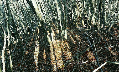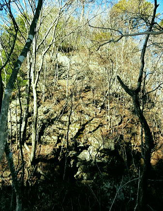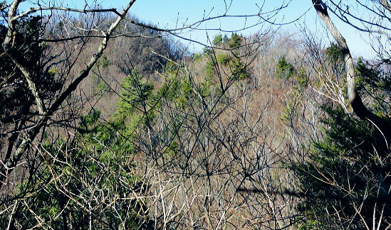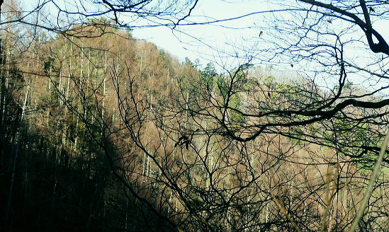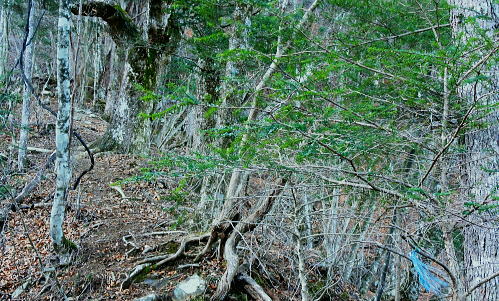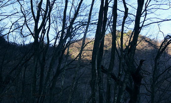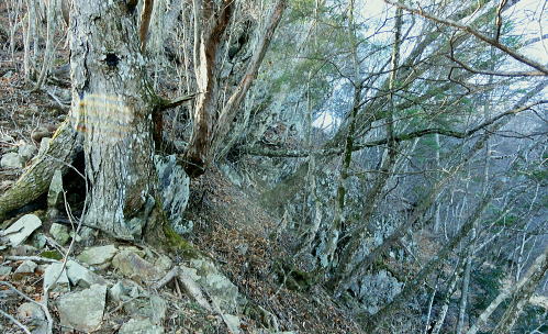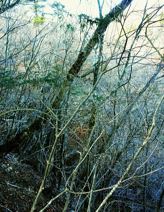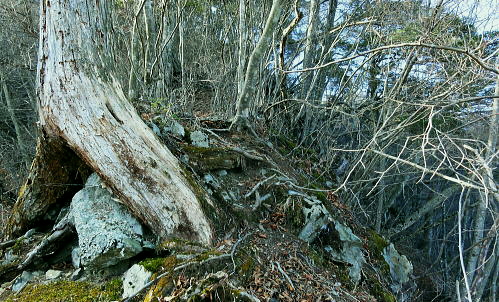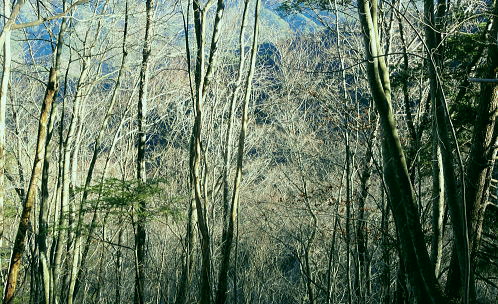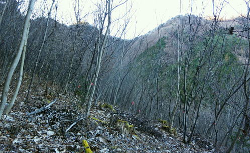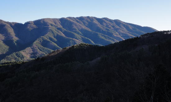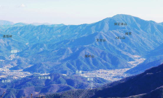 | 過って鹿留山北尾根から望んだ山・ハガケ山・・道志山塊Top 道志一部と丹沢山塊略図 御正体山の北西支稜・・鋸刃・ハガネの岩稜から文台山北西尾根・尾崎山 細野から大沢右岸尾根を越えての北上しハガケ山―鋸刃から文台山北西尾根を経て930m圏峰・尾崎山を越え古渡へ 2012年12月20日.単独 細野からハカゲ山大沢右岸尾根 ハガケ山から文台山西峰 西峰から930m圏峰.尾崎山と古渡の集落・・富士急東桂 ハガケ山? 2010年04月の半ば.富士急谷村町駅周辺の里は桜が満開に咲き.散り始めていた。その中まだ冬木に覆われた鹿留山の北支尾根を目指していた。 その折北尾根の大きな岩壁を避けた西群馬幹線の224号鉄塔基部からは枝絡む落葉松林の樹間を透し.振り返る形で対岸を眺めていた。 綺麗な三角錐を描くハガケ山を朧ながら望んでいる。鹿留川を隔て周りより幾らか低いが起伏激しく聳える山稜が. はっきりせぬが枝木の絡みの中から見届けられた。ハガケ山だろう。脳裏に焼き付けられている。 対岸は霞み連なる漠然たる概念しか分からぬものの奇峰があり.御正体山から南方に延びる支稜線上にあるようだった。 覗き込んだ位置か地形図を読むが.地形の概念は全く分からなかった。当時としては漠然とし過ぎる風景だったが何故か. 近い将来に登らなければならぬと思っていた。 この尾根はその4年前にやはり幼馴染と共に御正体山をヤラ尾根から詰めた折.山頂の手前で見下ろした急激に落ち込む劇斜面を持つ支尾根。 ハカゲ山がある尾根と知り.当時の日記には御正体山の北面の気になる尾根があると記している。 又昨年は本社ケ丸から尾根の全貌を見詰めてもいた。下の写真.ハカゲ山と正確に確認し出向いてみた。・・余談だが共に大晦日の山行. 桂川本流と菅野川に挟まれた山域 本社ケ丸からの展望・・2011.12.30/13:25桂川沿いは又.大月から川口湖へと富士急行線の沿線区間. 「中央線の山を歩く」藤井寿夫著によると書き出しで富士急の線路から見た風景として.「富士急行線は谷村町駅を過ぎてまもない車窓左手に 姿かたちのよい双耳の峰が近づく。これが大野山1198.8m。やや離れて.尾崎山967.8mは忠実な下僕のようにうずくまっている。」とある。 本社ケ丸からの写真からも同じように見下ろされている。小陣まりした山域で菅野川を挟んだ向かい合う不遇な山。 目指すハガネ山 過って鹿留山の北支尾根に建つ西群馬幹線244号鉄塔尾根基部からハガケ山を眺め確信するも朧にしか見えずに鹿留山を詰めていた。 今回の山行は反対側のハガネ山から244号鉄塔尾根を眺めることを第一目的とした。 御正体山から北西に延びる北支稜に入る。細野からハガゲ山北面の大沢に入り.大沢右岸尾根からハガゲ山に立つ。 写真の真下の送電線.西群馬幹線は三ッ峠山東山腹からこの鉄塔を通り.鹿溜山東山腹を回り込み西丹沢に抜けている。 途中.ハガネ山を詰め終えた付近で写真の右正面(枠外)に鹿留山が仰がれ.更にそこから三ッ峠山に連なる鉄塔群を北側に望む。 鋸刃・ハガネ ハガゲ山を擁する尾根は御正体山の峰宮跡から北西に派生する北西支稜上にあり.鋸刃・ハガケ山・文台山・尾崎山を起こし. 桂川の支流管野川と鹿留川を分け没している。低山の割に起伏が激しく.鹿留の分岐1460m地点からハゲケ山の間は鋸刃と呼ばれていた。 「甲斐國志」には御正体山池ノ平分岐からハガケ山の間に「いくつもの鋸のような尖峰が並び.それを鋸刃という」と冒険心をそそり, 地形図を読む以上に.この小さな岩稜は複雑極まる地形を創っていた。 尾根末端近くの930m圏峰からは2つの尾根を派生させている。北東に長く延びる尾根は桂川本流と管野川とを分け,出合に没している。 又930m圏峰から尾崎山を越え北西に延びる尾根は鹿留川出合に没し.下山は古渡地区に下り富士急東桂駅にでた。 過っては尾根下半に都留自然歩道が綴られ.十日市場駅の方がハイカーの利用が多かったとのこと。 12月も中旬を過ぎ.日が最も短くなる。明後日は冬至 細野から大沢沿いに入り.ハガケ山の東コブから北方に落ちる名もない大沢右岸の尾根を直登した。 大沢右岸尾根から鋸刃に立ち.過って正面に望んだ鹿留山の北面の山肌を望み.山腹を綴る各支尾根を横切る送電線を眺めていた。 陽に煌く鉄塔群が鹿留川を隔て.深い谷間に建ち.はっきり見下ろされている。その中に244号鉄塔が建ち.自己満足だけの世界に入っている。 ハガゲ山からは文台山を擁する北西尾根をそのまま乗り.930m圏峰から尾崎山を登り返し.古渡の集落から東桂にでることにした。 谷村町駅からは徒歩1時間半のアプローチ.12月に入り路線バスは運休している。タクシーに乗るか? 入山直前までアプローチを考えていた。 鋸刃支尾根 早朝の閑散とした細野の集落.7:2師走のひっそりした朝方. 細野文台山登山口を右手に分け.正面に鋸刃尾根を見上げながら大沢の集落をタクシーで抜けている。 正面に聳える稜の左が大沢右岸尾根の頭.その右は小さな岩峰.中央が北尾根を持つ1320m圏コブ.その右に
