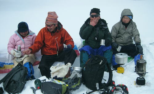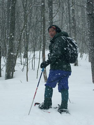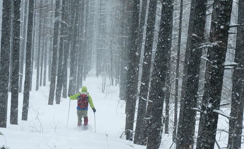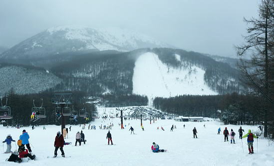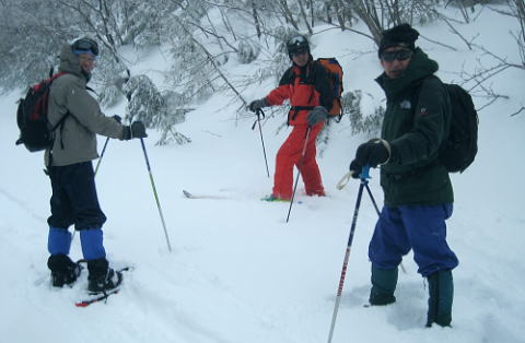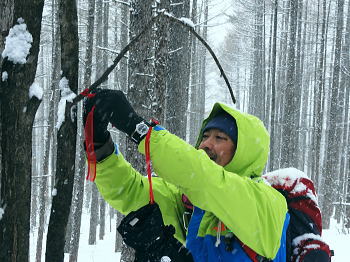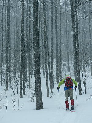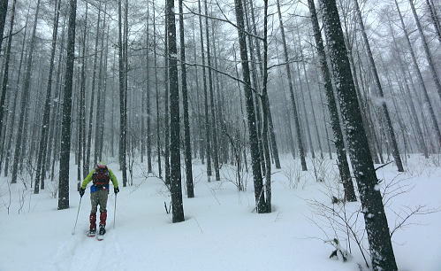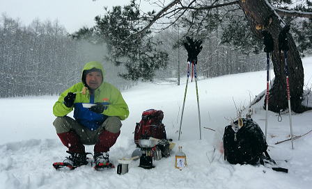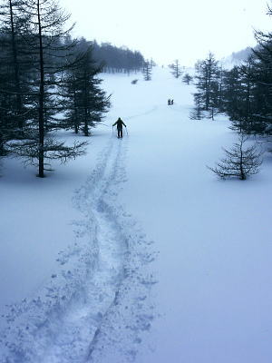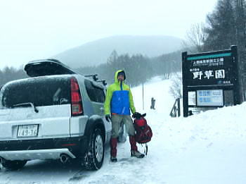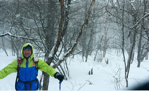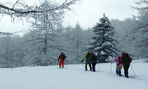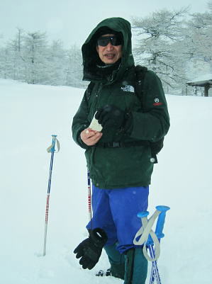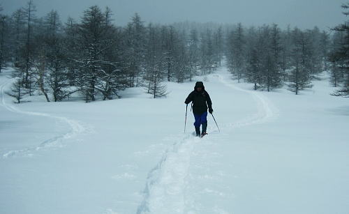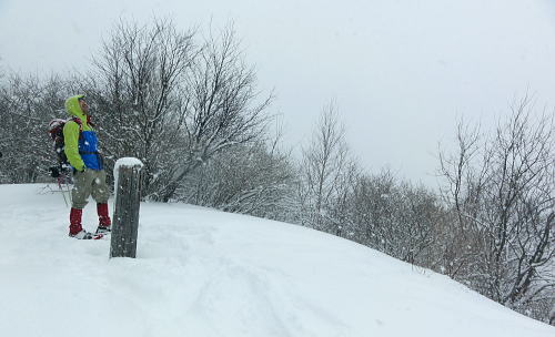| 上信越高原鹿沢高原. 村上山と池ノ平湿原・・上信越高原国立公園Top 春季OB親睦会U. 南岸低気圧と冬型の気象配置を真面に受け.連日降雪に見舞われる 北軽と鹿沢を起点にスノーシュで上信越高原湯ノ丸周辺の村上山と高峰高原池ノ平湿原をピストンする 2013年02月15〜17日 2.15.休暇村「鹿沢高原」から村上山ピストン・・北軽 2.16.地蔵峠から池ノ平湿原ピストン・・休暇村「鹿沢高原」 親睦会には見城.黒岩.滝島.鈴木.松村.田島親子.立松.石戸.発知.吉武.剣持.廣田.加波.河原.児玉.鈴木.高橋の18名が参加。 昨年は10名だったことを思うと好評で8名増え盛大に行われた。幹事を引き受けてくれた石戸君には感謝に堪えない。 今年も昨年に続き春季OB親睦会が鹿沢温泉の休暇村「鹿沢高原」で催され参加する。 一足先に東京を発ち.前日は滝島先輩と村上山を地蔵峠からスノーシュでピストン。翌16日は5名で池ノ平湿原へスノーシュツァーにでる。 ゲレンデスキーは11名.温泉のみの参加は2名. 昨年の天候は冬型気象がどっかり居座り.日本海から押し寄せる雪雲と表日本に広がる快晴の接線が湯ノ丸山の頭上に競り合っていた。 雪舞う天候か.好天か.どちらに転がるか分からぬ境の下.今年は南岸低気圧と冬型の気象配置の両方の影響を受けて.連日粉雪に見舞われた。 北軽井沢でも例年より多い積雪に覆われている。車は別荘まで入れず.壺足で雪径を作るはめになった。 15日の気象配置は南岸低気圧の烈風が吹き抜け.湯ノ丸では一日中雪が舞い.翌16日は日本海の雪雲に被われ.山は更に粉雪が舞っている。 東京では雨となり.16日7時発表では鹿沢スノーエリア積雪170cm.湯ノ丸高原140cm. 2月15日(金) jr御徒町6:12=6:30池袋.東上線急行:38=7:12若葉で滝島.鈴木両氏と合流=鶴ケ島IC=9:20小諸IC =9:50地蔵峠.見城.黒岩両氏と合流. パッキング 荷は昨年と同じ量になる。シュラフに電気毛布.冬用衣類に着替え.冬山道具に嗜好品を加えるとザック50は満杯に。 サブザックは外側に付けた。目方はないが量がかさむ。今回はストックは借用し.持参しなかっただけ手元は楽だった。 村上山 休暇村「鹿沢高原」P裏が登山口.10:302月15日(金)小雪. 休暇村から村上山ピストン L松村m滝島 9:50地蔵峠=休暇村「鹿沢高原」登山口10:30⇔12:00アンテナ一12:25村上山 一12:39東屋一13:15休暇村「鹿沢高原」14:20=10:40新鹿沢温泉「つちや」16:00=16:35北軽別荘. 村上山は約30万年前の噴火により誕生した火山で溶岩ドームの形を成し.見る角度によっては鹿の角のよう見えることから 「角欠山」とも呼ばれている。村上山は湯尻川出合近くの右岸沿いに聳え.対峙して湯ノ丸山から北側に延びる尾根に鍋蓋山が聳えていた。 登山口は信州側の信越道から東御嬬恋線に乗り.地蔵峠から上州側に下りる。旧鹿沢温泉と新鹿沢温泉とのほぼ中間に位置する 明日の宿.休暇村「鹿沢高原」にでる。その裏手から取付いた。今日は北軽泊まりだが.ここ取付き地点は明日宿る館前。 緩やかで大福の形をなす.大方落葉松林に覆われた村上山が裏山になる。上部は大きな五葉松の林層が含まれているようだ。 登山口は落葉松の植林帯入山 地蔵峠湯ノ丸でゲレンデスキーをする同期鈴木を降ろし.国道を下り村上山の取付きのある「鹿沢高原」の宿舎左裏方にでる。 宿舎前の駐車場からスノーシュを履き.道標手前の登り易いトレースから入山した。 直ぐ奥で湯尻川右岸沿いにある湯尻川遊歩道を横切り.右手に折れれば「たまだれの滝」を通り旧鹿沢温泉にでられる。 左手は下流の新鹿沢温泉に繋がるが冬期の路線バスはない。遊歩道はやや幅広い山径. 雪原化した登山道と共に埋まりトレースはなかった。 馬鹿丁寧なほど道標が付けられ.曲がるコースには何処にも道標を見ている。無雪期になれば確りした登山道が綴られているのだろう。 雪珠舞う落葉松林の森.11:00少し先でボランテァの為の立派な屋敷のような小屋があり.その脇に「列状間伐のモデル林」と大きな看板板があった。 小沢の右岸沿いから左へ大きく巻き込み緩斜面をくねりながら登ってゆく。周りは一面落葉松林に覆われた世界。 裾は宣伝文句の如く丁寧に間伐された美しい人工林。下草は雪に埋られ.間伐された冬木林の美しさを強調していた。 その間を縫う登山道を軽くラッセルする。隠れた踏み跡を少しでも外すとスノーシュを付けていても.やはり潜りは深かった。 ![]() 昔の吾妻を想い赤布の目印を付ける 小雪が舞う樹林帯.風は気にならぬ程度。大岩にぶち当たり.左手に巻き込むと尾根らしくなる。 先輩はマーキング用に昔を思ってか赤い布切れを3枚持参した。点々とマークがある中.少し見難い所を見付けては. 各々が落葉松の枝先に1枚ずつ.赤布を結び付ける。私は頂にも記念にと1枚添えてきた。 マーキング マーキングは山の違いではなくルートの選び方.山の技術,経験の違いにより.その基準は大きく左右される。 道標の補助となるマーキングは雪山と無雪期とでは異にする所も多い。風雪に遇えば尚更好天で見えるマーキングでも.