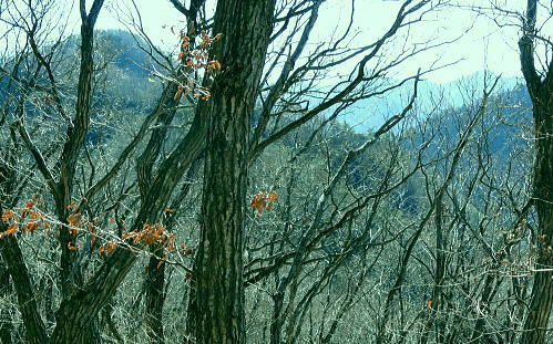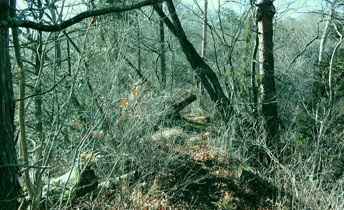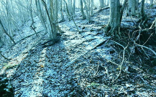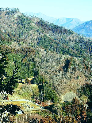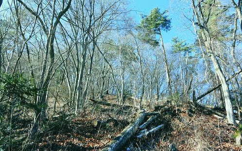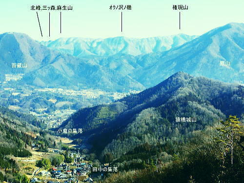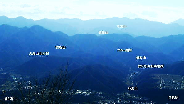 | 小沢川を遡り幡野入口から前道志北面の2つの支尾根と幡野山.鈴ケ尾山.大桑山に立つ。 ・・前道志山地Top 鈴ケ尾山北西尾根から桑山北東尾根(西寄り尾根)1から津成へ下る。最後のご褒美は山を下りて桂川曙橋からの展望 jr猿橋から幡野山・640m圏峰・730m圏峰・鈴ケ尾山北西尾根を詰め.突坂山・鈴懸峠から大桑山北尾根を下降.津成から太田.鳥沢 2013年03月05日.松村 jr猿橋から幡野入口にでて鈴ケ尾山北西尾根を詰め大桑山・・旧仙元神社 大桑山北尾根(西側)から津成.太田に下り曙橋とjr鳥沢 表道志西部・・大桑山から鈴ケ尾山北西尾根 百蔵山々頂より.2008.12.21/12:08小沢川二俣.幡野沢と幡野川を分水する尾根 前道志 道志山地には昨年の同じ頃に初めて入山。前道志の中央北面の尾根. 矢平岳北西尾根と倉岳山北東尾根を梁川から周回した。 jr猿橋駅から鳥沢駅に掛けての南面の前道志には九鬼山・大桑山・高畑山の主尾根から僅かに北に外れた所に寂峰の鈴ケ尾山が聳えている。 今回はその西側に連なる鈴ケ尾山北西尾根を猿橋から綴り.小沢川を遡り.幡野沢の出合から取付いている。 そして大桑山北面に没する北尾根の1つを選び.jr鳥沢駅への下山のアプローチには新桂川橋梁を渡る左の街道を選んでいた。 4年ほど前だったと思うが月刊誌「山と渓谷」の藪山特集で.鈴ケ尾山北西尾根の記事が小さく紹介されていた。 その1/3ページほどの文章がPCに残されていた。改めて見付け.入山はこの北西尾根を選び.大桑山の3本ある北支尾根の西寄りを下ることにした。 北信のRHC親睦会から戻り.真近な道志の山並みを歩む。ただ.まだ漠然とし過ぎて分からぬことが多くあり. 山域を広げ知ろうと4月に掛け三回に分け.綴ることにした。前道志から秋山二六夜山.そして前道志から猿焼山西尾根方面へと。 先ずは前衛として前道志の大桑山を起点に北面の支尾根を選んでいる。 2回目は中道志と呼べるのか? 穴路峠と寺下峠挟む形で秋山二十六夜山を越える。 3回目は前道志の高畑山を越え.朝日川左俣大平沢流域から桂川へ。猿焼山北尾根から西尾根を下る積りでいる。 ただ西尾根に掛かる時間帯が分からず。下調べを含め.行程は現地で決めると云う.雑さが残されているが.勧めてみることにした。 大同山と百蔵山 jr猿橋駅舎南口の網柵より.7:28800.1m峰.大同山.百蔵山.コタラ山 2008年の師走にこの写真の右.名勝猿橋から桂川左岸に回り込み.左手の葛野川橋下から百蔵山を往復している。 3月05日(火).快晴 jr御徒町¥1450. 5:10=5:14神田:24=6:40高尾:42=7:15猿橋. jr猿橋駅からこの数年.葛野川流域の山々を尋ね.幾度となく下車・乗車を繰り変えしている。 ただ今まではどの山行も猿橋駅北口が起点で南口からの乗降はなく.今回が初めてだった。駅前の高みからは葛野川流域が見下ろされていた。 南口正面の急斜面にはjr東日本が分譲した「パラトラびゅう桂台」を結ぶモノレール軌道があり見られた。日本初の磁気ベルト式自動運転モノレール 又数年前に百蔵山に登り.頂からここの広大な分譲台地を見下ろしていた。・・jr猿橋駅と分譲地 南大菩薩連嶺の東面源流の山々 中央高速道.葛野川橋越え猿橋より葛野川出合. 中央がセーメーバン南東尾根 セーメーバンから南方に延び.笹平から左側の岩殿山に落ちる尾根 小沢川沿いに遡り幡野沢出合へ 7:15猿橋駅南口一7:57小沢川田畑橋一8:00鈴ケ尾山北西尾根取付き. 今朝.猿橋駅南口に下車したのはハイカーどころか.乗客は私独りだった。早速駅前を左に折れ.大椿寺を右に見ると道路はY字に二又に分かれ下っている。 左手の県道は桂川の右岸沿いを並行して走る旧道の梁川猿橋線。下山した折.藤崎でこの街道に再び出合うことになる。 左のフェンス側からは駅前沿線に続く甲州街道沿いの街並みが見下ろされた。天空は雲1つない紺碧の蒼空が今日一日の好天を約束させていた。 朝日を浴び明るく照り付ける百蔵山・扇山の山肌は南面を向き.まだ幾らか朝の赤味をい抱き.大きな裾野では桂川の河川丘陵に広く開かれる。 左後方は葛野川の河口を渡る中央高速道の葛野川鉄橋.ここも又赤く目つ橋。その上を広く取り囲むよう南大菩薩の楢ノ木尾根の山並みが ひときは大きく望まれた。その下に前衛として構えているのがセイメイバンの尾根.裾野は左右に広がりを見せ.前衛としてよい絵を描いていた。 扇山 小沢川の高みから振り返す裾の富浜地区とjr上-大線鉄塔群・・鞍部は宮谷分岐. その奥は現在呼ばれているコタラ山849mの頭 今年初めての山行が正面に見上げる扇山だった。扇山裏側の浅川から曽倉山西尾根入り.扇山からは北側の地獄沢の枝尾根を下り出合に戻っている。 北面はまだ冷気が漂う山陰の残雪に覆われ寒かったが.陽気に恵まれでば今日のよう晴れ渡りすこぶるよかった。扇沢を振り替えつつ登っている。 頂から百蔵山への間の頂稜には宮谷や山谷地区から幾つもの峠路が作られている。古道と旧峠は浅川を経て東は表街道の上野原へ。 西方は葛野川沿いから上流は秩父へ.下流は甲府への古道が結