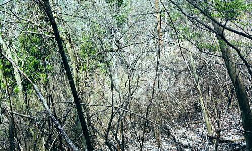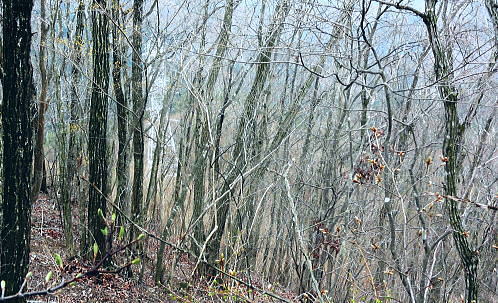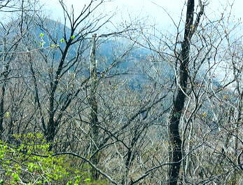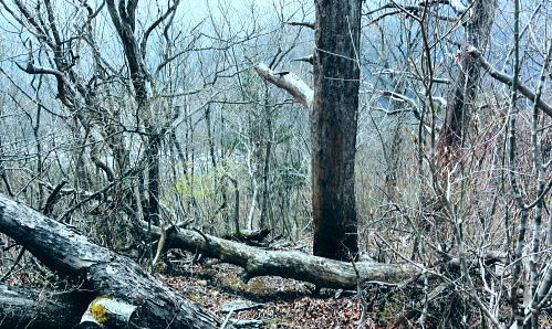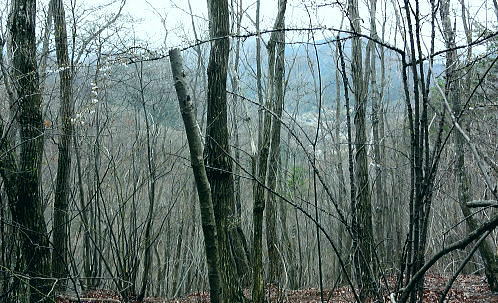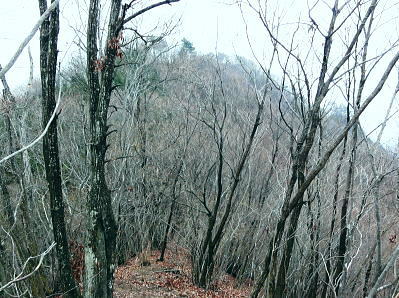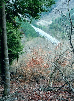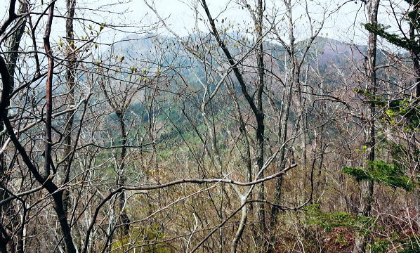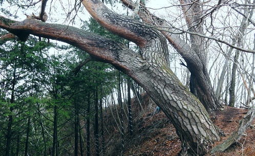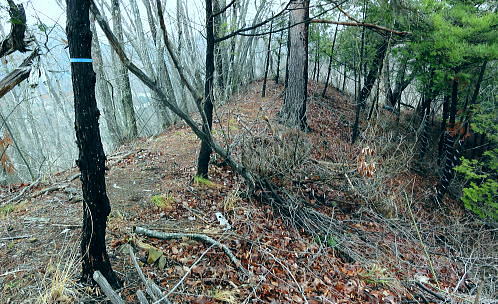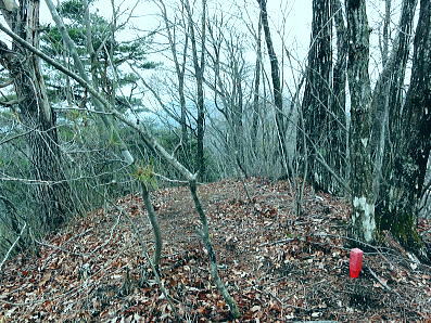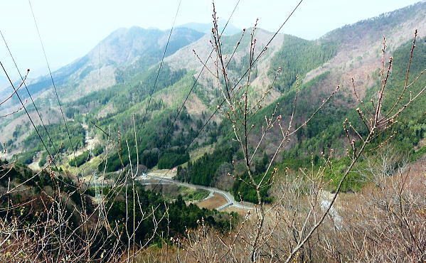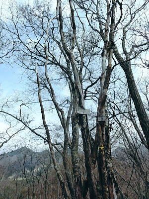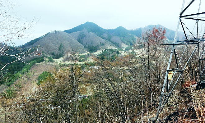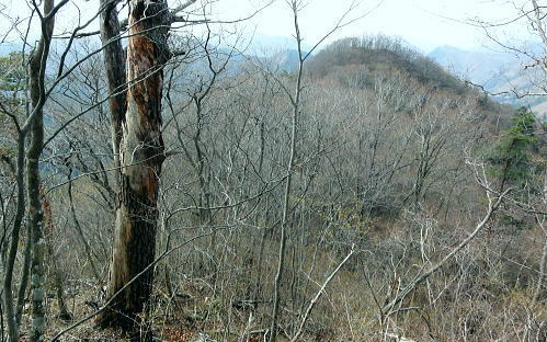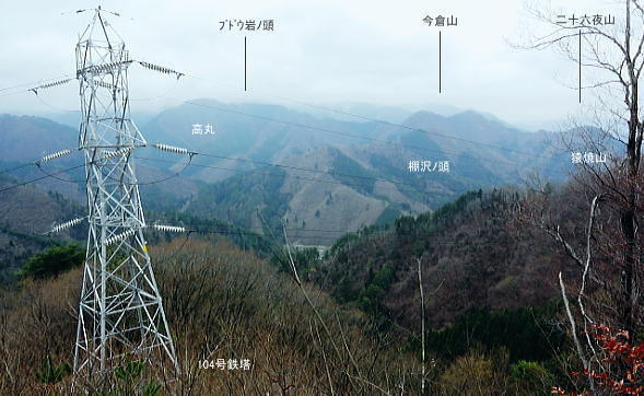 メーンから一歩外れた高取山稜・・朝日川左俣の大平川左岸流域 大ダビ山・高岩から高取山稜に乗る都留線鉄塔尾根を綴る―高取山・サイマル山を越え.大平川出合の朝日馬場 高畑山北尾根を越え.檜山峠から高岩へ 大平沢ノ頭から高取山稜.サイマル山を越え朝日馬場・・鉄塔尾根とキジ 猿焼山北・西尾根から日陰山を経て引与田より直接.富士急赤坂 ブリティッシュガーデンクラブ 高取山山稜に入り右手に望むゴルフクラブ.9:46大平沢ノ頭から高取山.サイマル山越え朝日馬場 9:27大平沢ノ頭一9:48手前のコブ一10:04二又の松一10:44高取山一11:03大平峠.102号鉄塔一11:22サイマル山 一10:40(98号鉄塔)一11:45(97号鉄塔)一11:50大平川小橋一11:59石船神社. 高取山稜 今回は前道志尾根を横ぎり.中核をなす高取山稜に入り.奥山の山並から今までとは違った観点から周りが見渡せている。 この尾根の末端が朝日馬場に没し.大平川と大旅川を隔てる分水嶺のをなす朝日川流域に入る。 更に朝日馬場からの後半は対岸の城ケ丸北尾根に取付き.詰めれば長い城ケ丸西尾根に乗っている。 高岩 幹に赤テープの巻かれたマーキングがある高岩が高取山稜の取付きになり.雛鶴峠へ南東に下る主尾根を分け.北西の踏み跡に入り込む。 高取山の鞍部まで踏み跡は薄く.藪は少いが煩い。下り始めると北側にゴルフ場の各コースが梢越えにはっきり見下ろされていた。 東側から回り込んだ北側のガーデンクラブからプレイヤーの声がよく聞こえるのは風下の尾根に居る影響だろうか? 漸くしてプレイヤーの会話と離れたものの,今度は朝日川側のリニア実験線の工事現場からの雑音が耳に付く。 発破の破裂音に工作機の騒音.時にはハンマーの叩く音さえ.真近に聞こえていた。鈍い音の間には鋭い金属音も響いている。 リズムに乗り叩いているも.稀に響く外れた音は甲高い? 林層の境は尾根伝いに焼室山手前のピーク.9:48 手前のピーク.焼室山804m 手前鞍部より.9:51鞍部前後から伐採帯が広がり.踏み跡も明瞭になり.樹林帯は一度右側に移り.雑木帯になると小コブにでている。赤抗プラが尾根筋に 点々と設置されていた。細い立木群に下藪茂る所では焼室山が望まれる。確りした踏み跡で迷う心配はなく.程なく頂に立った。 ![]() 尾根を塞ぐ2本の赤松.10:03 道形の確りした巡視路の道再び左側の谷間は植林に被われ.2本の赤松の大木が痩せ尾根を塞いでいた。 分岐から小さなコブを2つ越すと綴っていた踏み跡は尾根の左側に外れ.南西へ尾根伝いに歩むと 再びはっきりした造形の小尾根が延びている。この先は送電線都留線104号鉄塔への巡視路になっていた。 この104号鉄塔からは巡視路を綴る。再び尾根に戻ると巡視路を辿ることになり.明確で赤テープのマーキングも多くなった。 ただ尾根から離れた鉄塔の分岐や高取山.サイマル山は巡視路から外れる為.注意が必要だった。104号鉄塔基部まで出向き.尾根筋に戻っている。 都留線104号鉄塔 ここから主尾根上に巡視路が延びる.10:10日陰舟北西尾根.高丸(岩戸ノ峰)北尾根.菜畑山.ブドウ岩ノ頭北東尾根.今倉山北尾根.二十六夜山・・中央が猿焼山東尾根 巡視路は尾根筋から分かれ.このまま104号鉄塔基部まで続いて下りている。 鉄塔裏側が大旅川.県道.四日市場上野原線が並行して走り.南面に広がりを見せるのが支流の大旅沢流域。 送電線の鉄塔尾根 都留線は高岩の直ぐ南の雛鶴峠の南側に建つ109号鉄塔から秋山川の谷間を下って橋本変電所と結ばれている。 先月秋山二十六夜山から下山した折.尾崎で都留線(鉄塔表示12号鉄塔)の鉄塔脇を通っていた。 又若番鉄塔はこの104号鉄塔からサイマル山へ連なる尾根を点々と綴り.鉄塔尾根から更に朝日川沿いに下りている。 そして九鬼山の南麓を綴り.猿焼山西尾根末端を横断して.大幡川を遡り.笹子の新山梨変電所と結ばれている。 赤坂駅付近で見上げた西尾根末端の71号鉄塔が今回最後に見る鉄塔になった。 都留線は大正時代に建設された154KV系の幹線送電線.新山梨変電所から橋本変電所間を結ぶ鉄塔265基.25〜30mを持つ。 都留線は甲信幹線から分かれた送電線で.今でも一部で建て替え工事が行われ.複合され鉄塔番号の大きさ等.分からぬのも多い。 それ故鉄塔番号は新たに改名されてもいる。尾崎では17号を付け.71号鉄塔はナンバーが消されてもいた。 ・・細野山脇の伐採地から見た二十六夜山南麓の都留線老番鉄塔群 冬木林を抜け13号鉄塔へ 尾根筋に戻り.10:15巡視路が尾根から外れると踏み跡径になる リニア実験線の延伸工事現場.車両基地付近と雛鶴神社がある.10:11白い細長い巨大な建物は朝日曽雌のリニア車両基地。四日市場上野原線を隔てた対岸に雛鶴神社が建立されている。 左手は新雛鶴トンネルを潜れば秋山へ。右手に県道を綴れば富士急行.禾生にでる。又広い河段丘稜は大旅川になる。 リニアモーターカー 雛鶴峠の北側を抜けてきたリニアモーターカー線はこの先手前.高岩から西へサイマル山へ延びる尾根沿いを潜り. 工事が点々と行われていた。九鬼山,高川山付